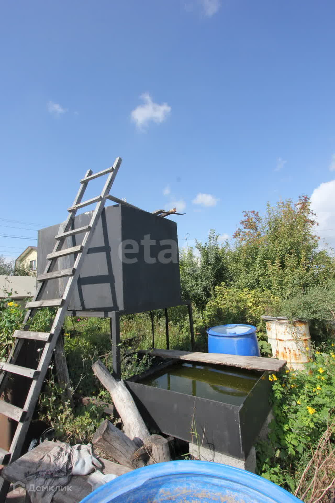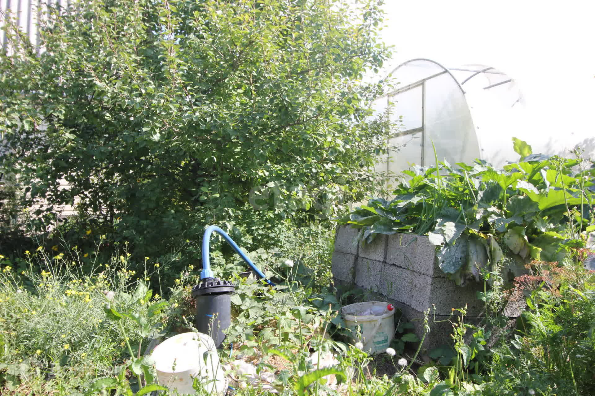 Для организации полива установлены 2 вместительных металлических бака и несколько полиэтиленовых бочек. Вода подаётся 3 раза в неделю по расписанию. Также на участке есть скважина с питьевой водой, уличный туалет.