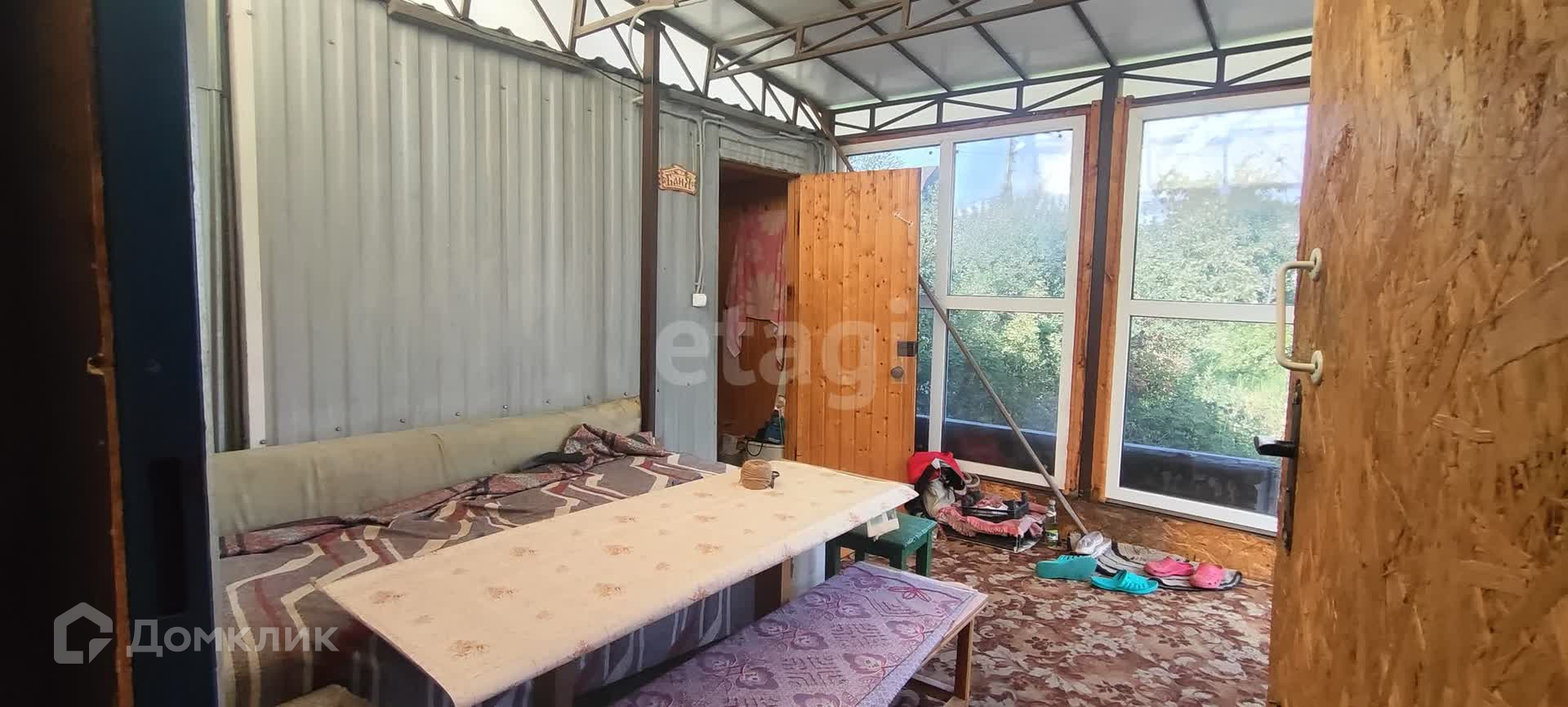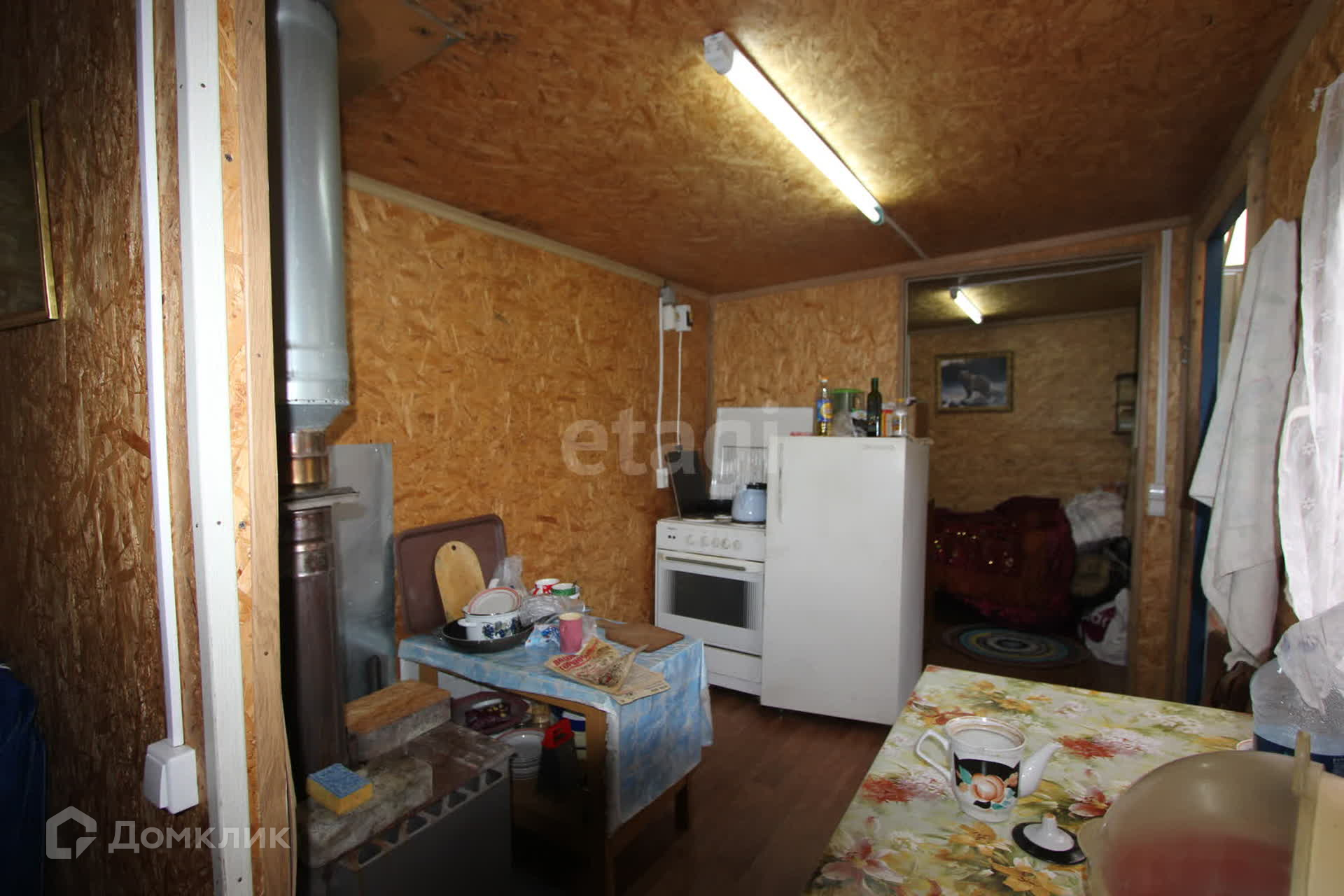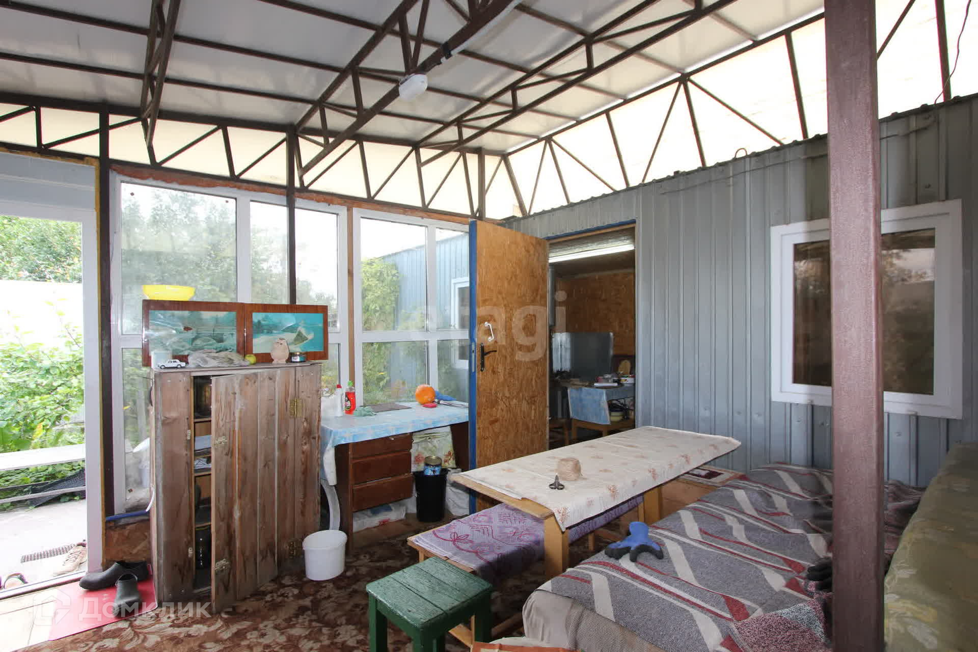 На Даче есть дом-бытовка 20 кв.м. с двумя раздельными спальнями по краям и кухонной зоной в центре. Отопление печное. Электричество заведено. В доме можно проживать весь дачный сезон с весны до осени.