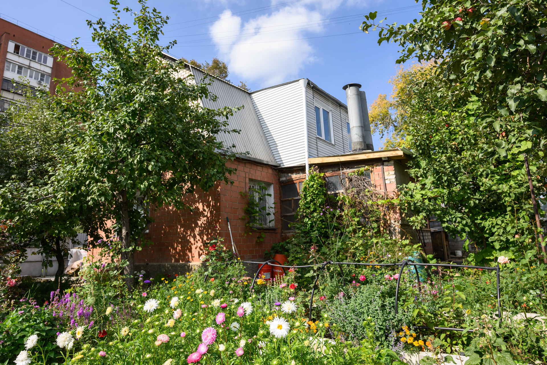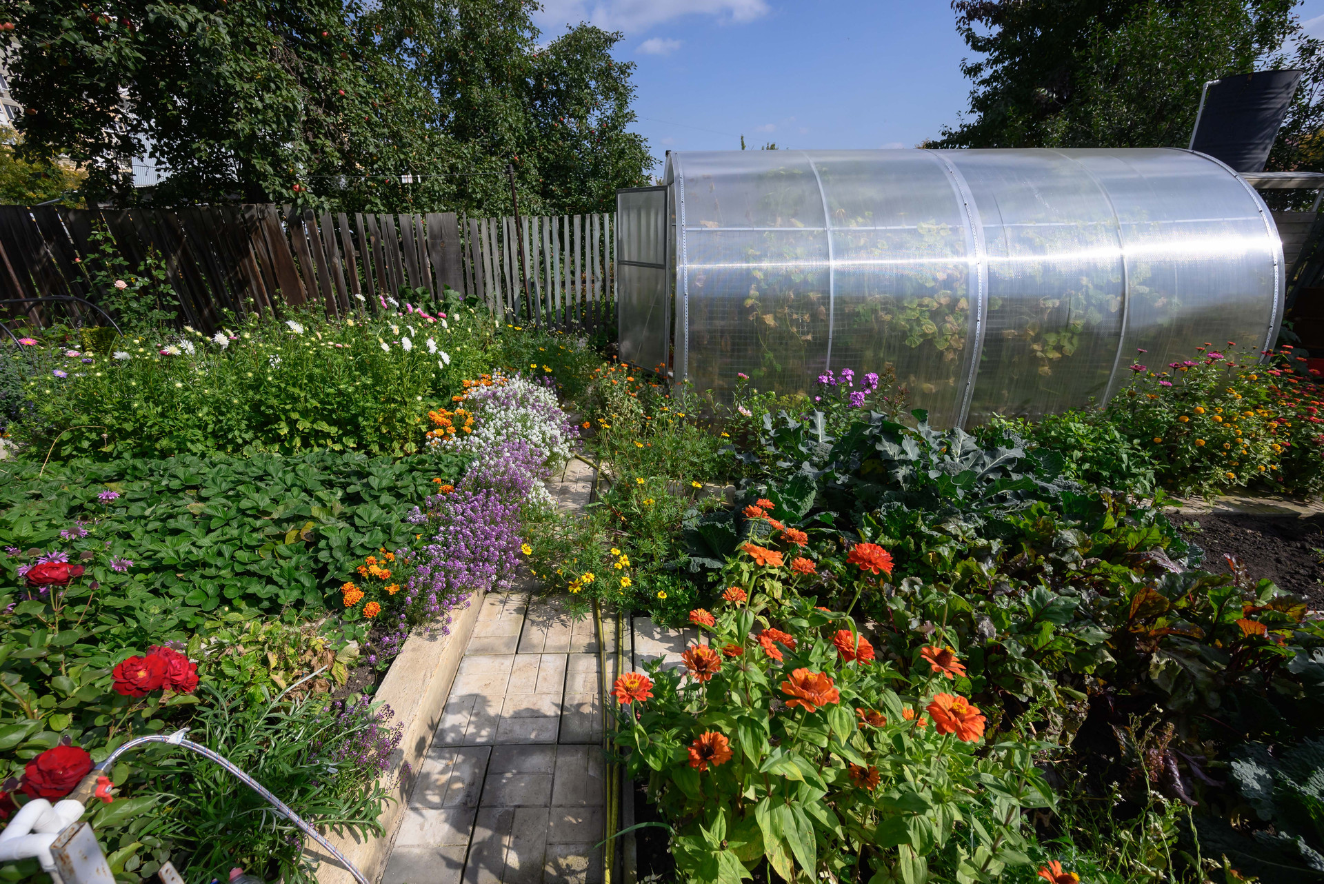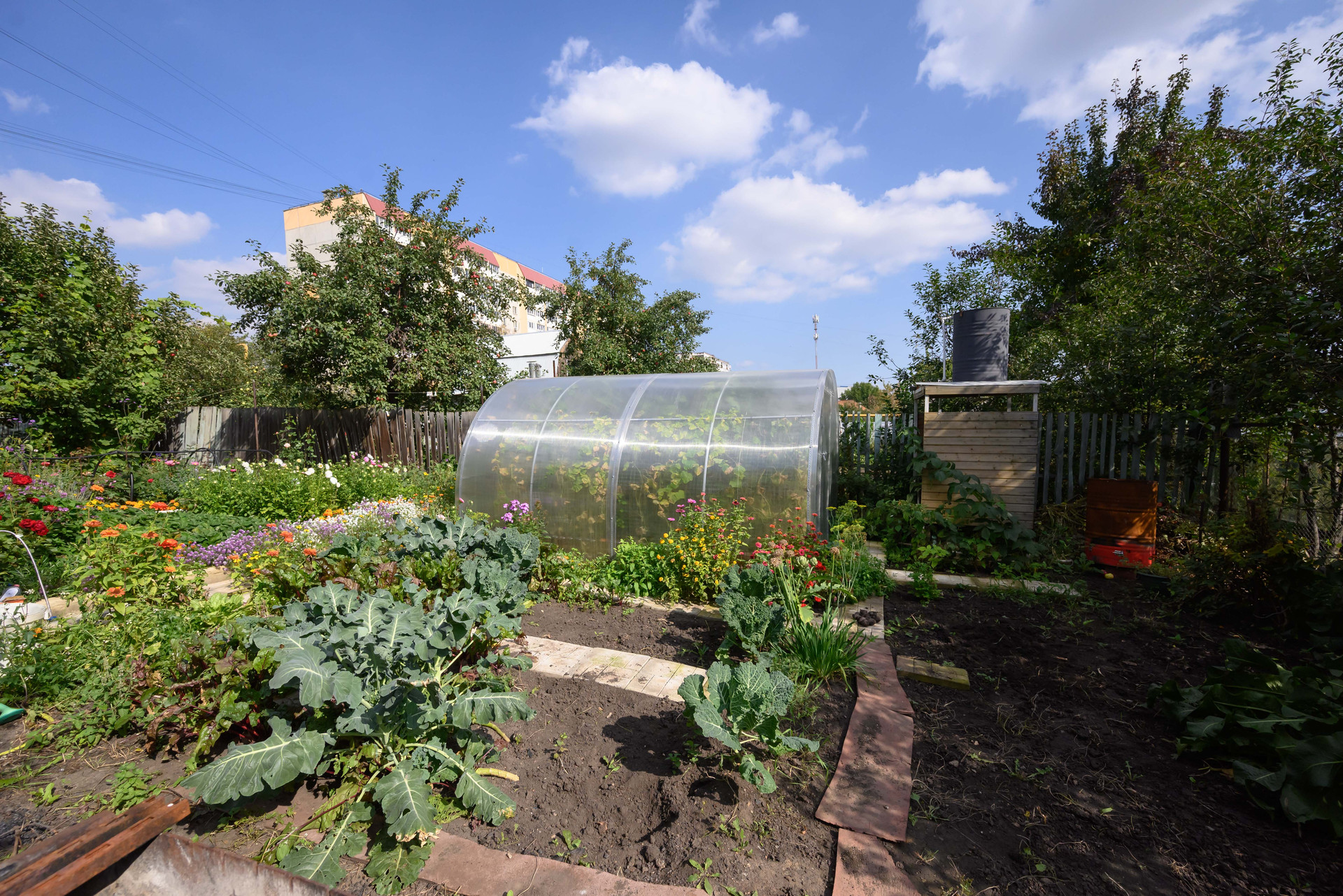 На участке расположен большой огород, где вы можете вырастить свои собственные овощи и фрукты. Есть теплица, плодоносящие деревья (яблони, груша, вишня) и кустарники (малина, крыжовник), ягоды, прекрасный цветник с редкими видами роз, виноград. Все грядки очень ухоженные.