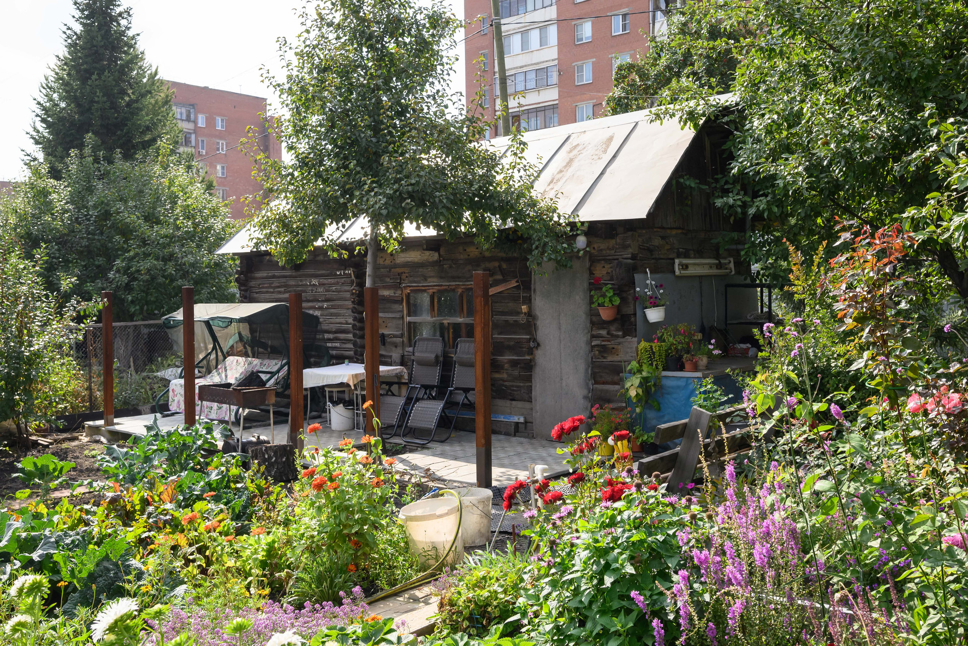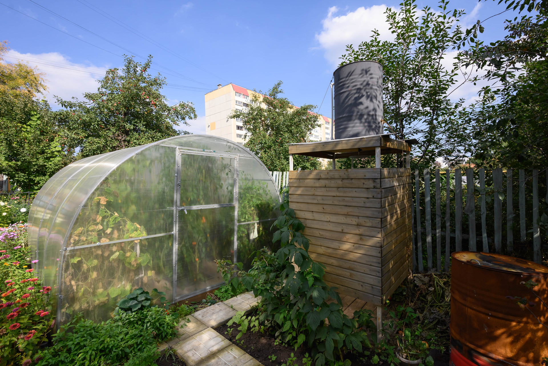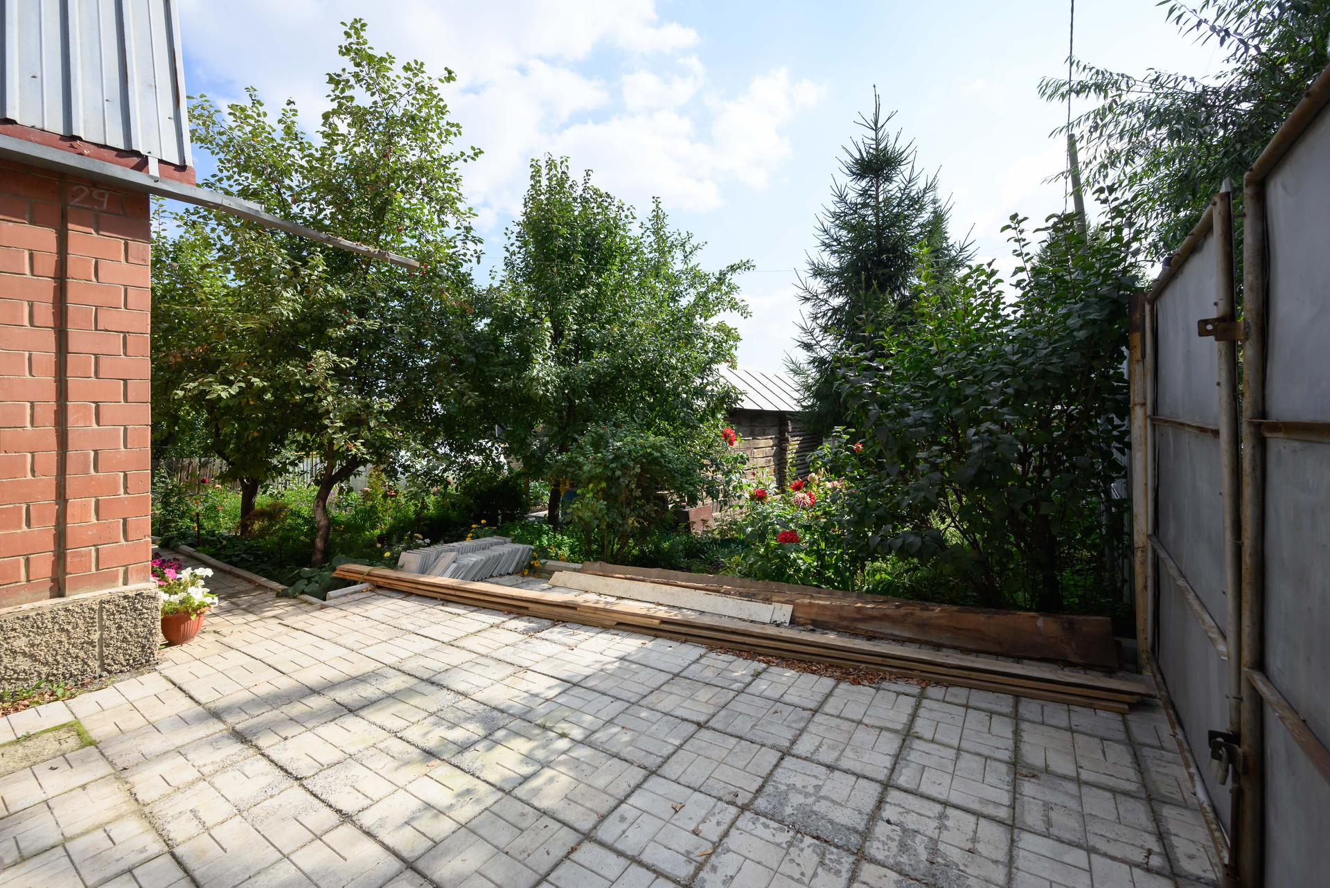 На участке расположен большой огород, где вы можете вырастить свои собственные овощи и фрукты. Есть теплица, плодоносящие деревья (яблони, груша, вишня) и кустарники (малина, крыжовник), ягоды, прекрасный цветник с редкими видами роз, виноград. Все грядки очень ухоженные.