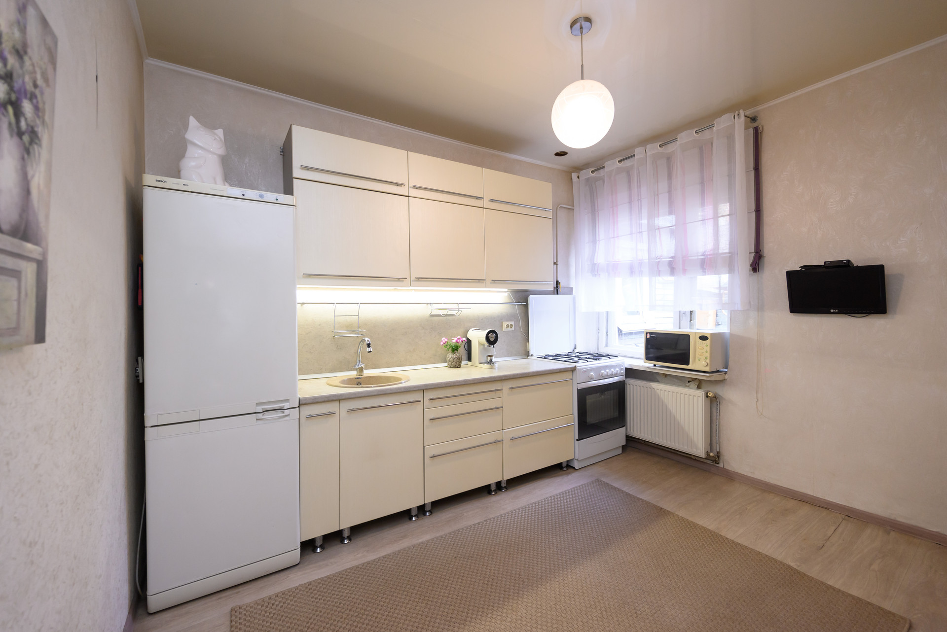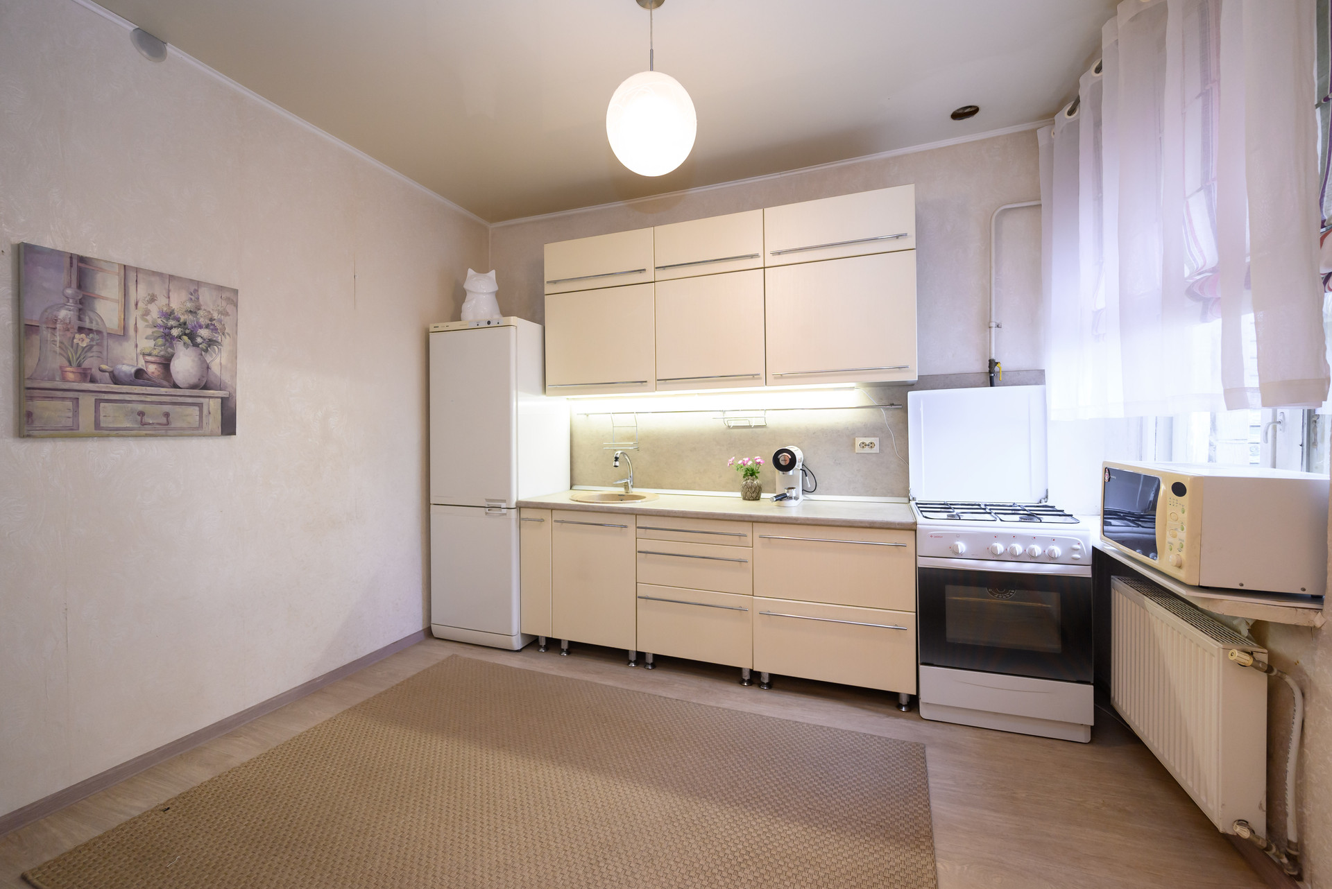 - Удобная кухня, полностью оборудованная всем необходимым (кухонный гарнитур, холодильник, газовая плита);
