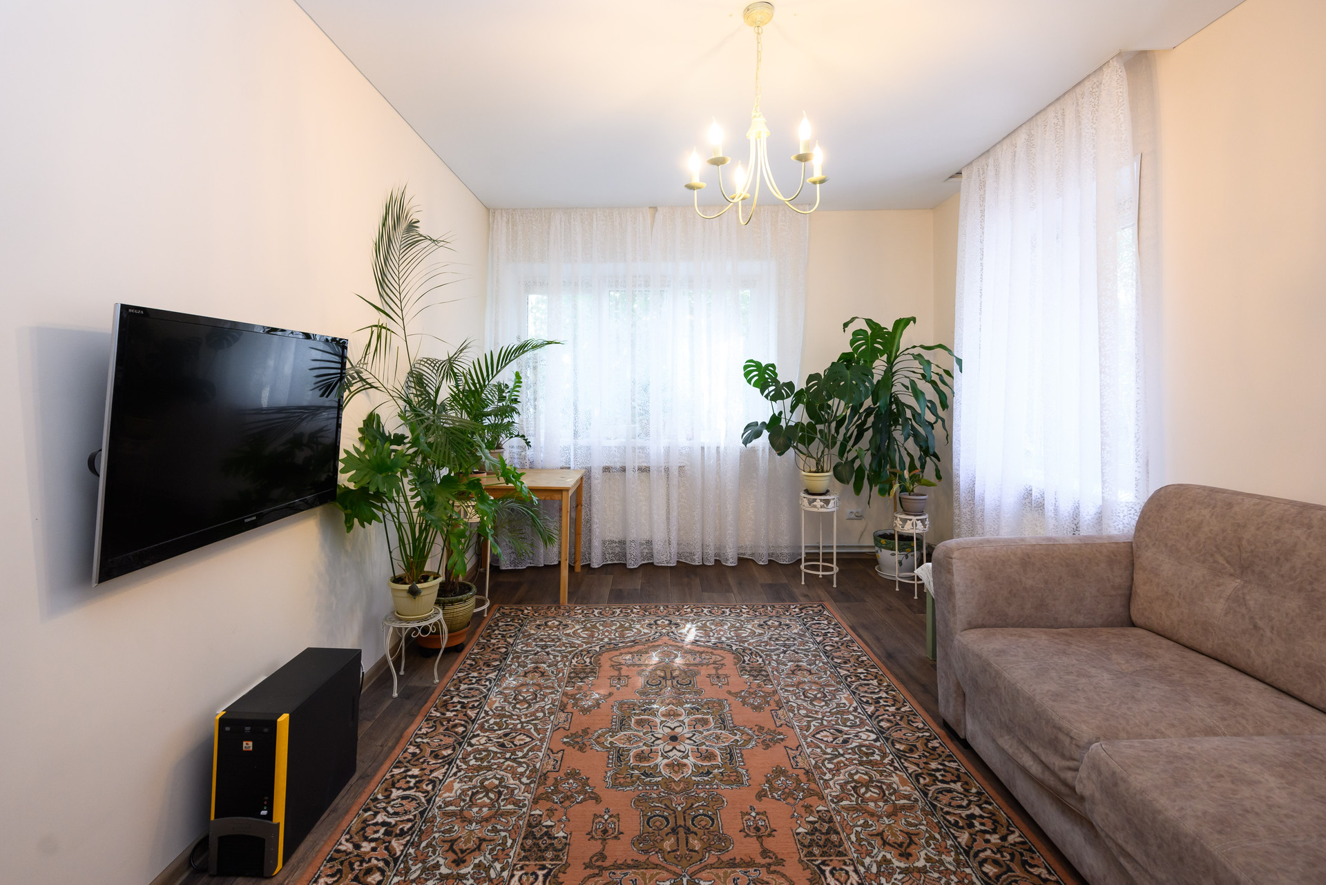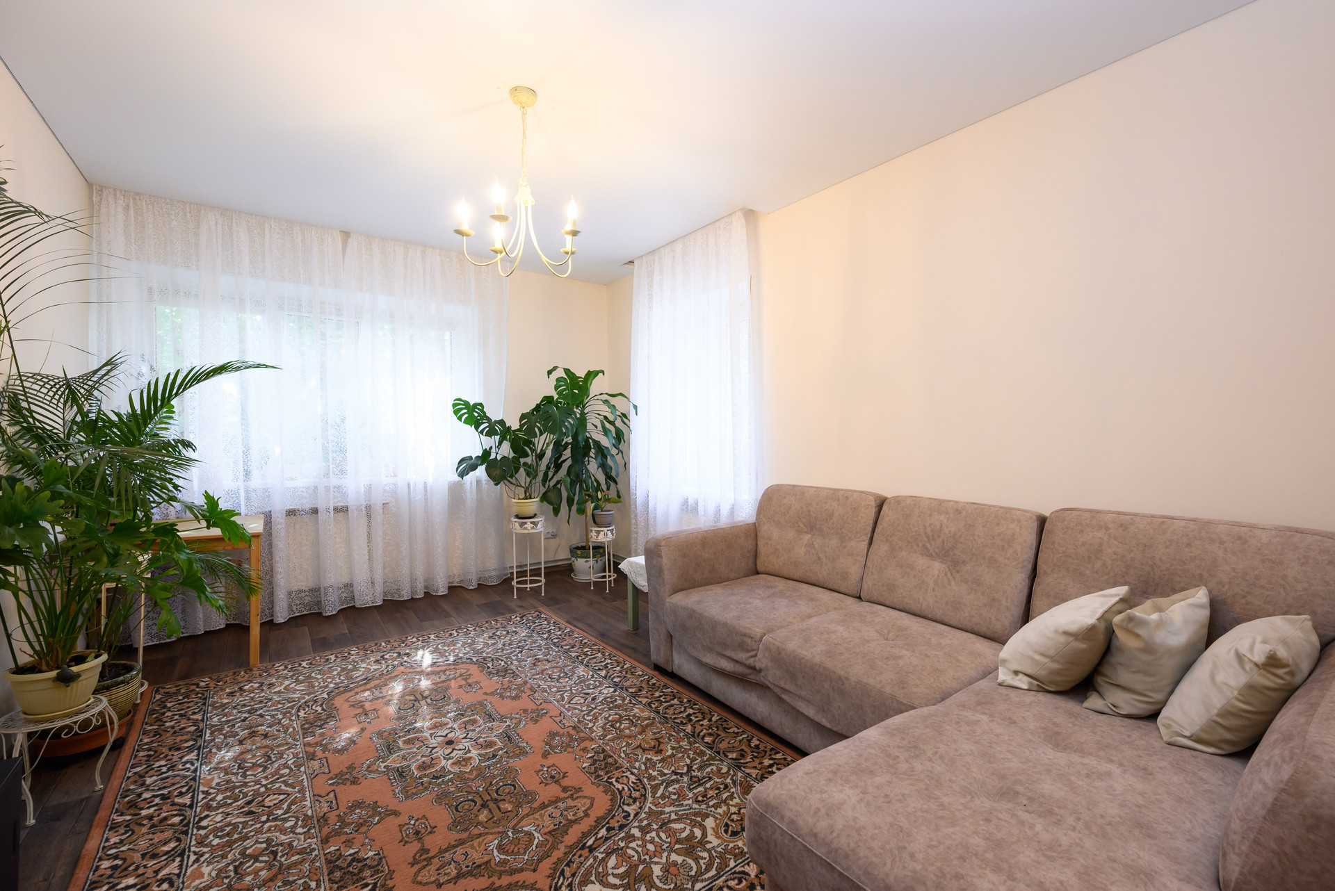 - Просторная гостиная с диваном и большими окнами, которые наполняют пространство естественным светом ;