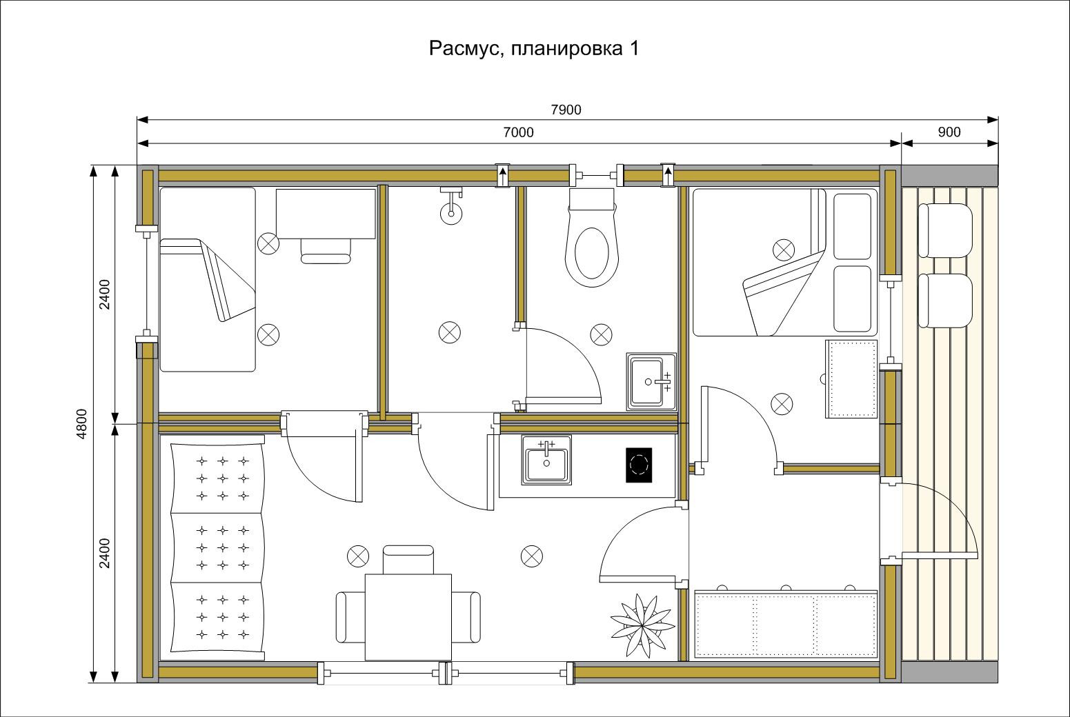 Планировка: кухня-гостиная, спальня, санузел