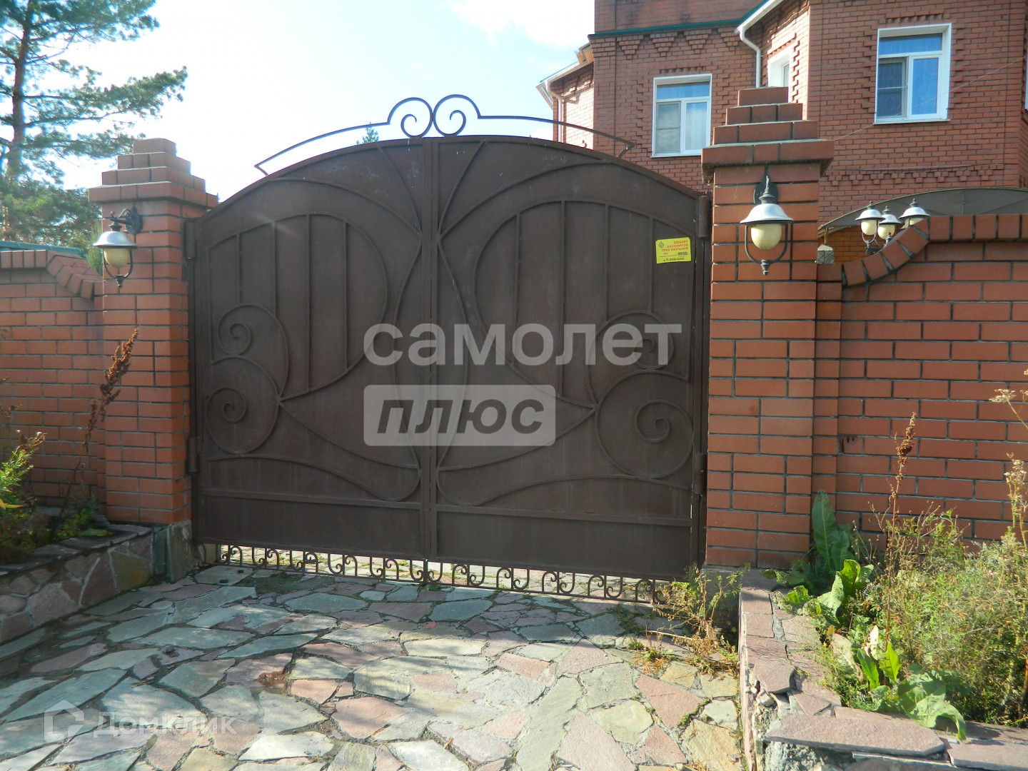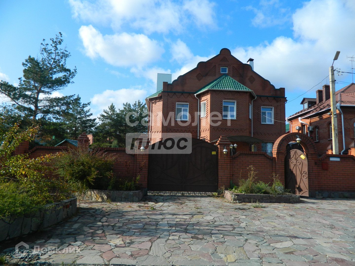 Участок огорожен по всему периметру высоким кирпичным забором, с фасадной части - двое въездных ворот - в гаражи и во двор, и широкая калитка. Все они открываются от пульта.