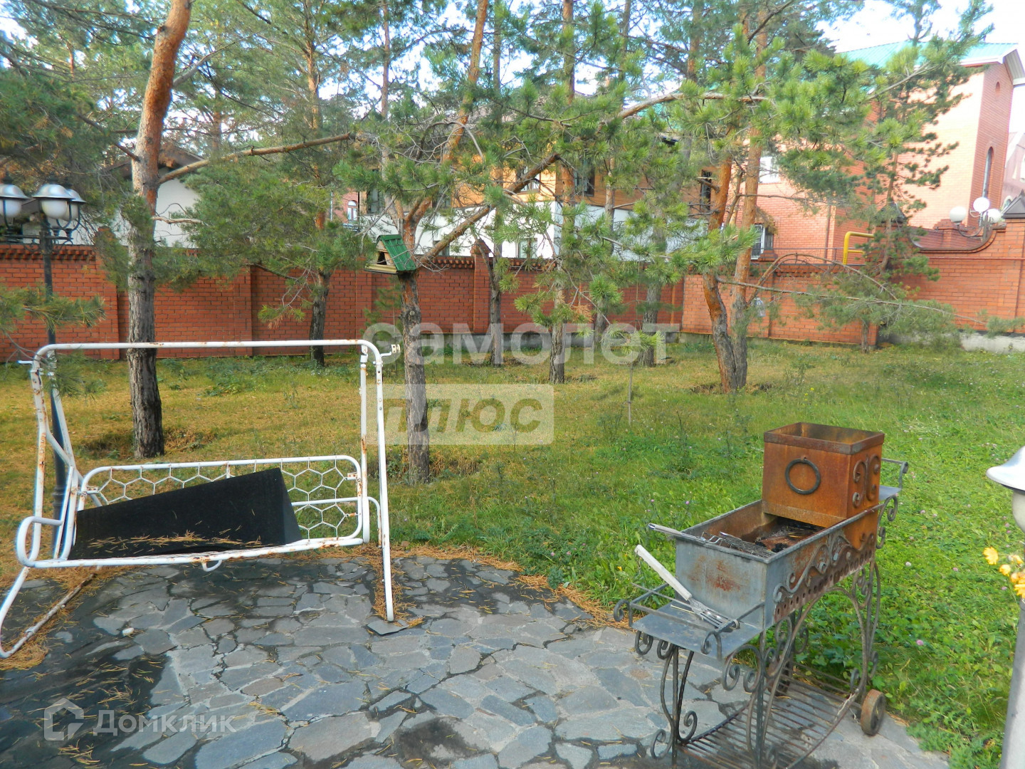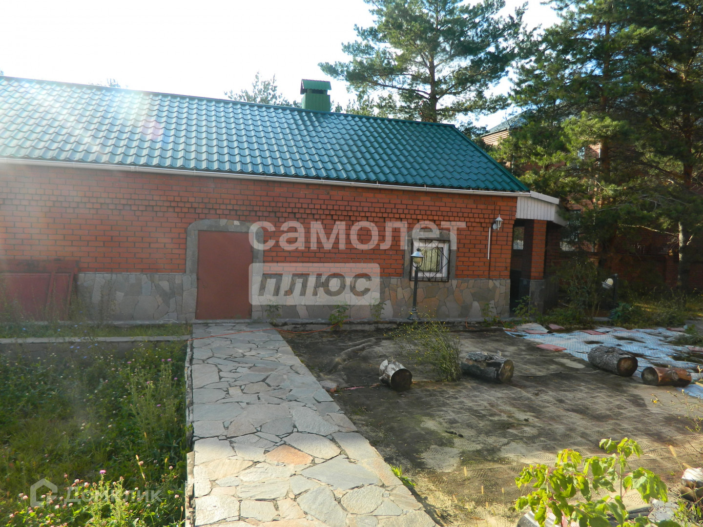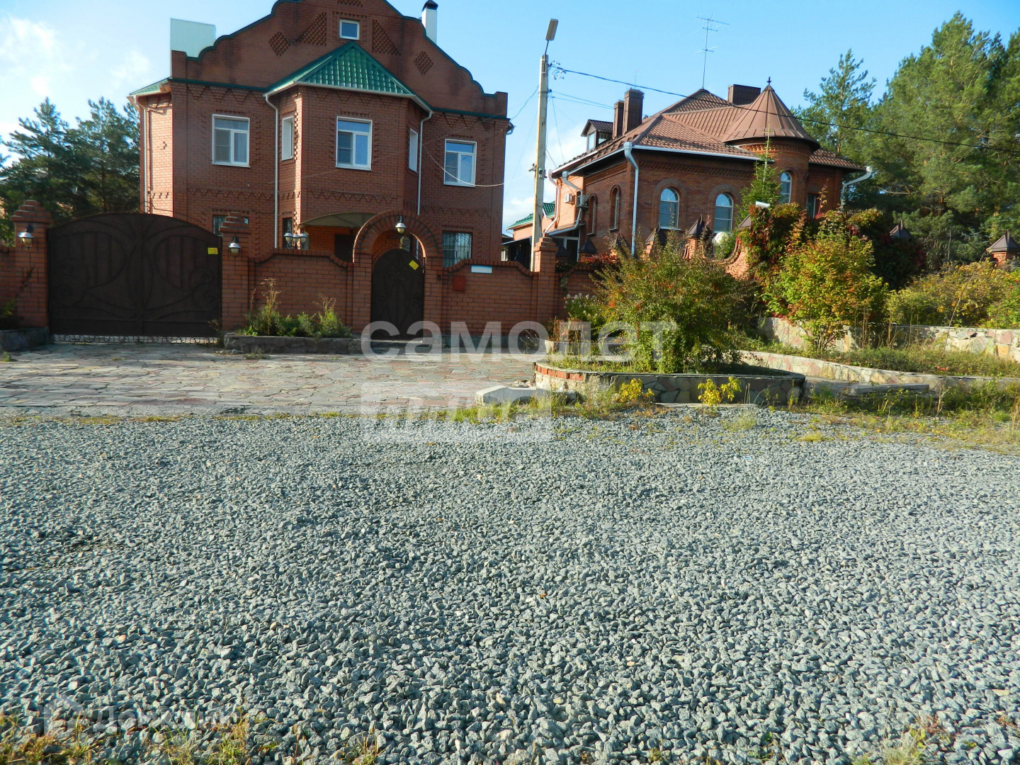 На участке растут величественные сосны, дорожки и малые формы ландшафтного дизайна, клумбы. Есть небольшой участок обрабатываемого огорода.