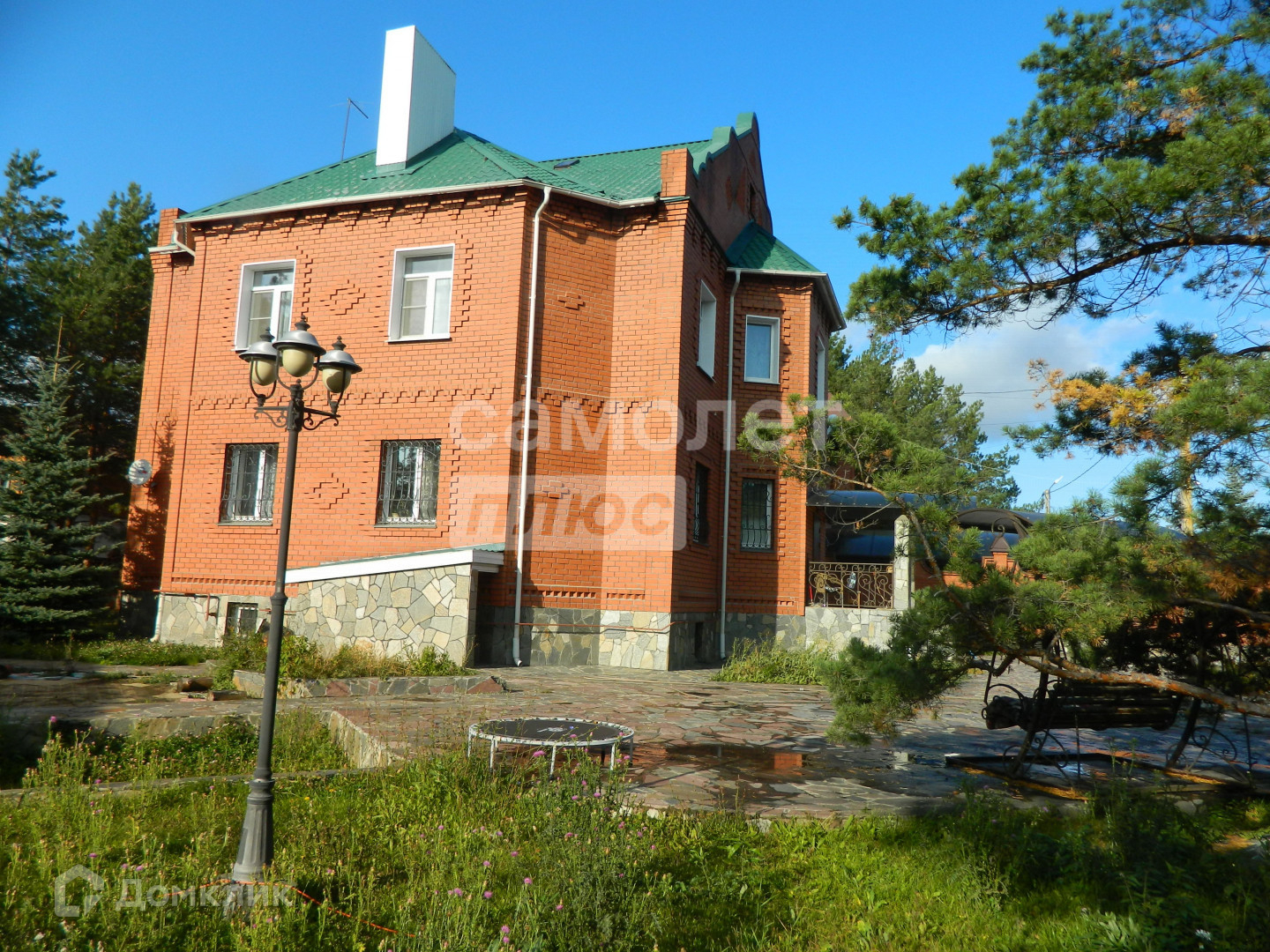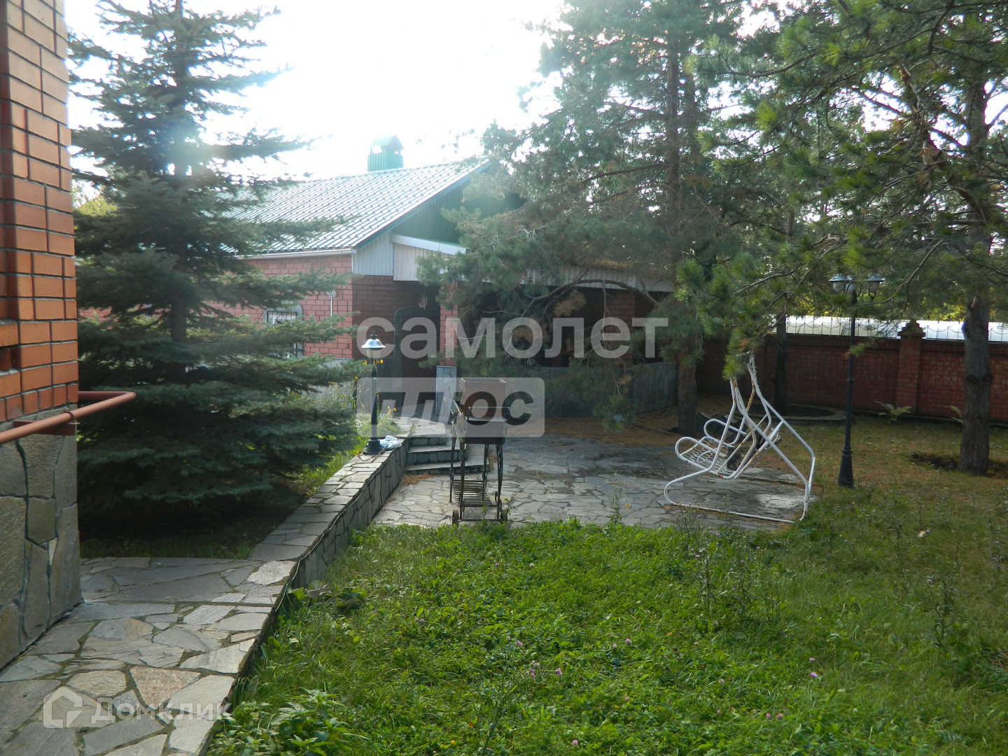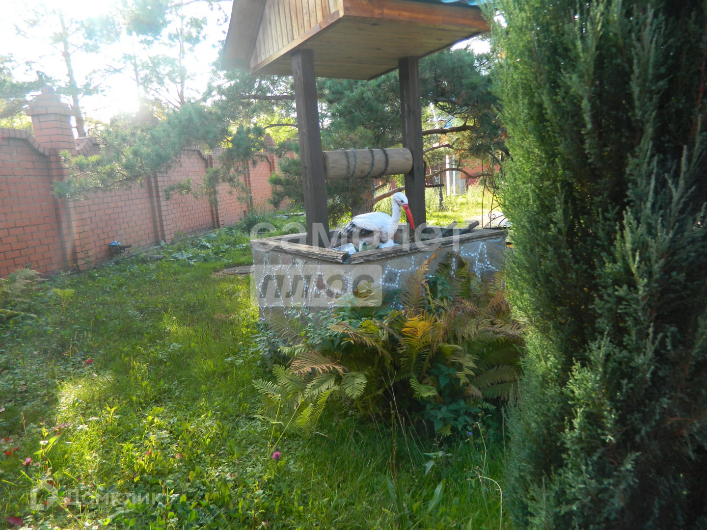 На участке растут величественные сосны, дорожки и малые формы ландшафтного дизайна, клумбы. Есть небольшой участок обрабатываемого огорода.
