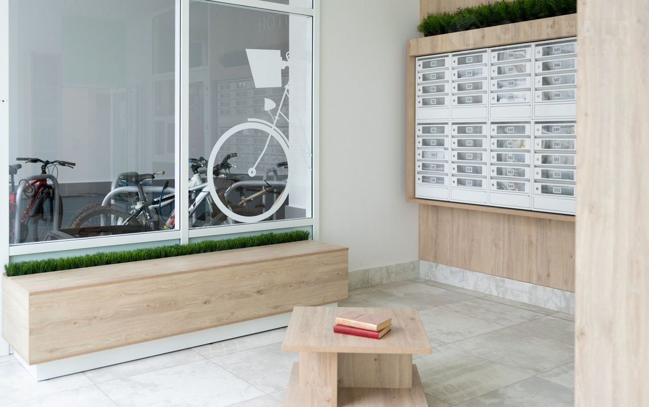 В каждом подъезде: велолапомойки, велосипедные, колясочные, зоны ожидания и буккроссинга. На -1 этаже кладовые.