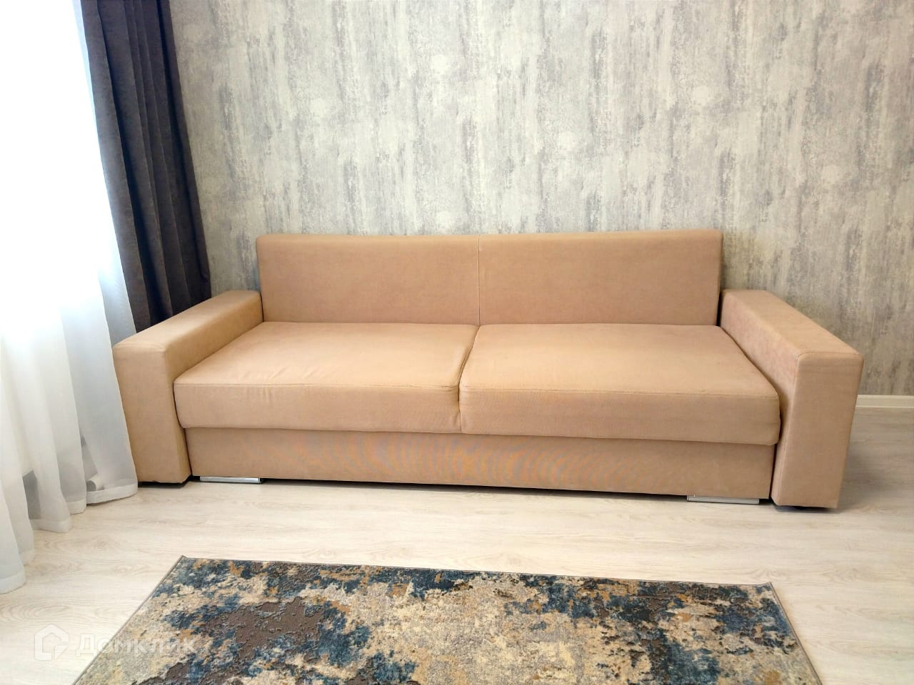 Новым владельцам остается: кухонный гарнитур с варочной поверхностью и барной стойкой, двухспальный раскладной диван.