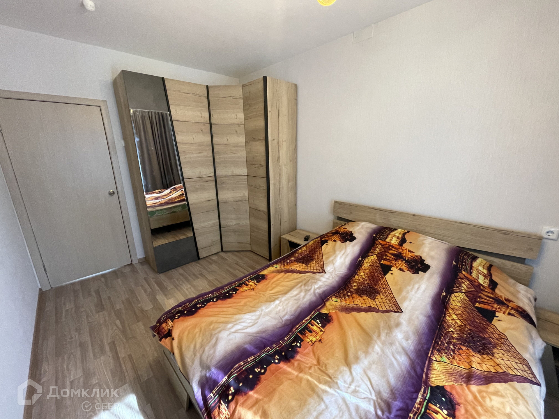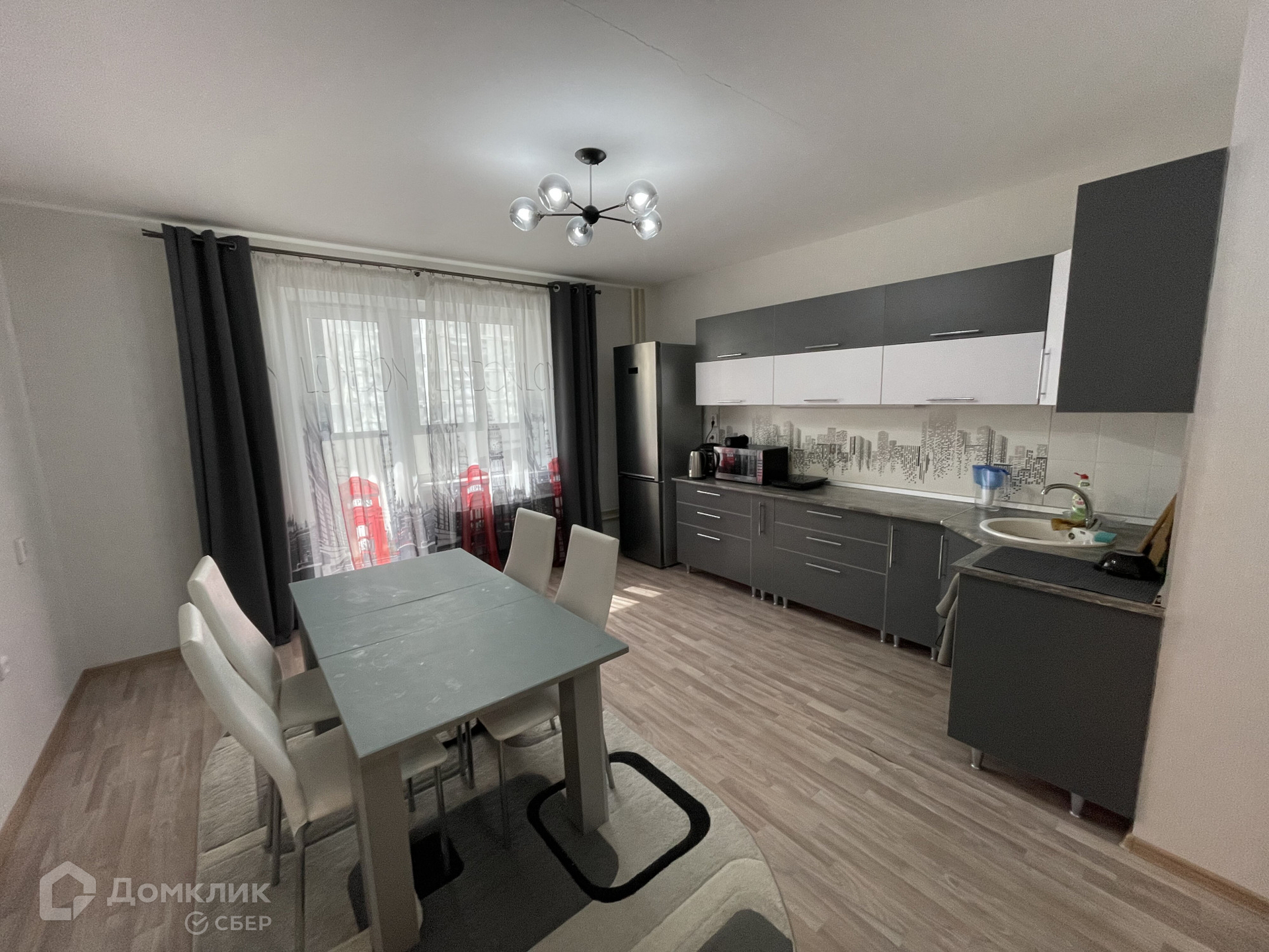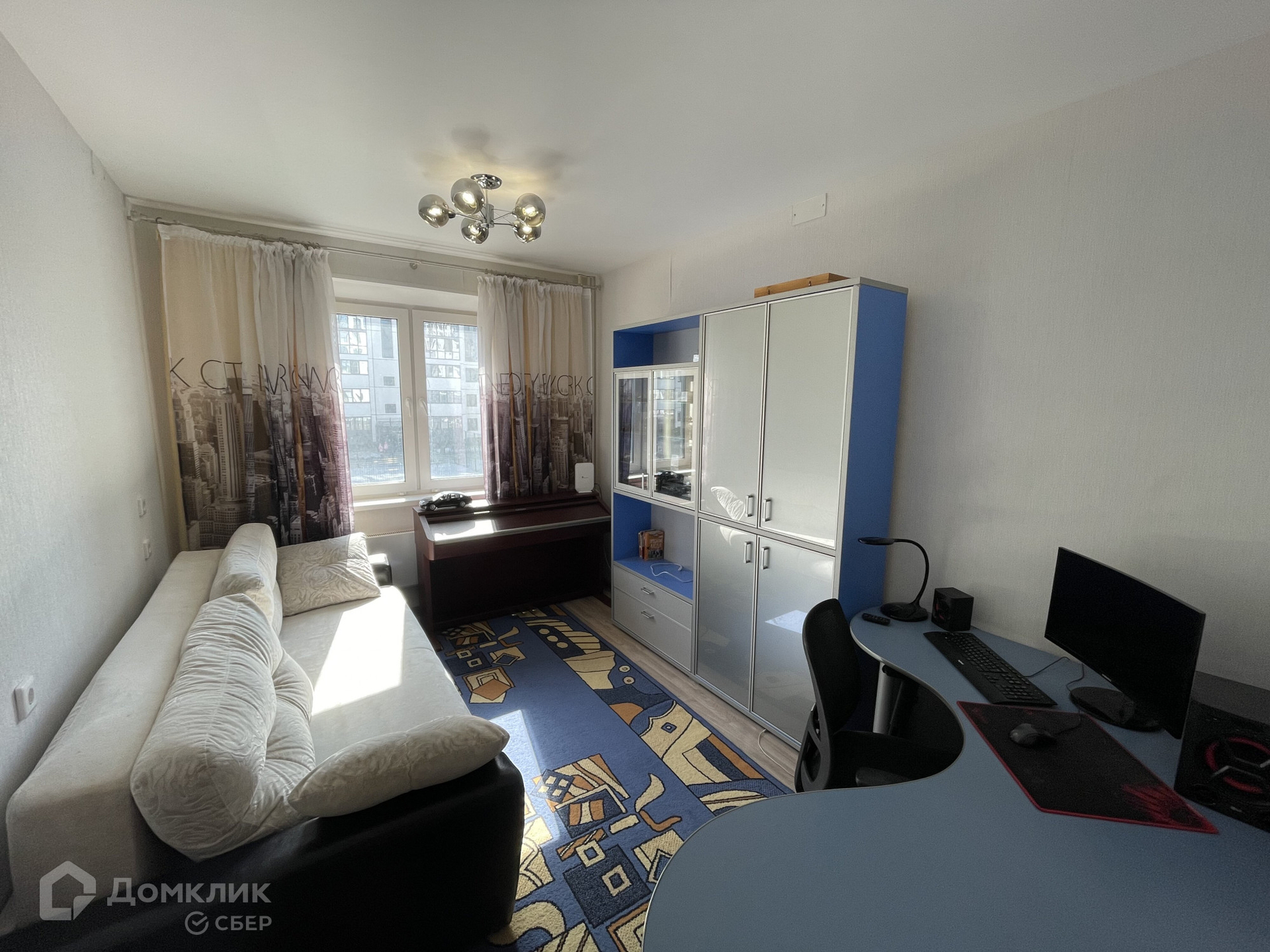 В квартире остается кухонный гарнитур, обеденный стол со стульями, шкаф и кровать в спальне, диван, шкаф и компьютерный стол во второй спальне.