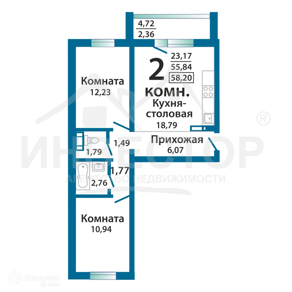 Общая площадь 56.3 м2