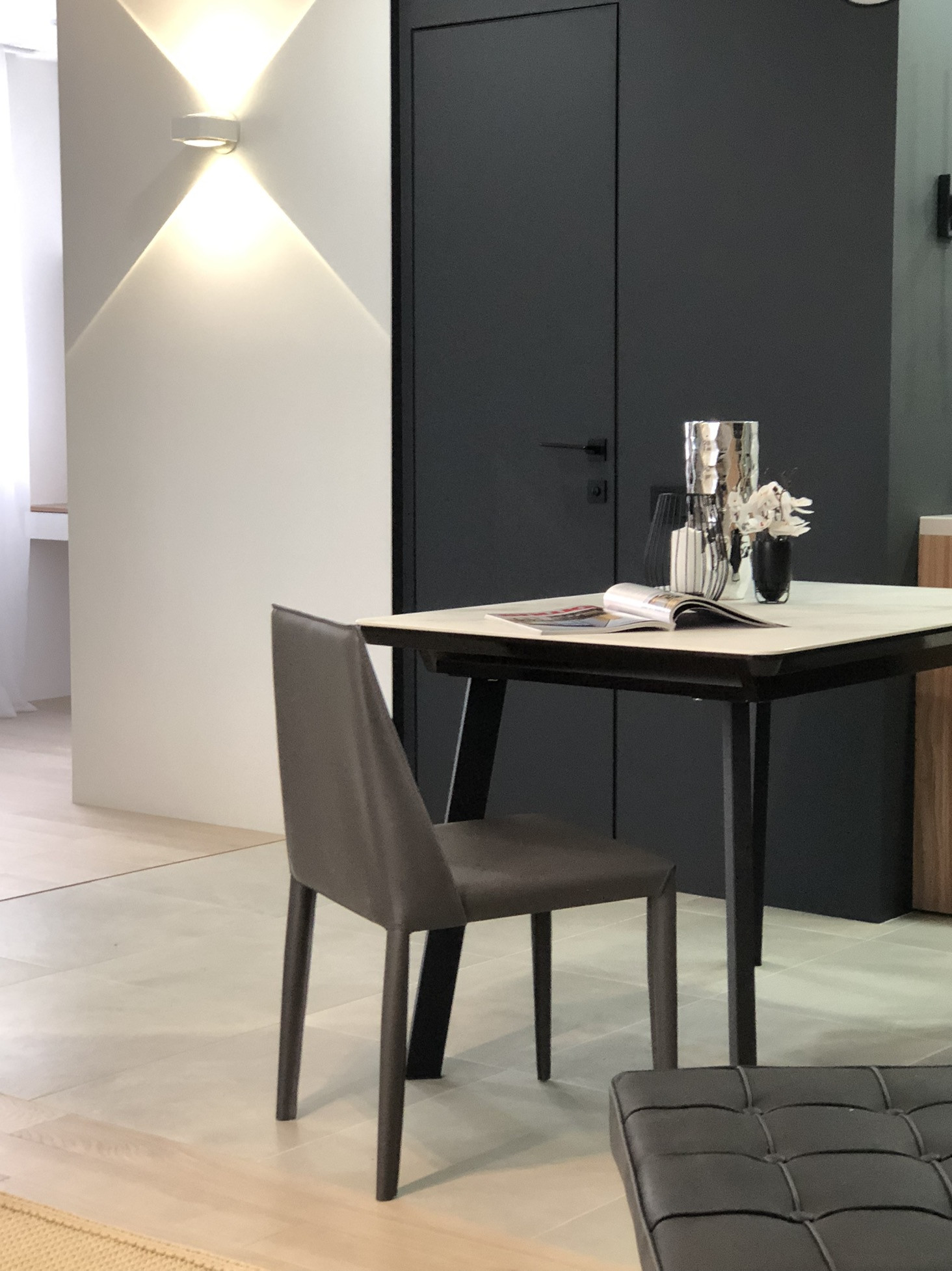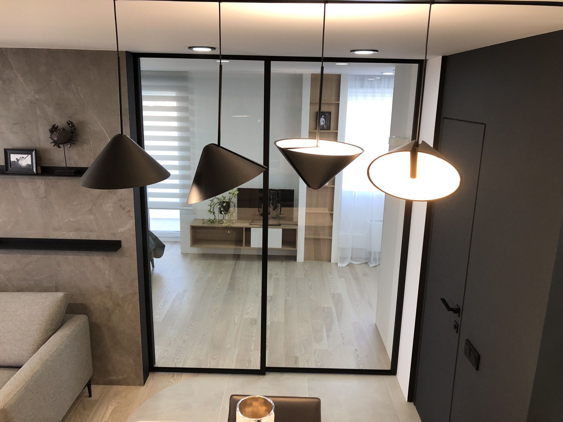 - межкомнатная стеклянная дверь (Aristo) из двух секций прячется в стену. Механизм синхронного открывания обеих секций .
