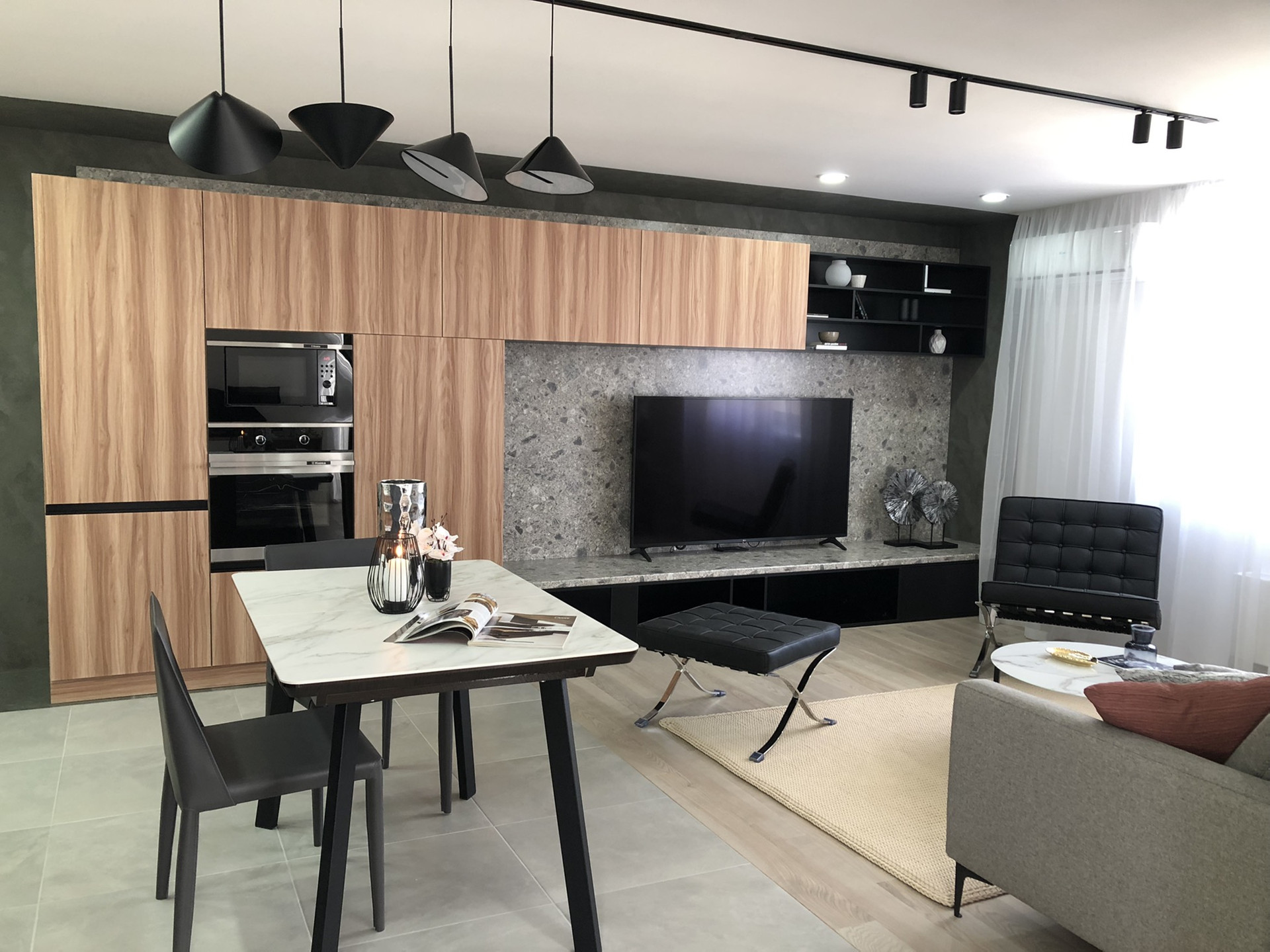 Вся мебель имеет фасады МДФ! В ванной и на кухне покраска,в остальной части - плёнка. Ручки у дверок кухонного гарнитура BLUM . Столешница у кухонного гарнитура и столешница в ванной искусственный камень. Обеденный стол керамика раскладной .Дом новый сдан 2020 г В квартире остается вся мебель, бытовая техника, предметы интерьера ,+ покупателю в подарок комплект двухспального постельного белья Deluxe Series (KARNAТурция). Продажа от собственника.