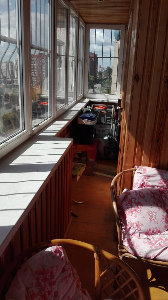 Стены и потолки выравнивались. Полы в комнатах - отличный паркет, в кухне - керамогранит, в коридоре линолеум. Лоджии обшиты вагонкой. Мебель и техника могут быть оставлены по договоренности