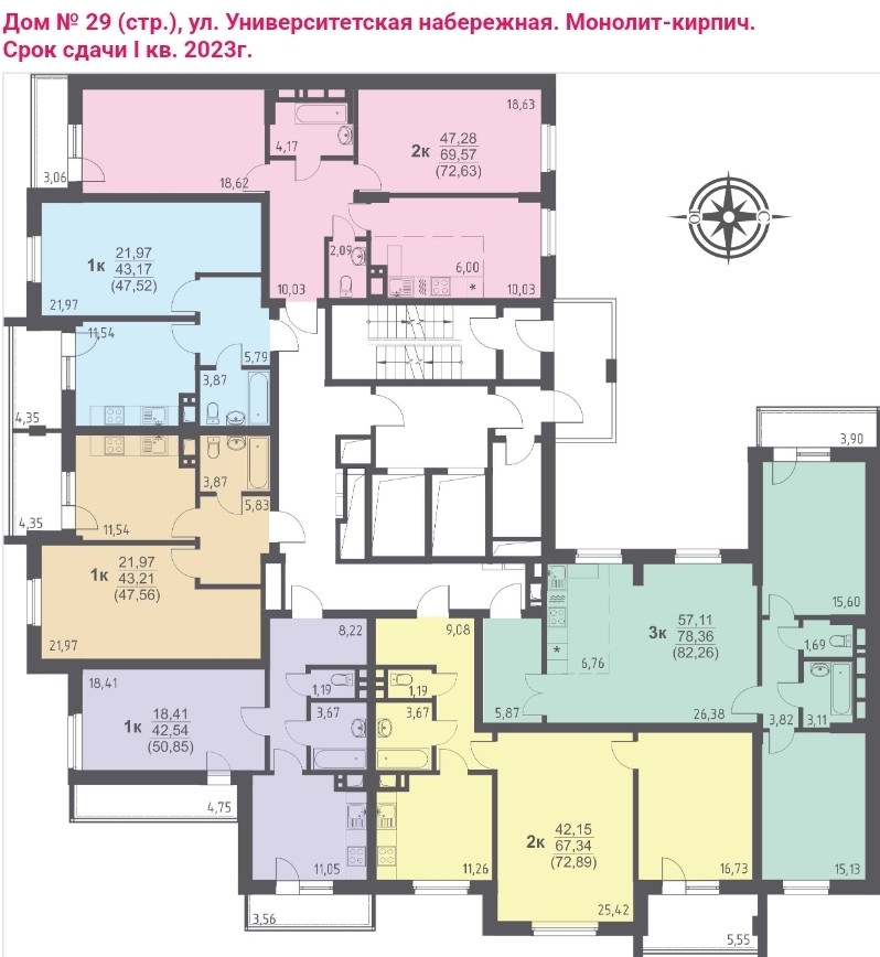 Квартира-студия+ 2 комнаты в Академ Риверсайд, на плане жёлтая!