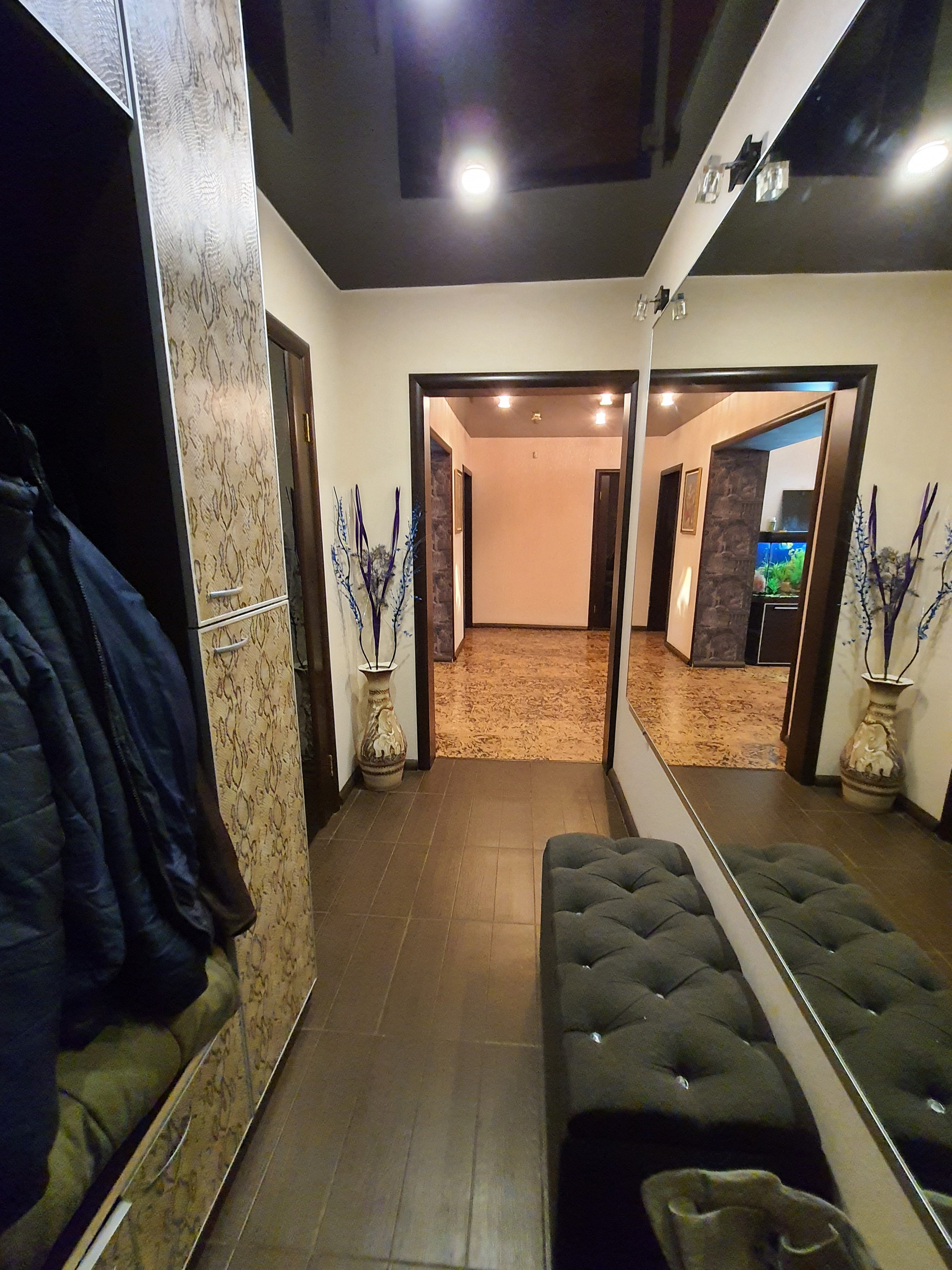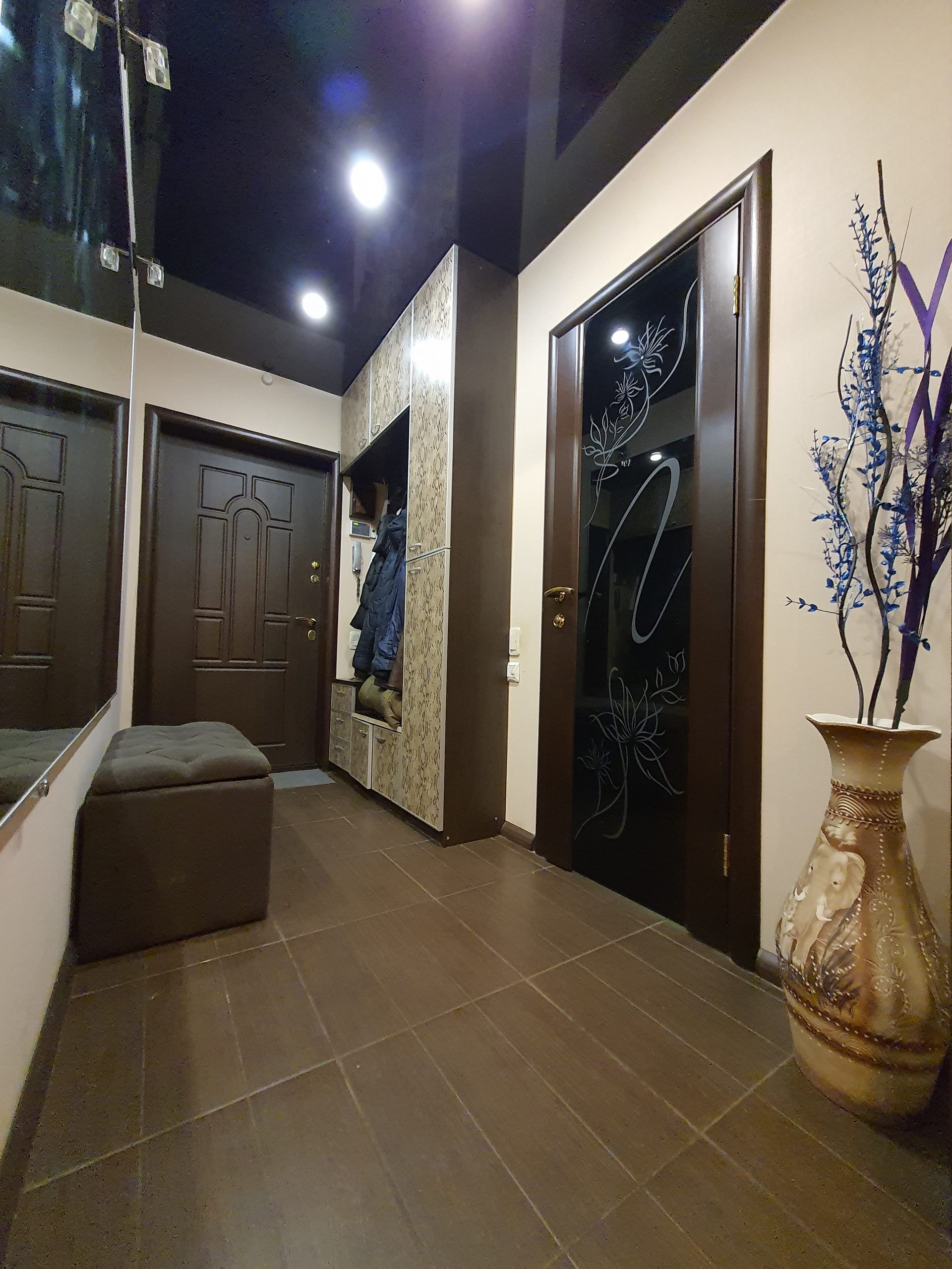 Прихожая: пол – кафель, зеркало с подсветкой. В подарок покупателям остается встроенный шкаф (отделка – под кожу), зеркало.