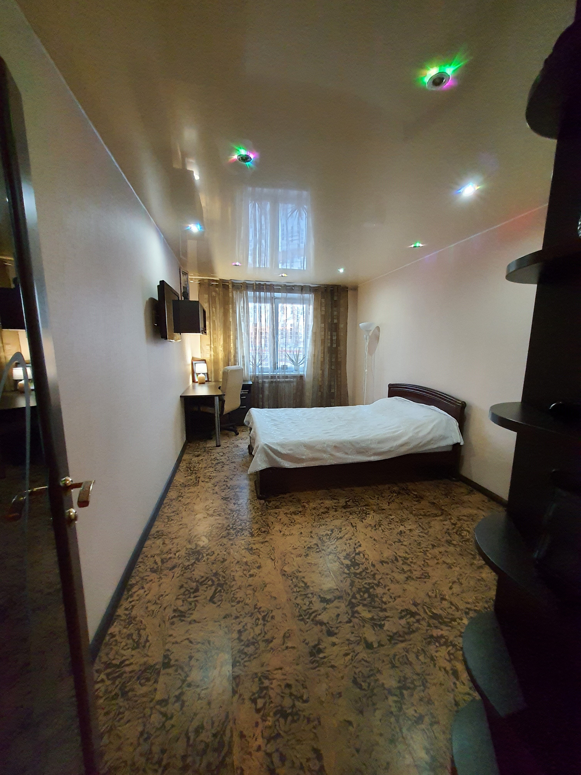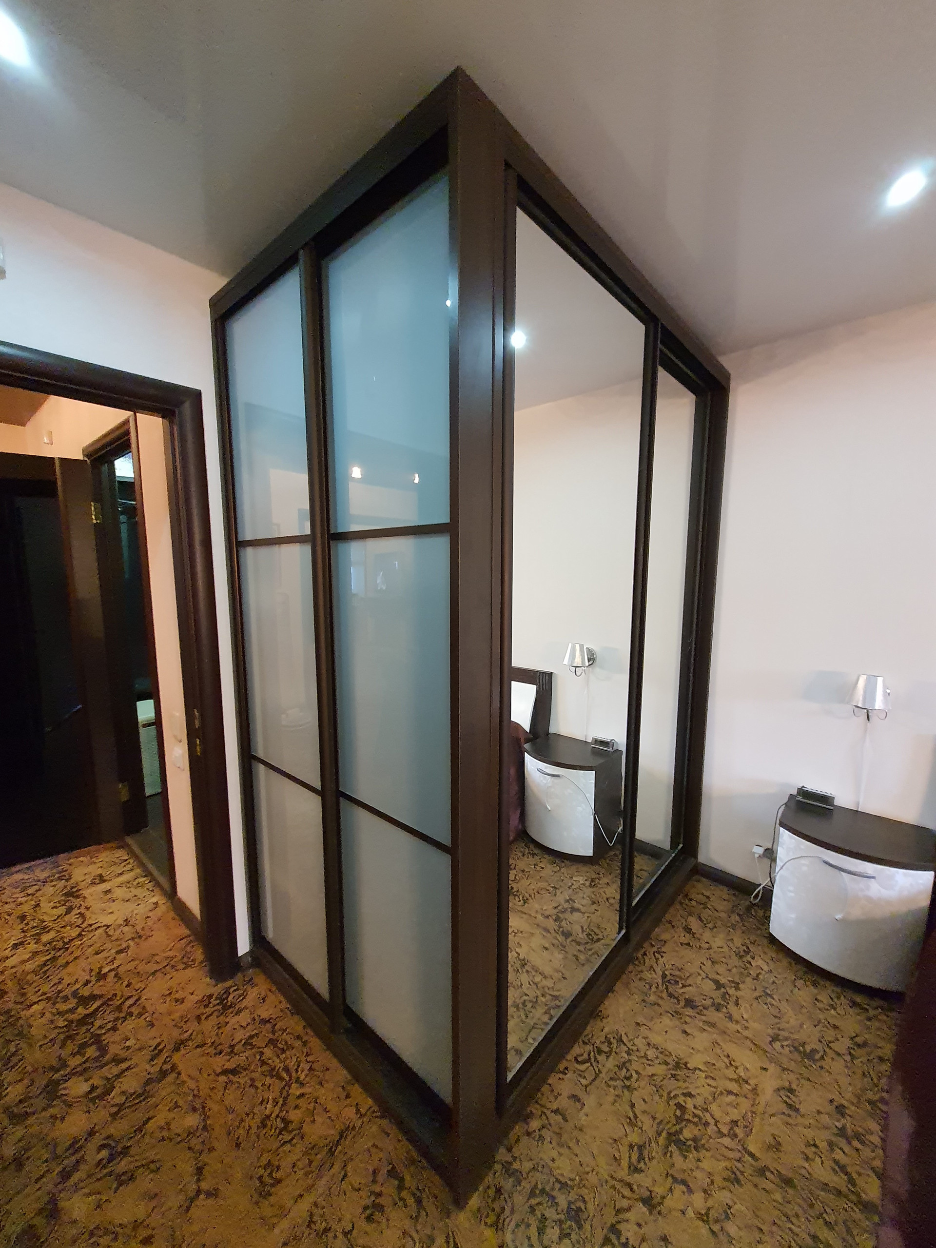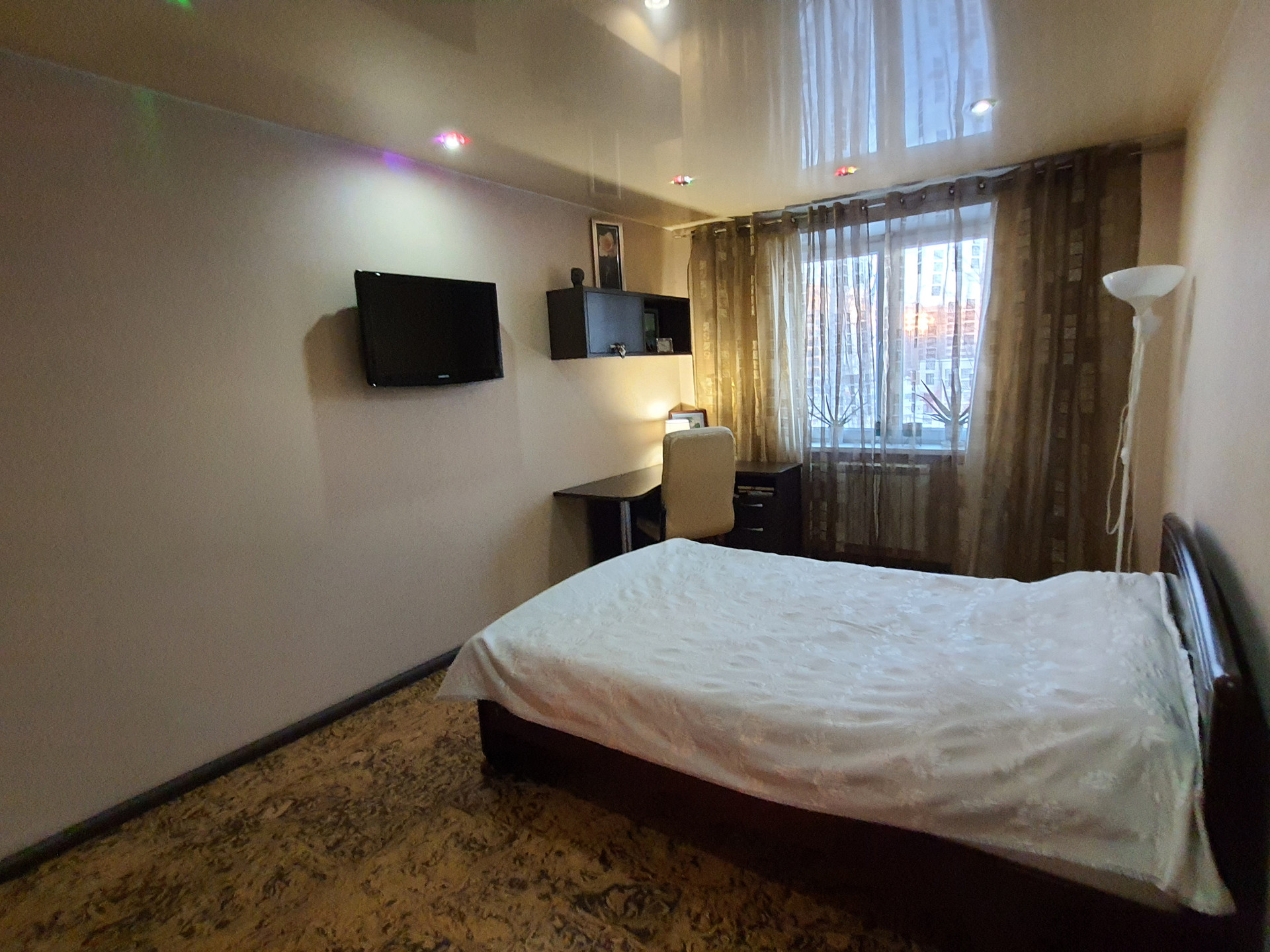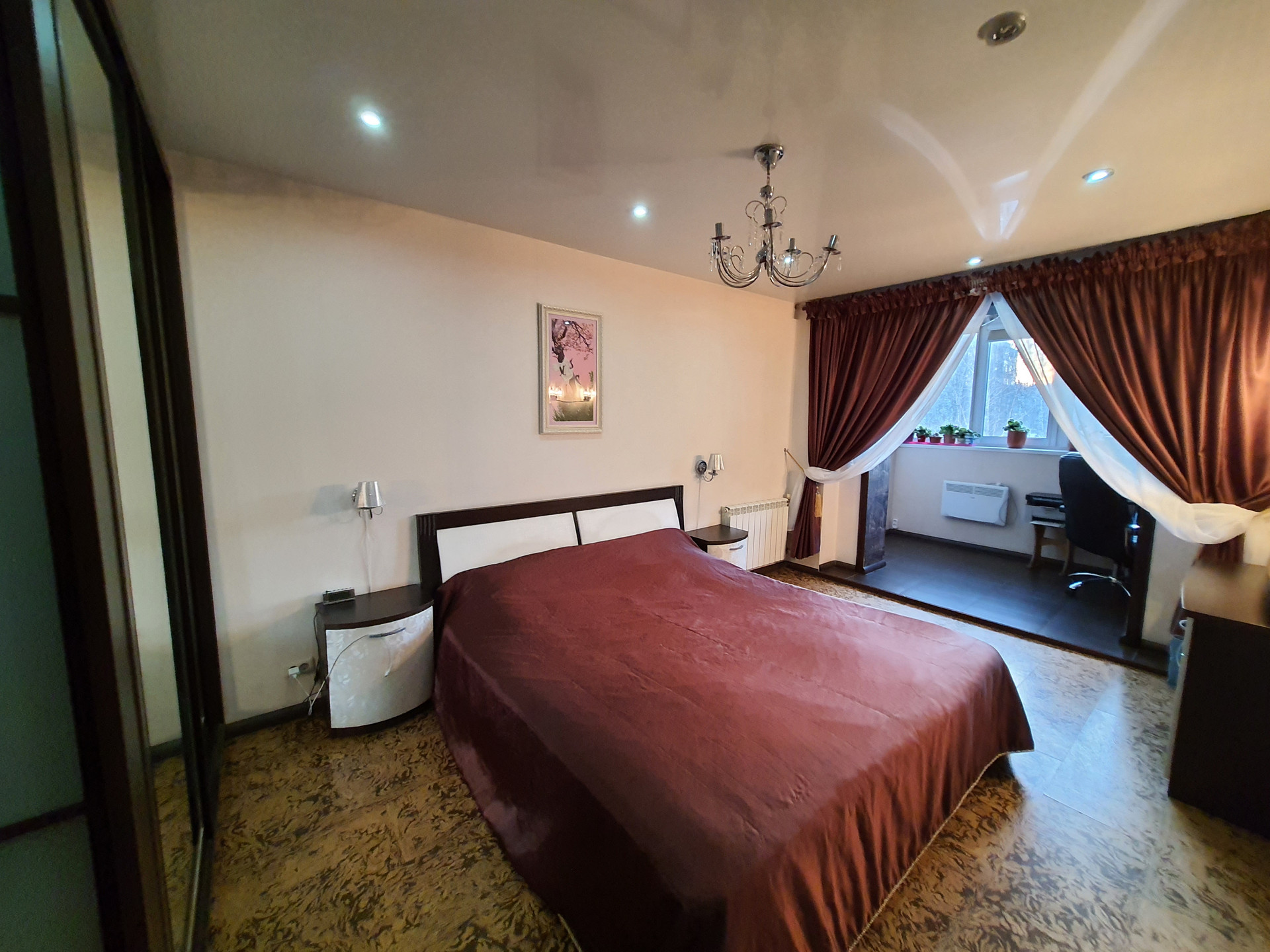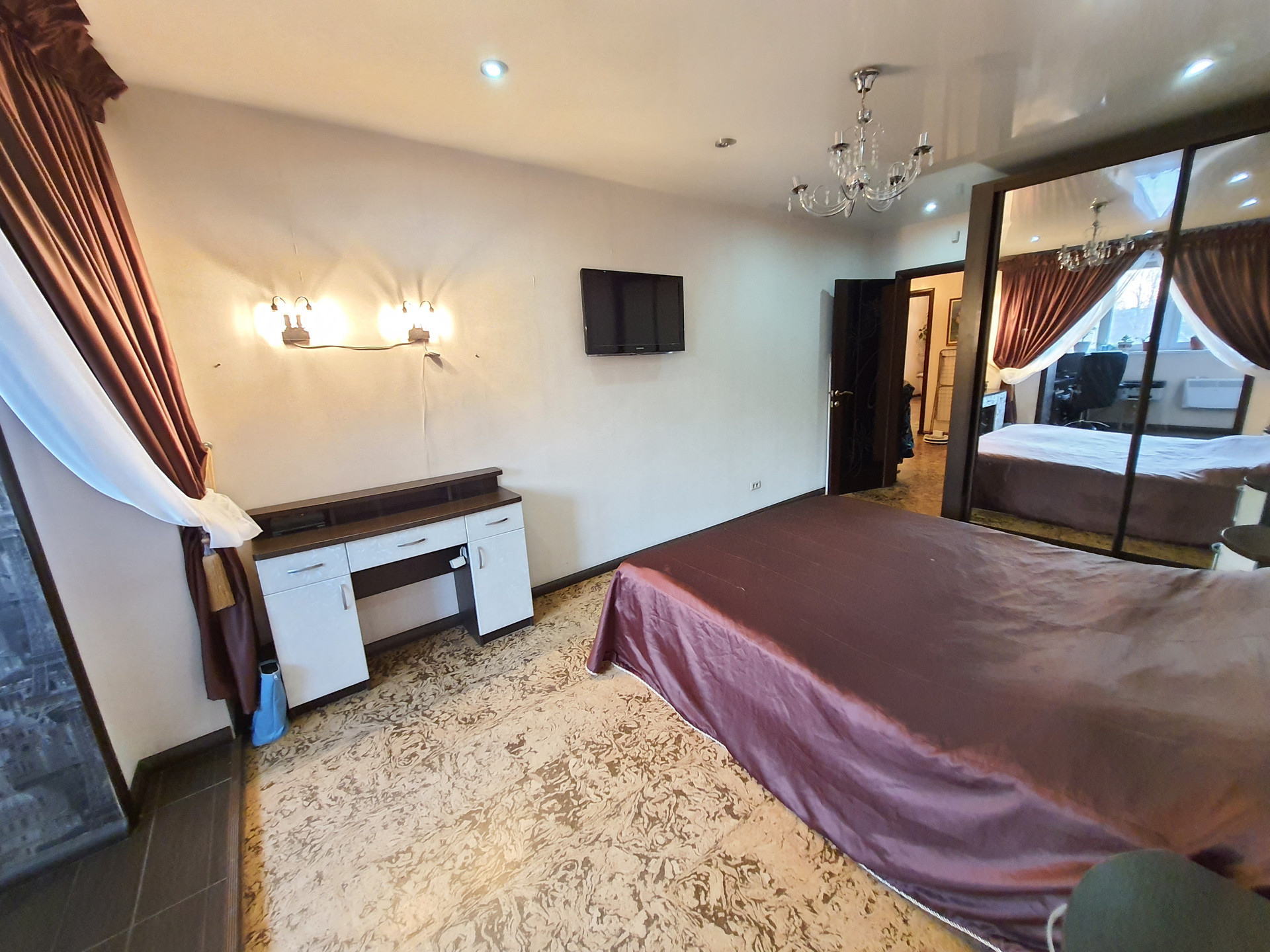 В спальне встроенный шкаф-купе, который остается в подарок покупателям.