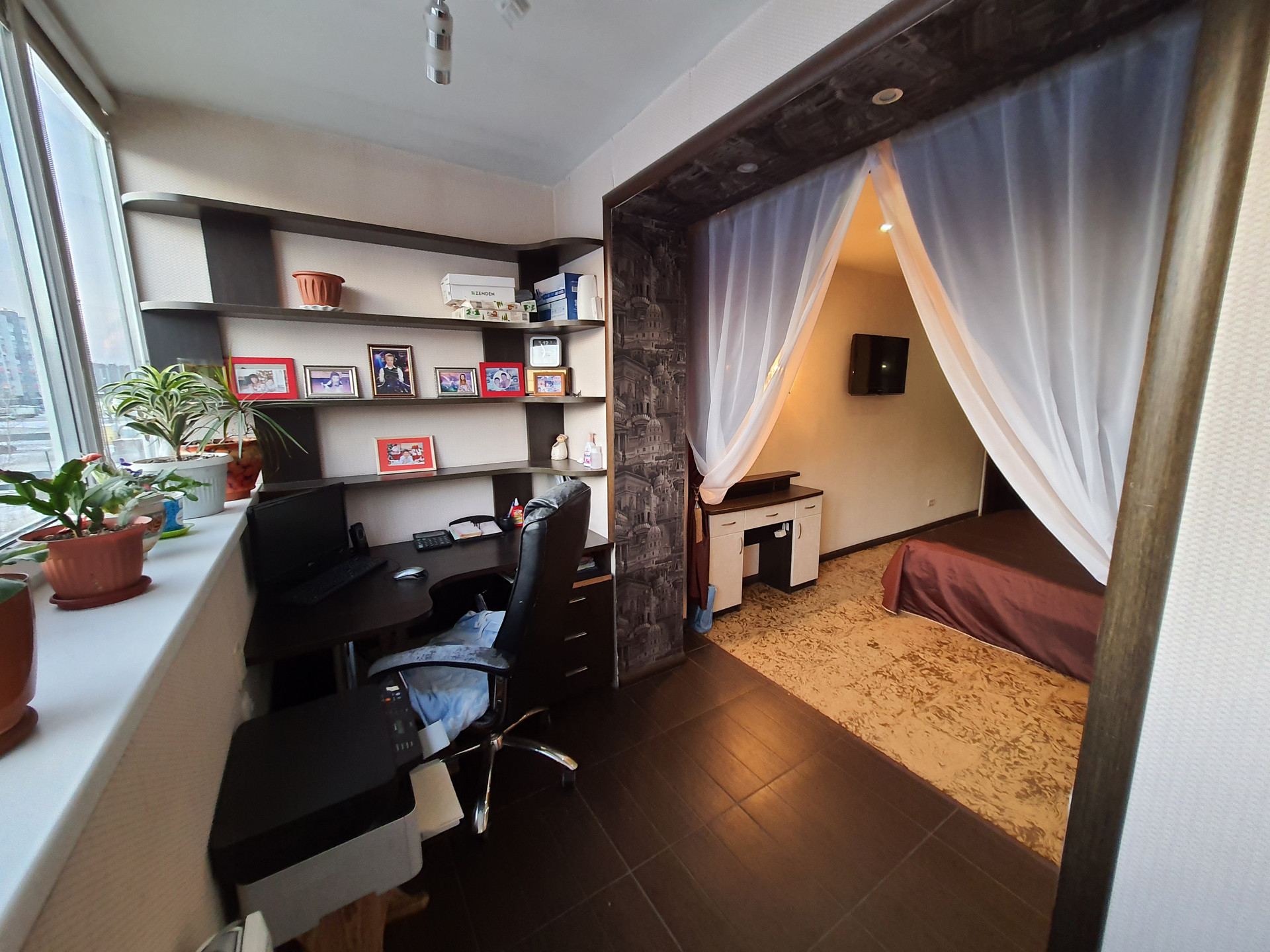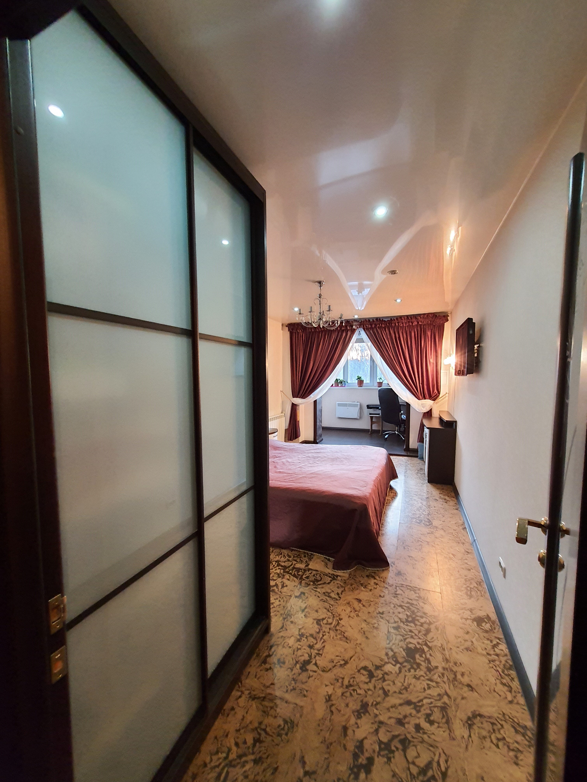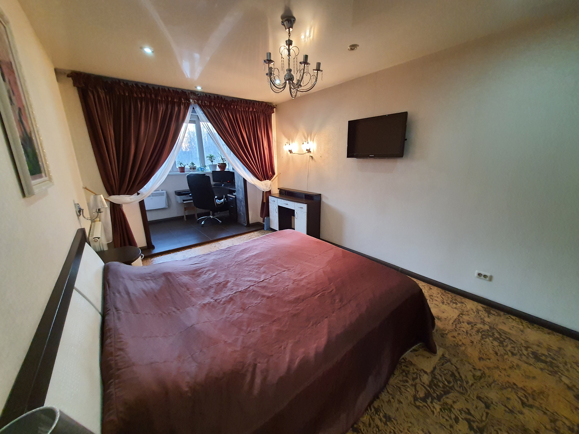 Спальня 1 (19,6 кв.м): спальня совмещена с кабинетом. В спальне встроенный шкаф-купе необычной конструкции – доступ с двух сторон. В спальне оборудован кабинет со встроенной мебелью. Встроенная мебель остается в подарок покупателям.