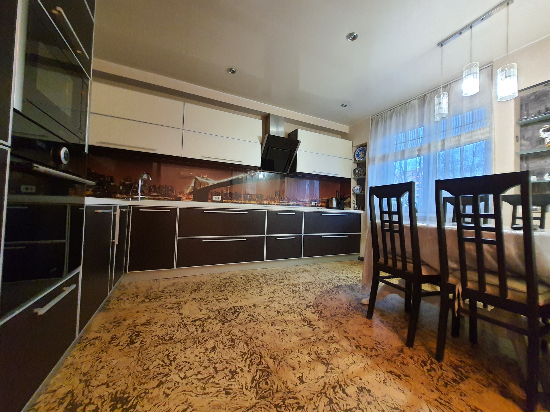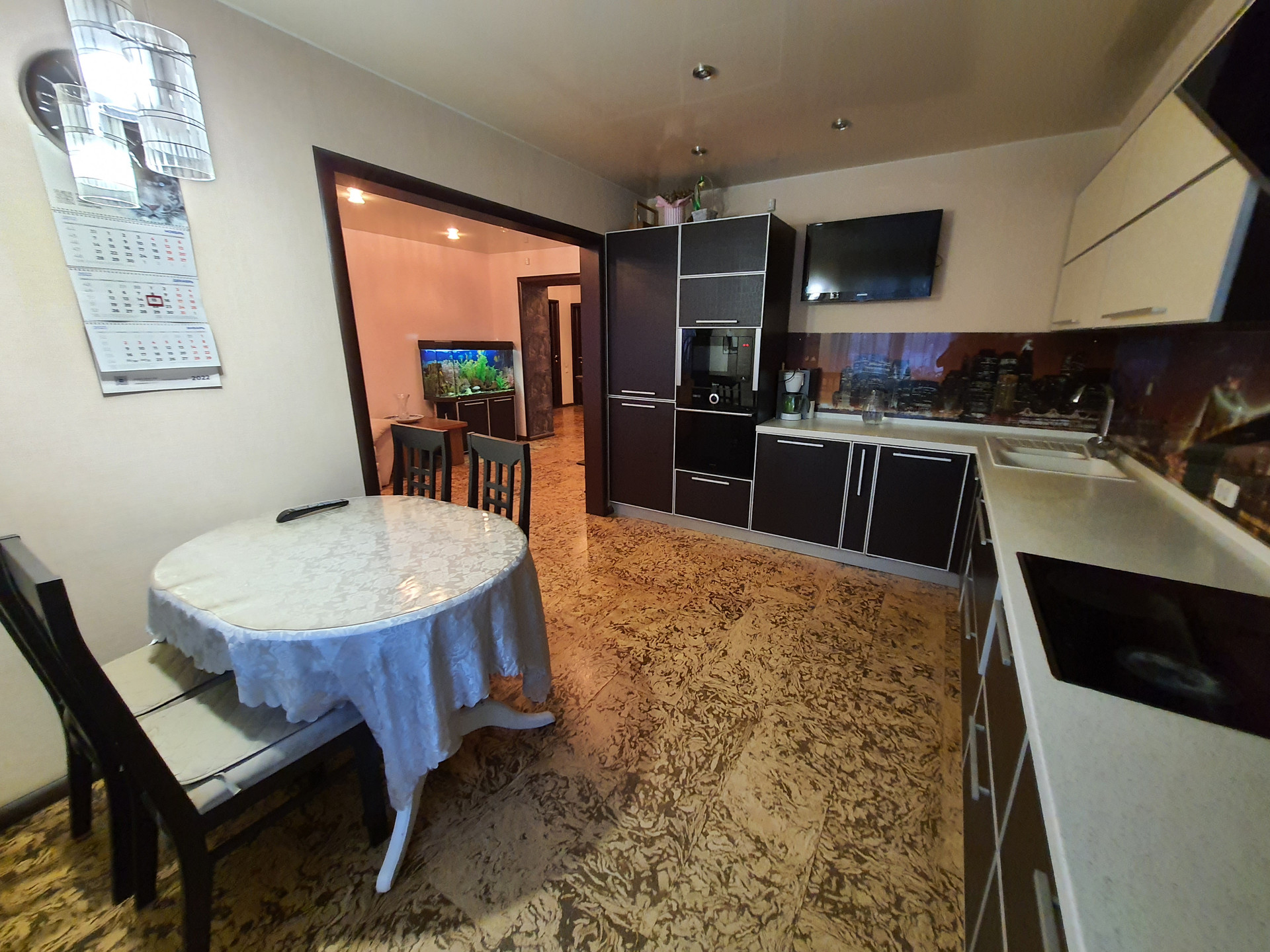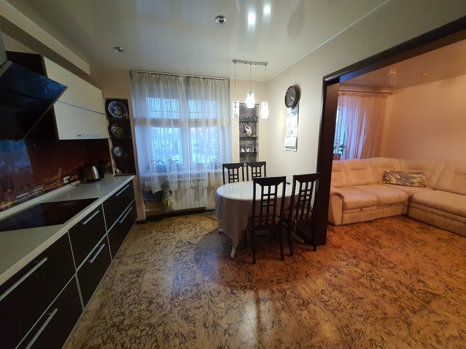 Кухня (12 кв.м): совмещена с залом. Кухонный гарнитур премиального качества, бытовая техника класса люкс (варочная поверхность, духовой шкаф, посудомоечная и стиральная машины, встроенный холодильник, вытяжка), техника бренда «Gorenje».