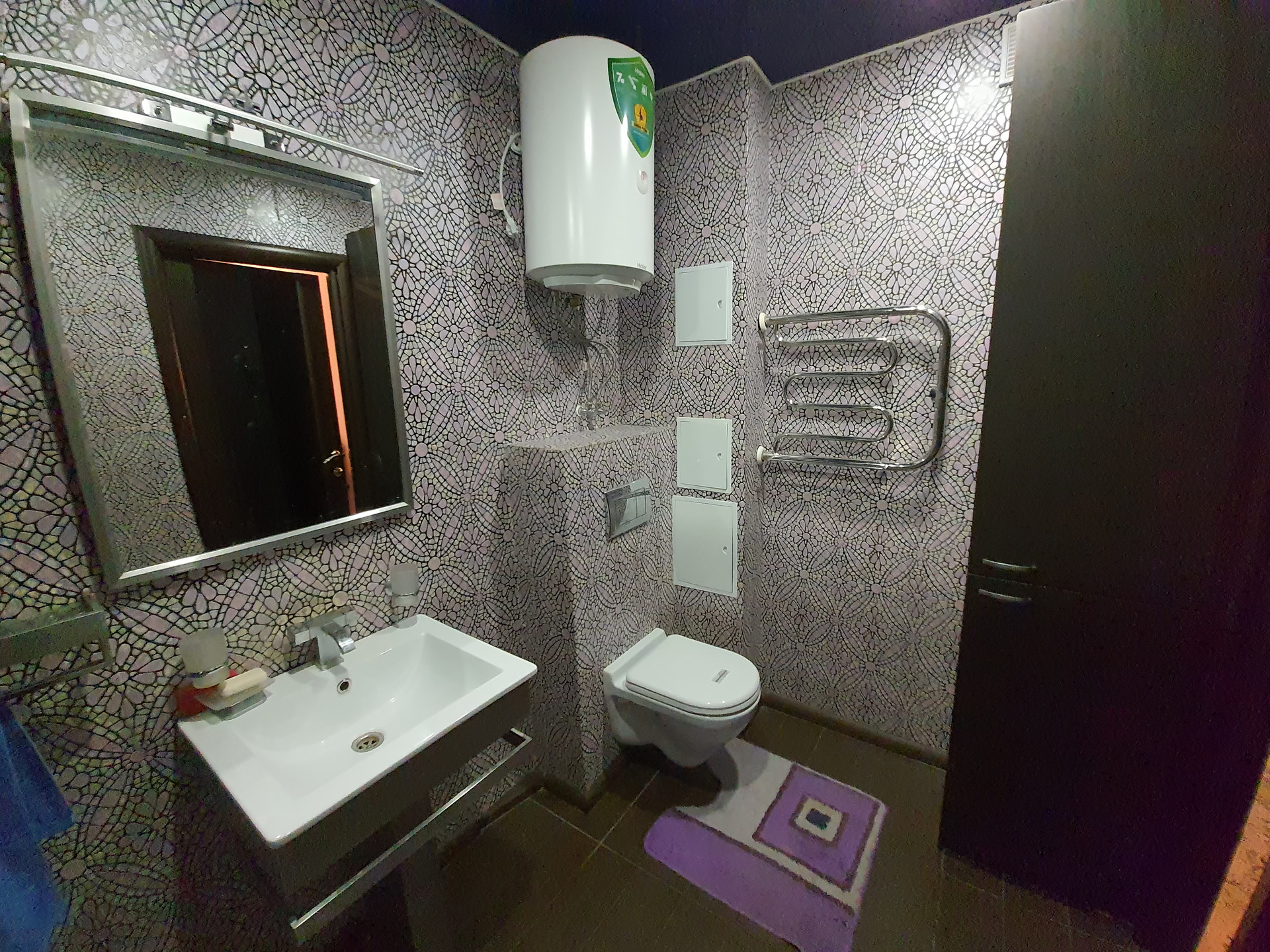 Санузел 1: ванна, совмещенная с душевой кабиной, унитаз с инсталляцией, водонагреватель накопительный, зеркало с подсветкой, шкаф для хозяйственных принадлежностей, полотенцесушитель из нержавейки – все остается в подарок покупателям!