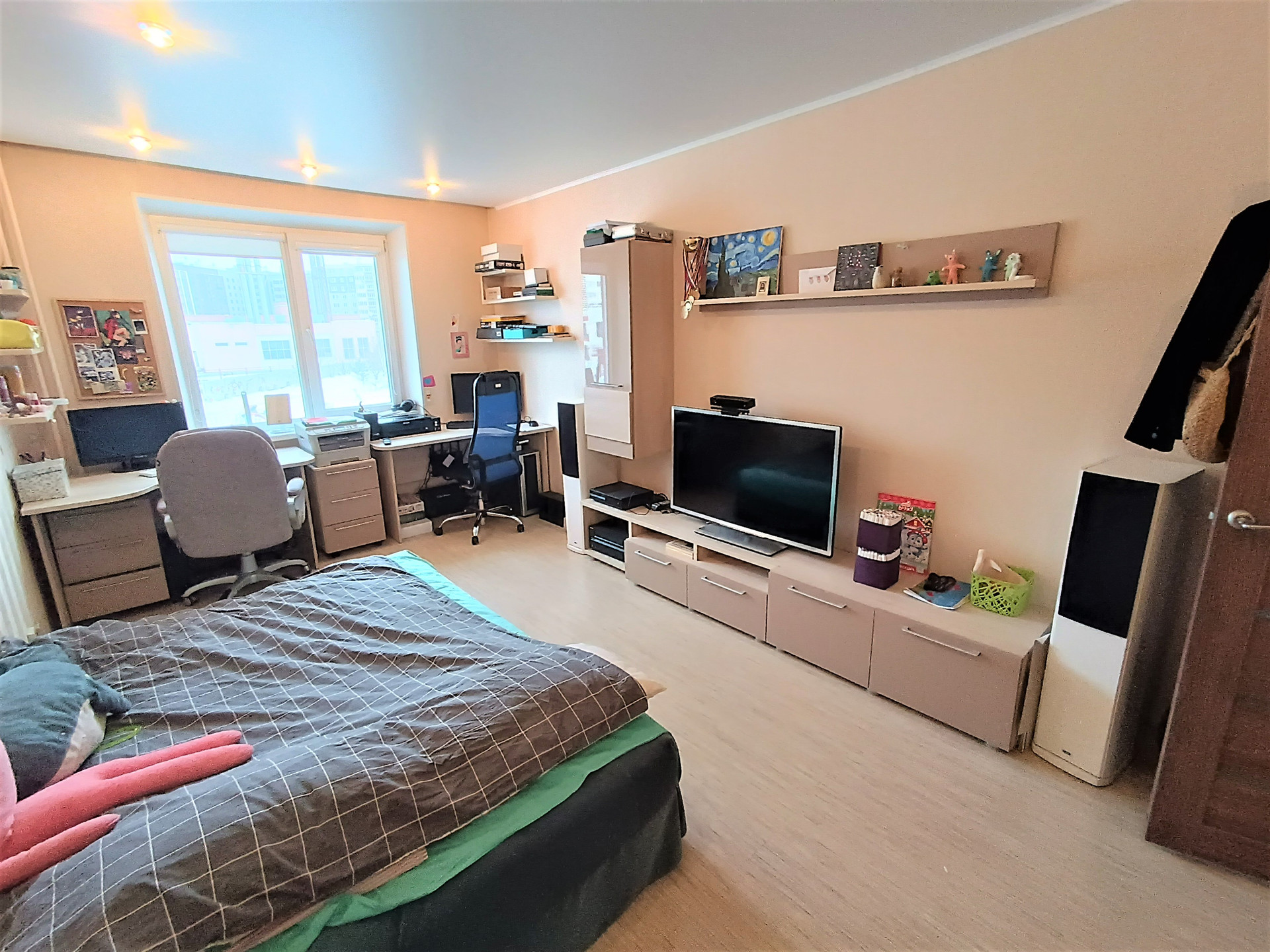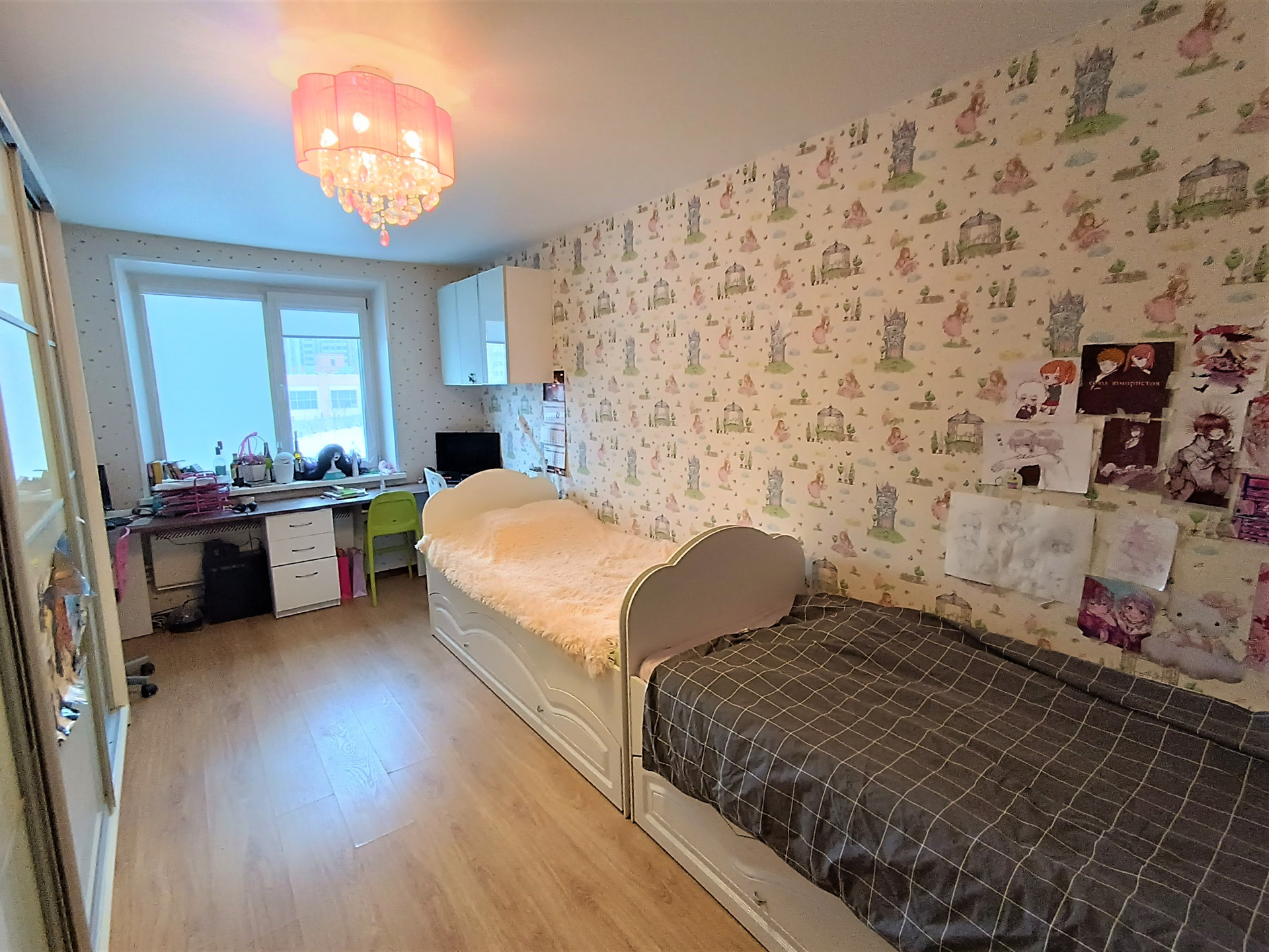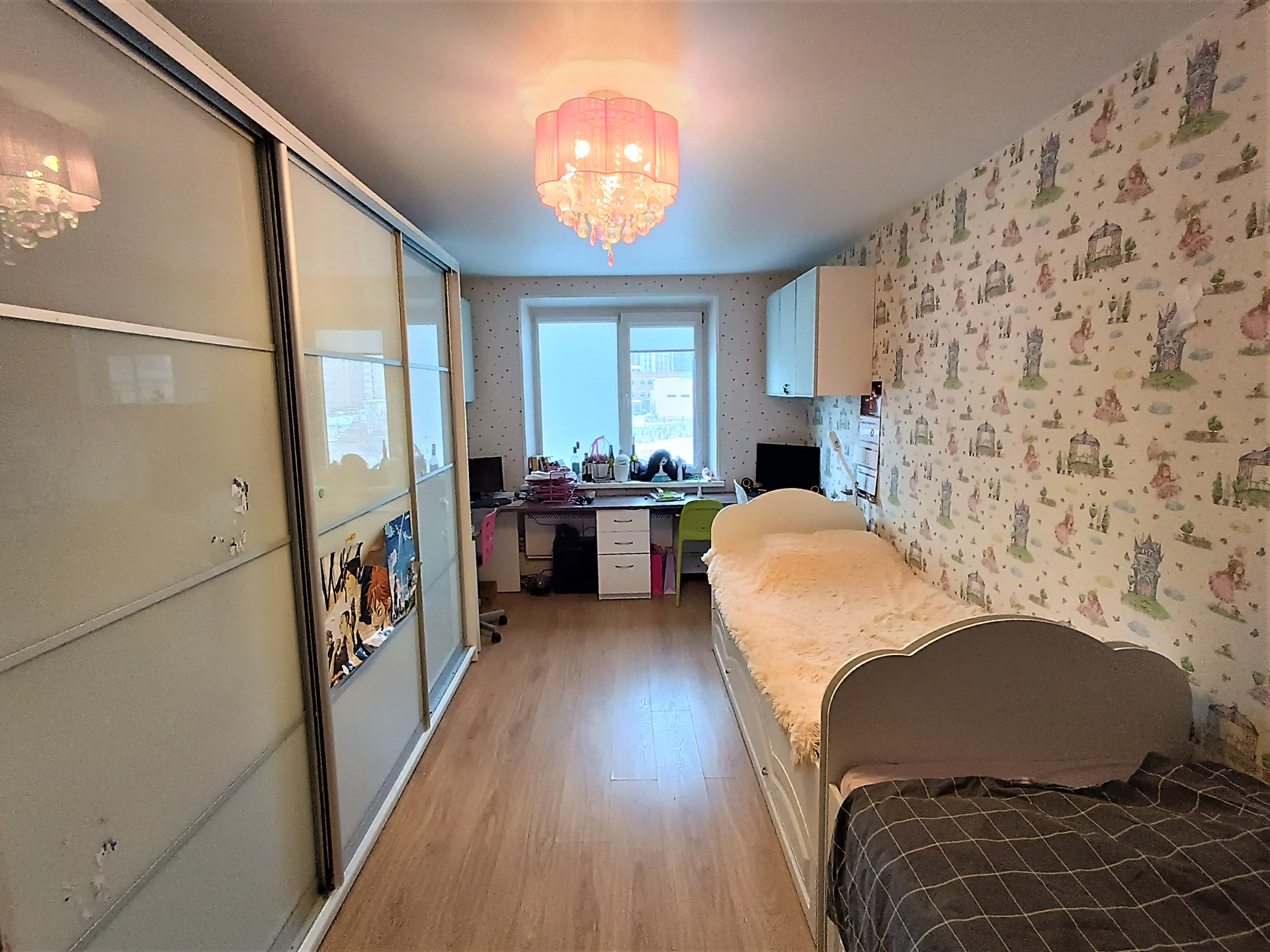 Полноценная 3 комнатная квартира с кухней 16 кв. метров. Комнаты выходят на разные стороны дома. Две комнаты (17 м) с окнами во двор, третья спальня (16 м) с балконом и видом на лес.