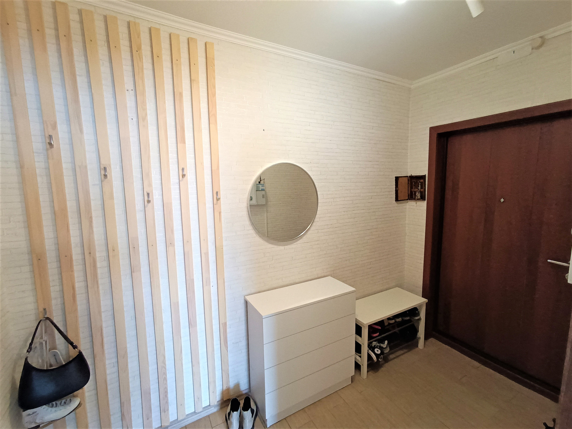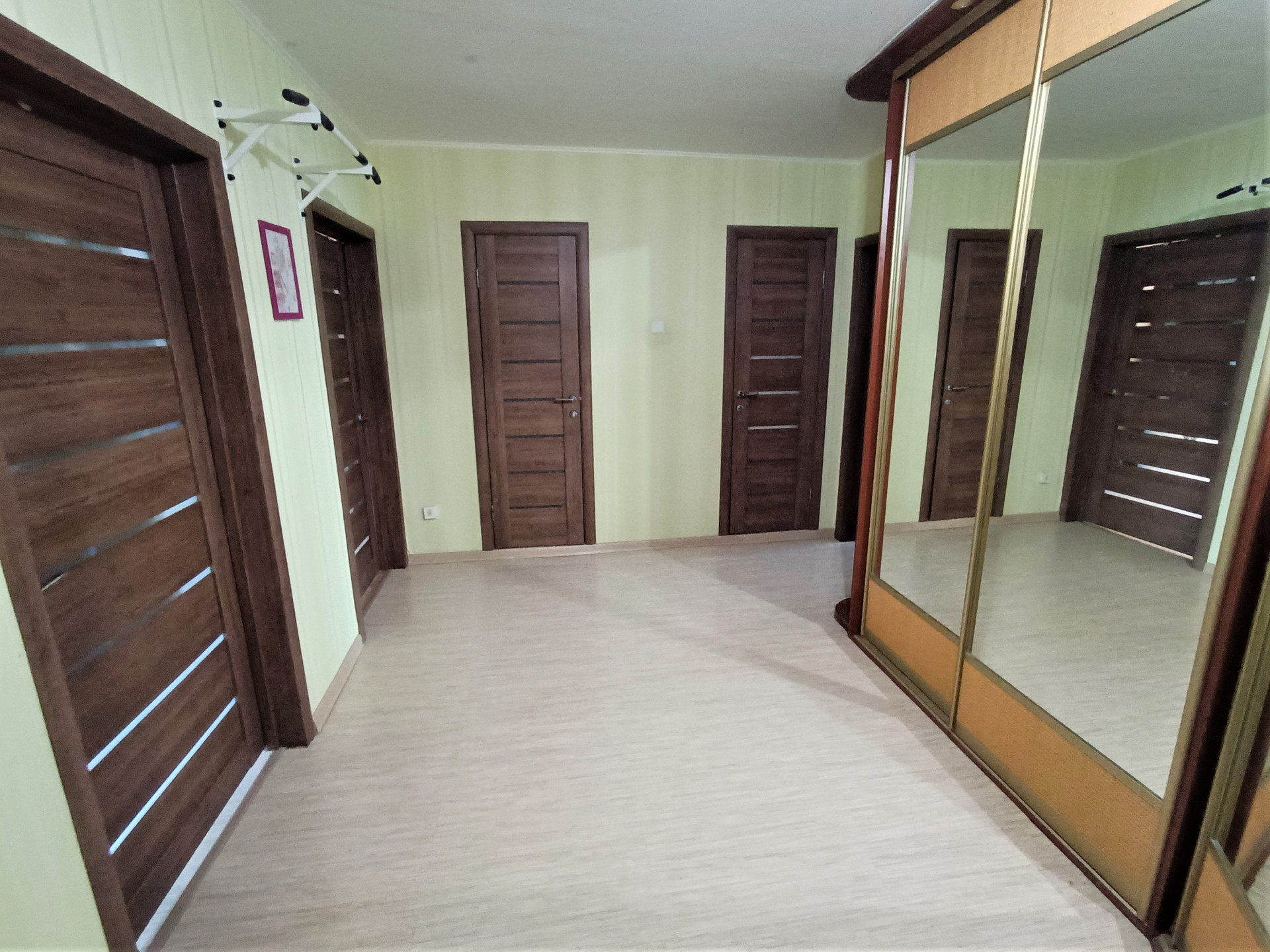 При входе в квартиру небольшой коридор (4 кв. м), далее вместительный - 14 кв. м. В большом холле есть возможность расположить зону отдыха, либо гардеробную.