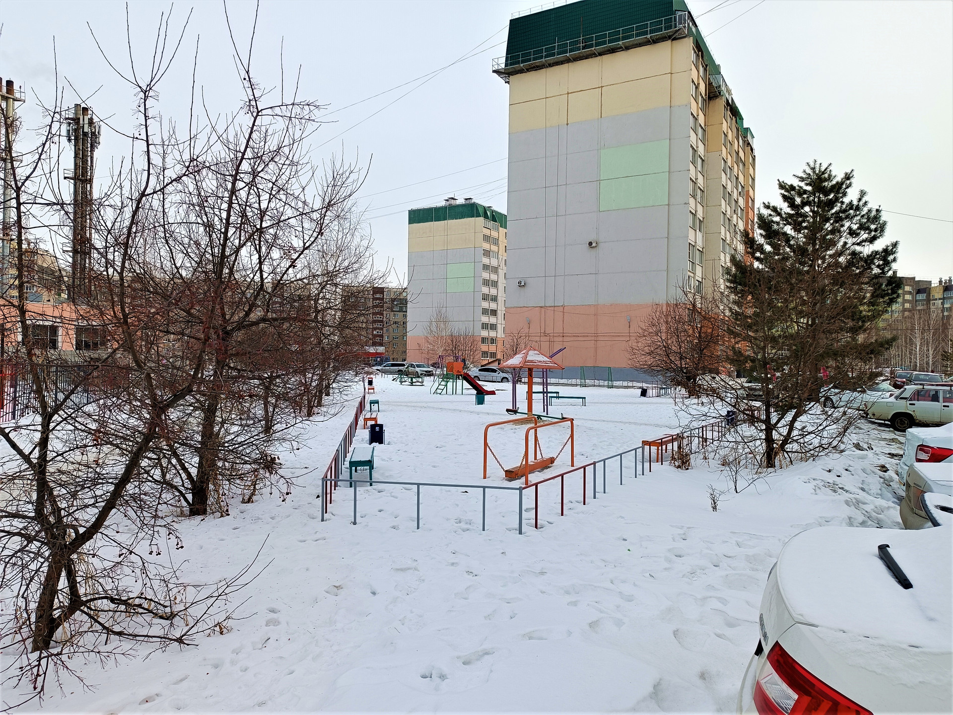 Во дворе хоккейная коробка (проводятся занятия с детьми), горка.