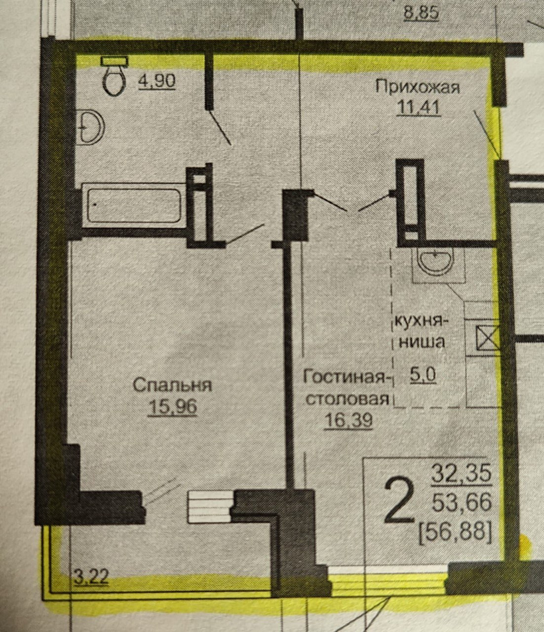 Общая площадь 56.88 м2