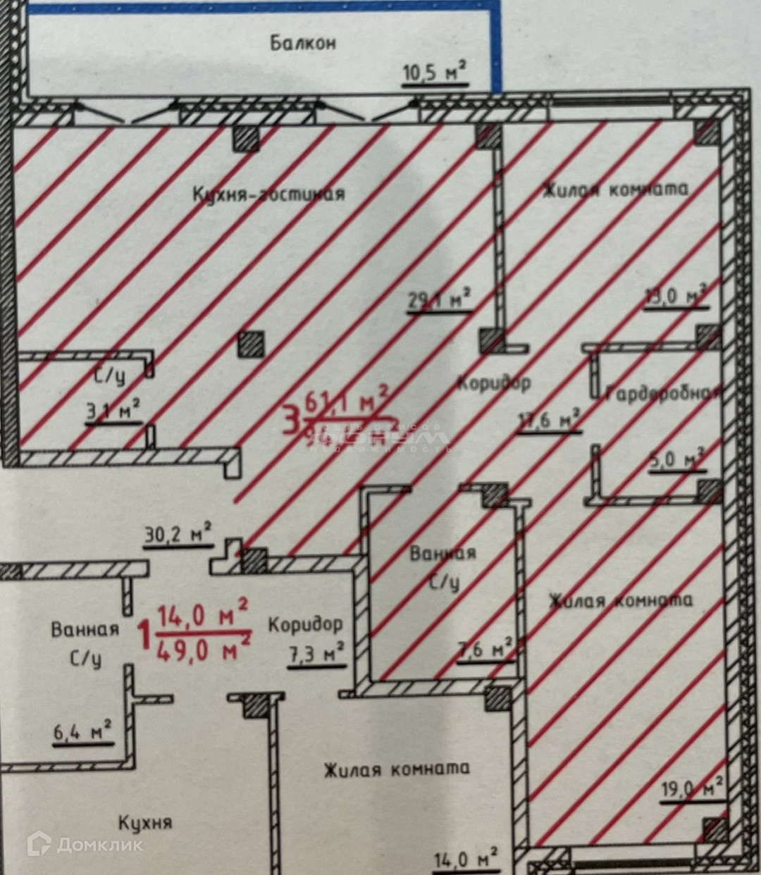 Жилая площадь 60.9 м2
