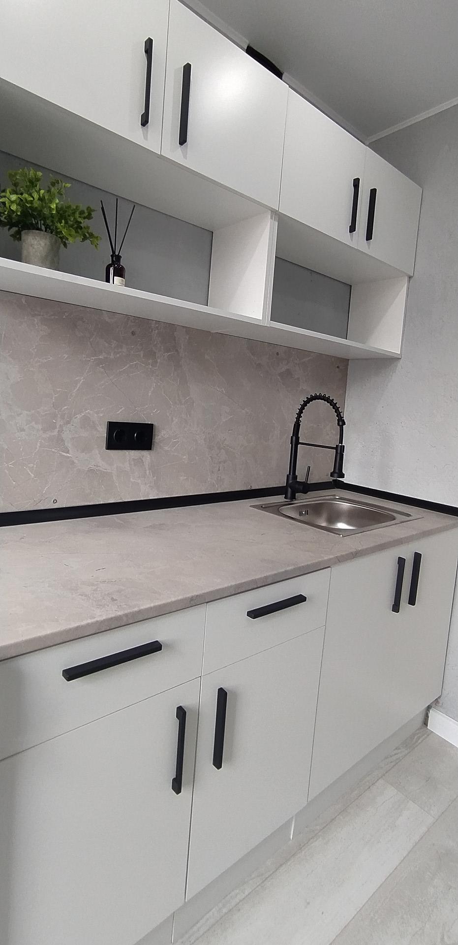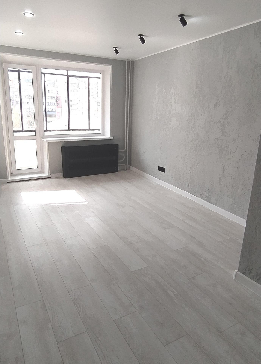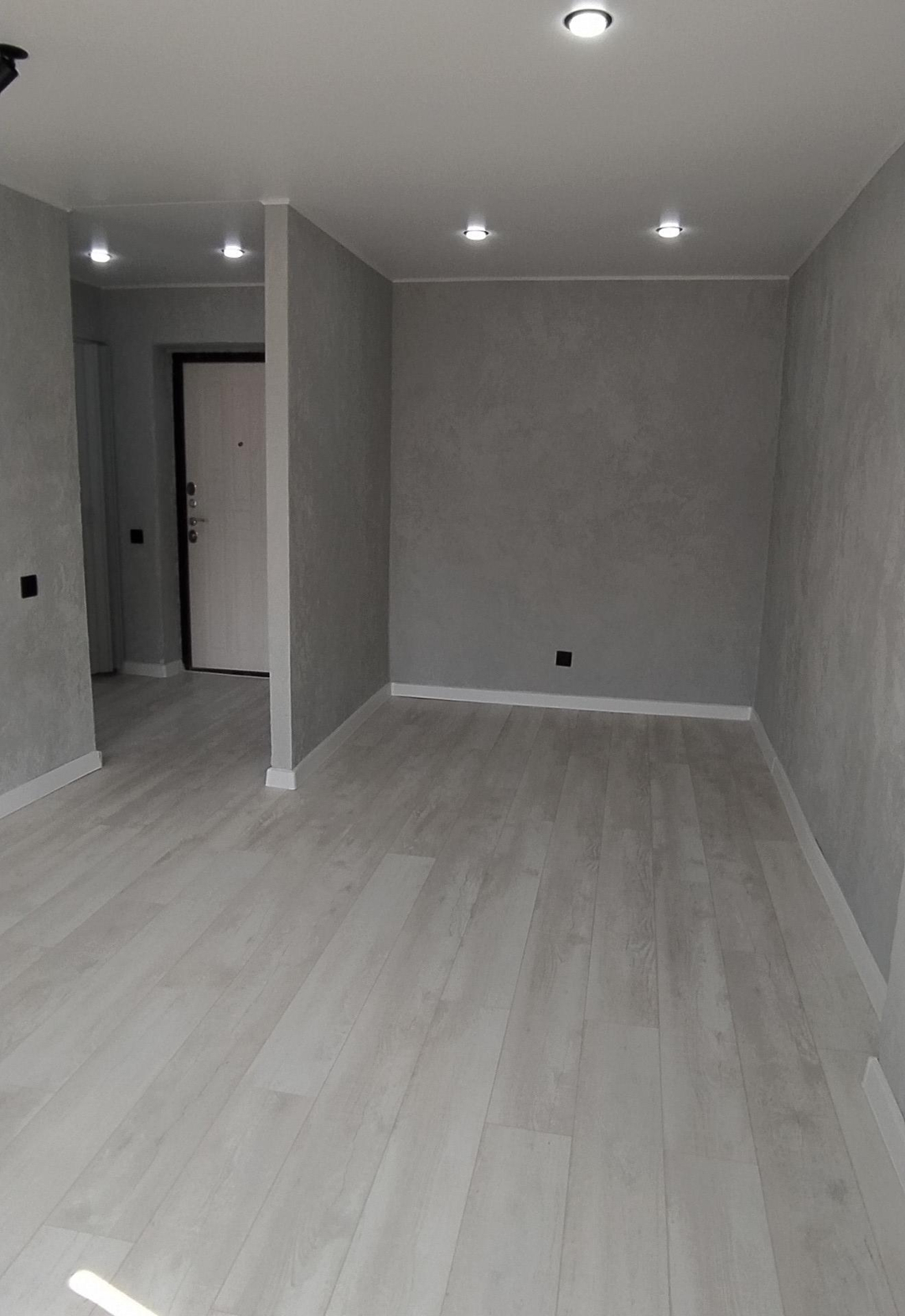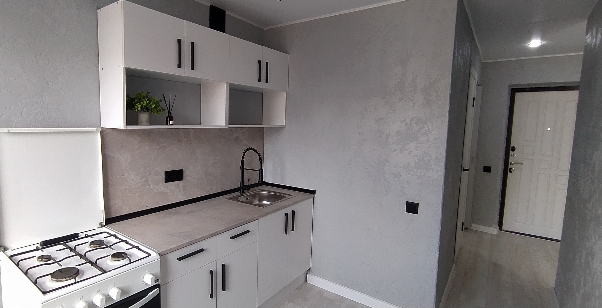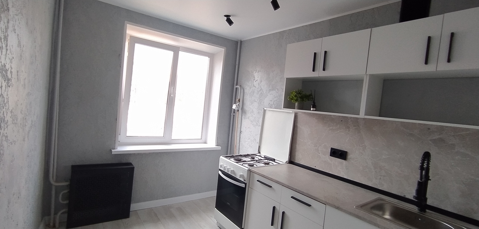 Качественный ламинат, евроокна, стены оформлены декоративной штукатуркой, межкомнатные двери, натяжной потолок с точечным освещением и направленными светильниками, в жилой комнате освещение зонировано,  красивая входная дверь, заменена проводка на медную, сантехника, трубы, санузел оформлен фактурными поверхностями под камень повышенной стойкости, подобрана качественная фурнитура. Для удобства покупателя уже установлен новый кухонный гарнитур.