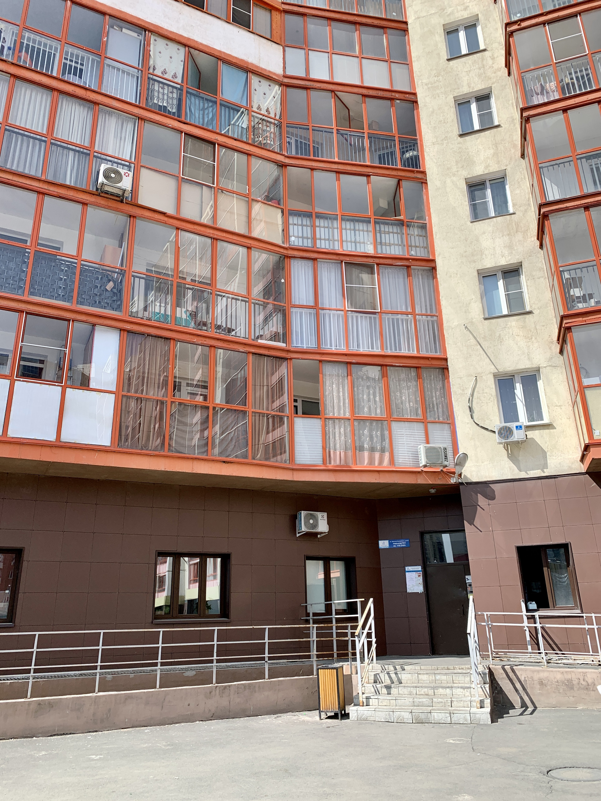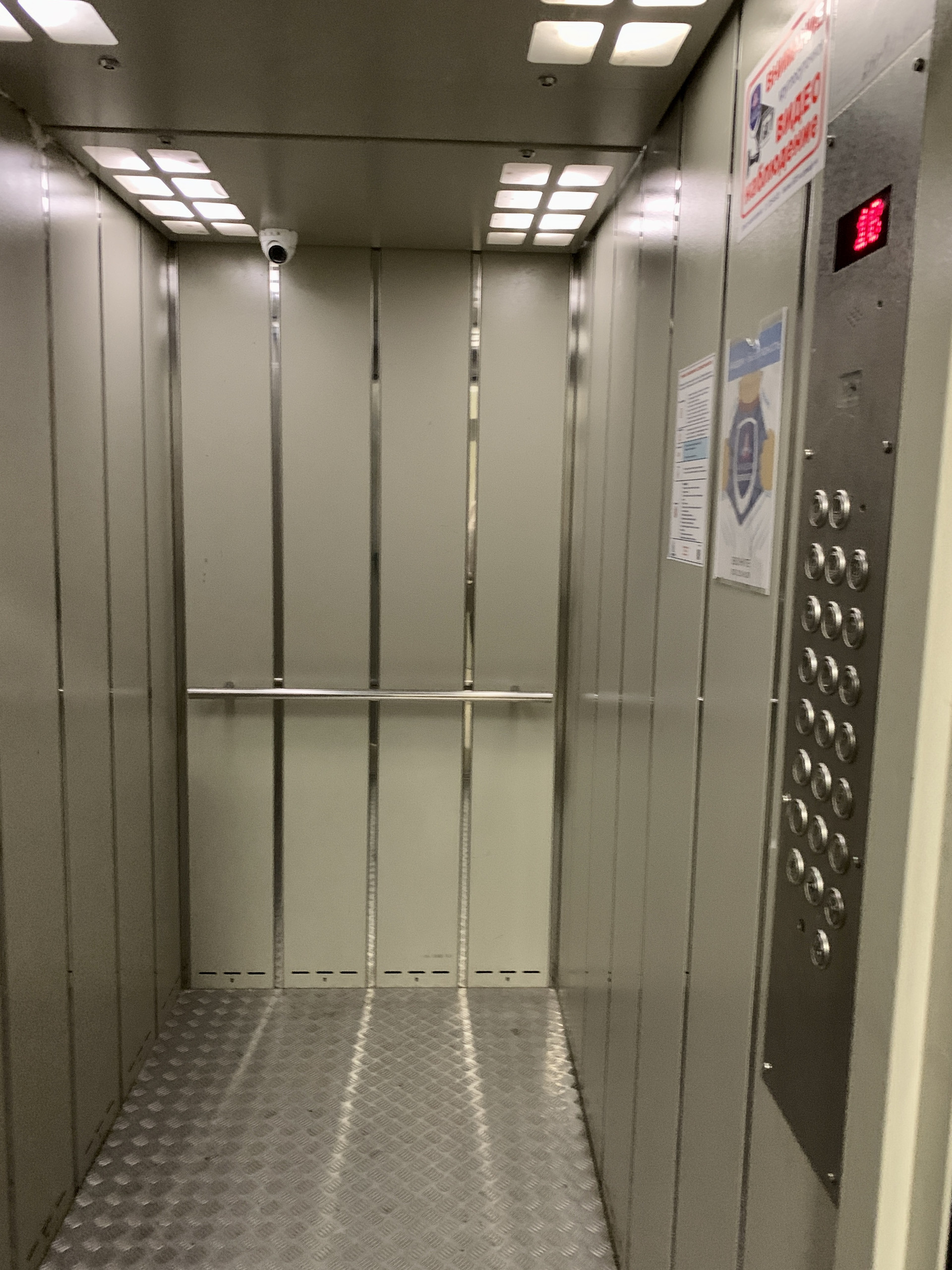 Два грузопассажирских лифта, видеонаблюдение. Два входа в подъезд - со двора и с Бр. Кашириных.