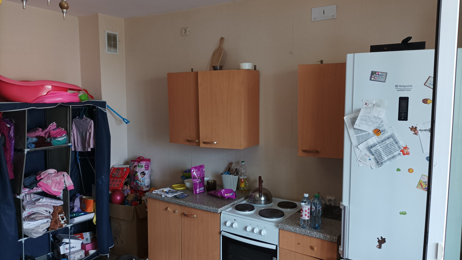 В квартире остается кухонный гарнитур и плита.