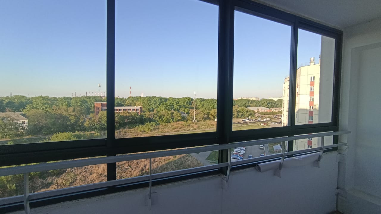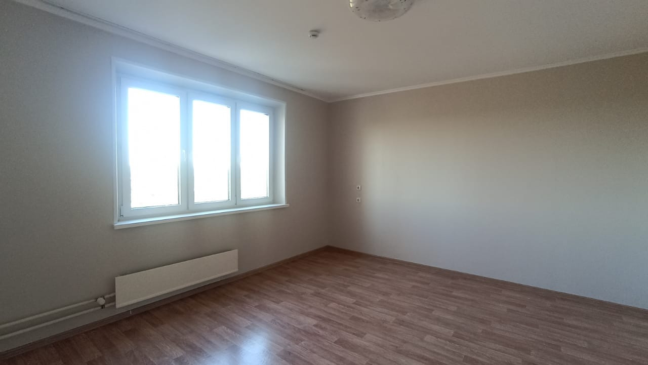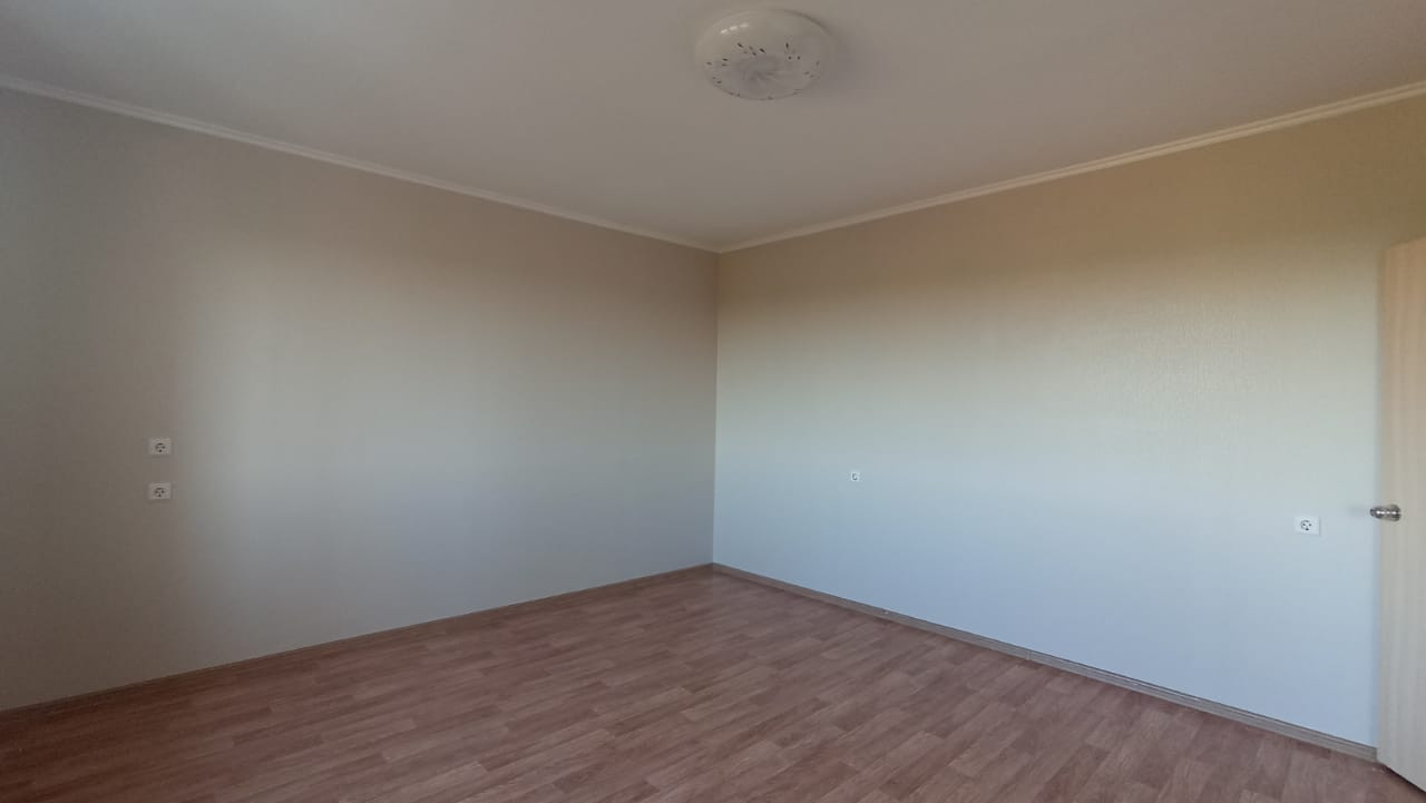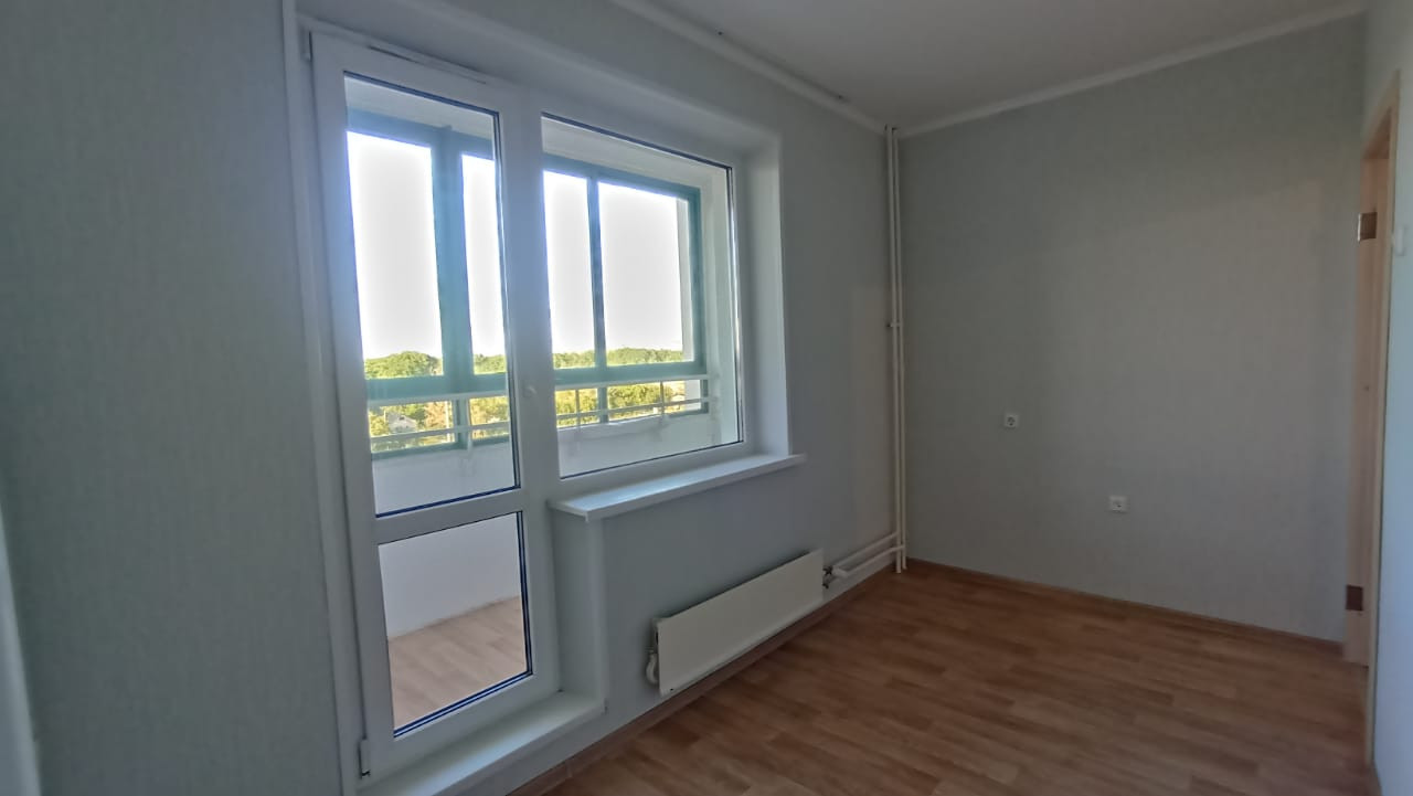 Светлая и солнечная квартира в хорошем состоянии, чистая и опрятная. Выполнен косметический ремонт. Удобная планировка, просторная квардратная комната площадью 17.9 м2. Кухня 8.9 м2. Вход в лоджию со стороны кухни.  Потолки окрашены. Все окна пластиковые. Межкомнатные двери - ламинированные. В комнатах наклеены обои  солнечных, теплых тонов. Пол застелен линолеумом. Санузел совмещен, в кафеле. Сантехника и коммуникации в хорошем состоянии. Установлены счетчики на воду. Остается душевая кабина. Балкон  застеклен пластиковыми стекло-пакетами.  Входная дверь - металлическая.