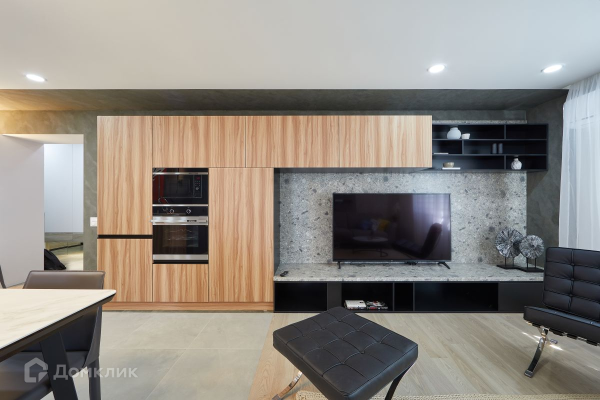 Большая студия, включающая в себя кухню, столовую зону и гостиную, вся бытовая техника встроенная и не выбивается из общего дизайна квартиры, а даже дополняет его. Встраиваемый холодильник Samsung - полный No Frost.
