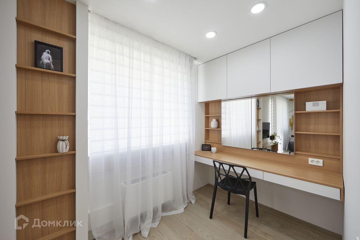 В отделке балкона применено только натуральное дерево. Проведен свет, выведены розетки. Справа углубление с обустроенным пространством, где имеется шкафчики, рабочая поверхность, стул и зеркала. Спальня и гостиная разделены межкомнатной стеклянной дверью (Aristo) из двух секций прячется в стену. Механизм синхронного открывания обеих секций