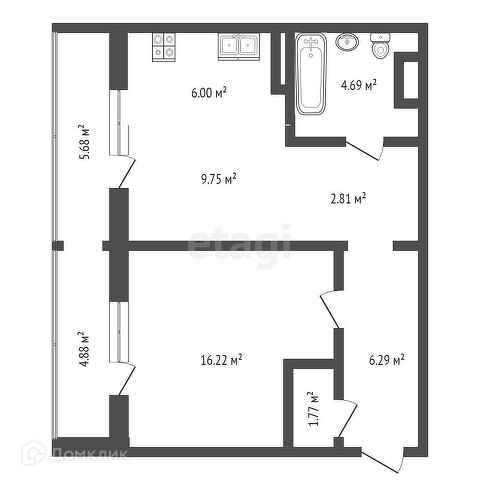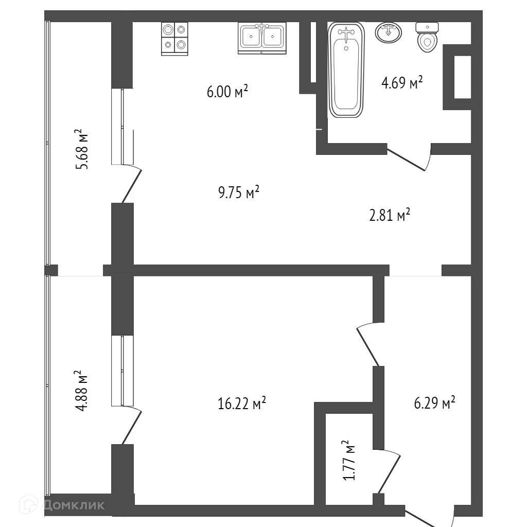 Кухня-Гостиная 15.84 кв.м. Спальня 16.62 кв.м. Ванная и сан узел совместный 4.69 кв.м. Коридор 2.81 кв.м. Прихожая 6.29 кв.м. Гардеробная 1.77 кв.м. Лоджия 2.84 и 2.44 кв.м.