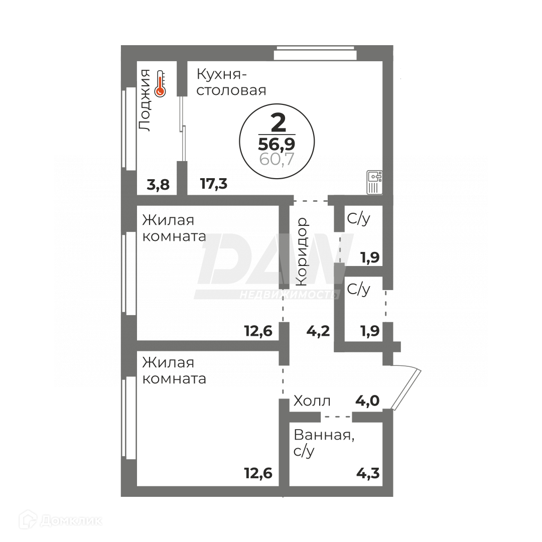 Общая площадь 56.9 м2