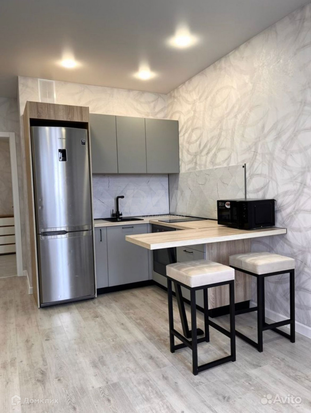 Мебель и техника: новый кухонный гарнитур в современном дизайнерском исполнении с барным столом и стульями, большой холодильник, духовой шкаф, варочная панель, микроволновая печь, стиральная машина, большой новый диван, платяной шкаф, прихожая. Заезжай и живи! Отличный вариант для инвестиций или для жизни молодой семьи.