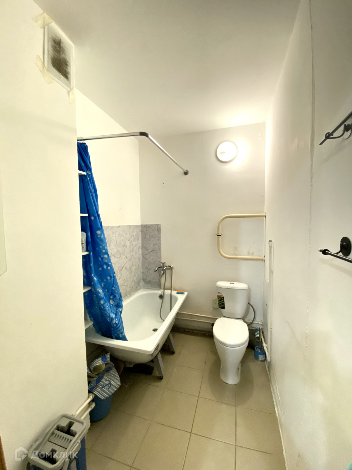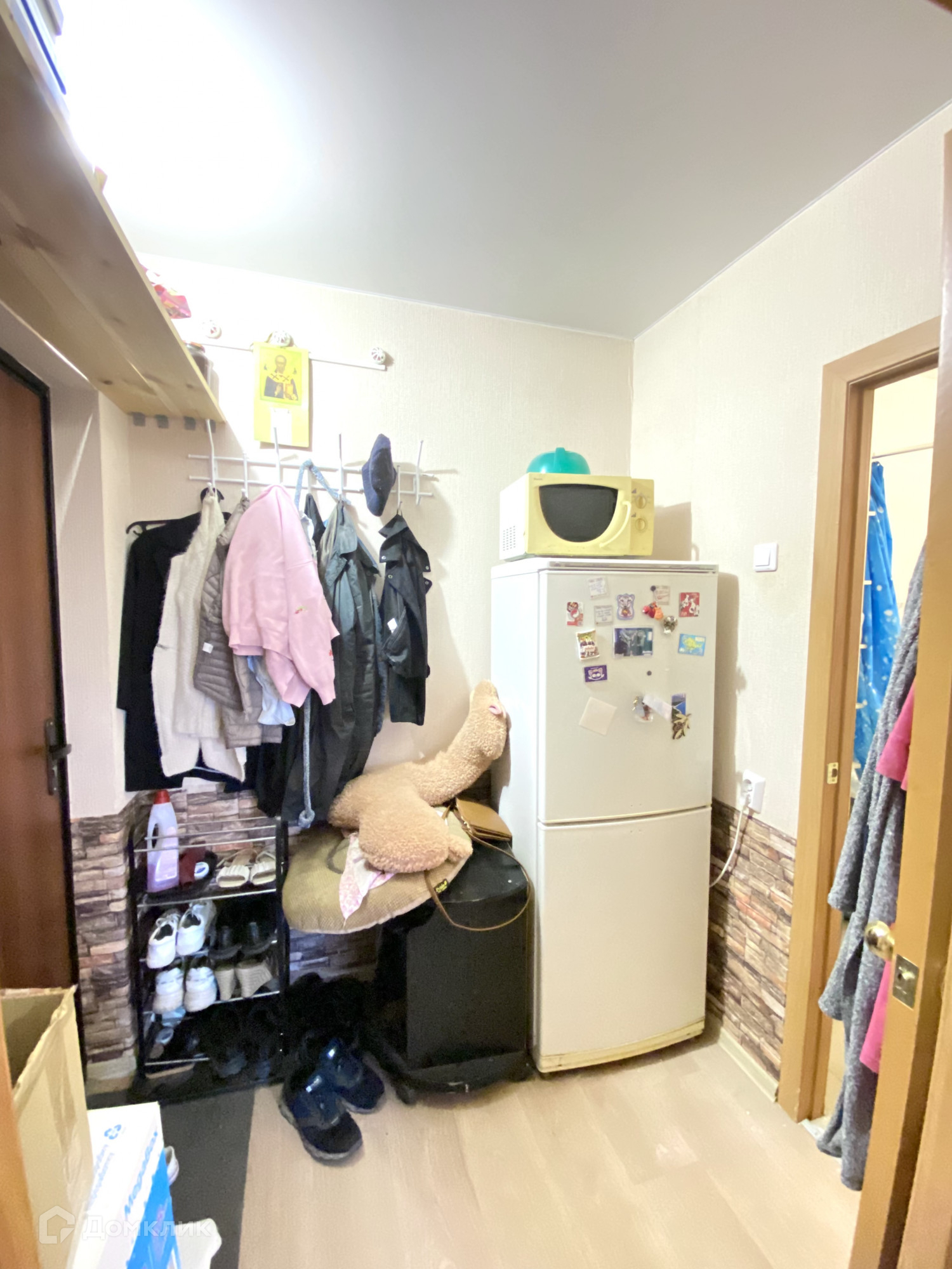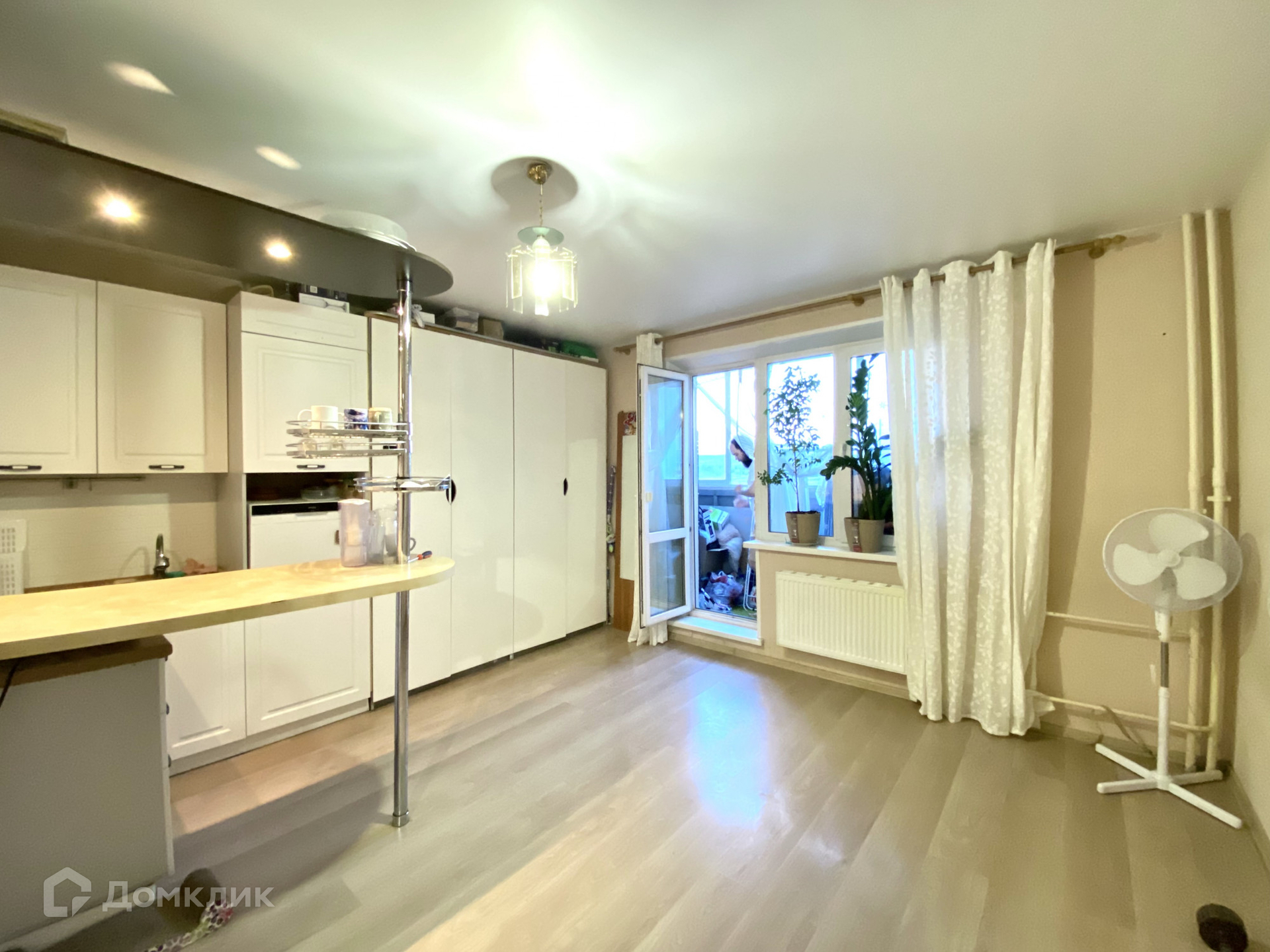 Санузел совмещенный. На полу кафель, стены окрашены. Из мебели остаются кухонный гарнитур, барная стойка, шкаф и холодильник , а также два стеллажа на балконе. Окна выходят во двор.
