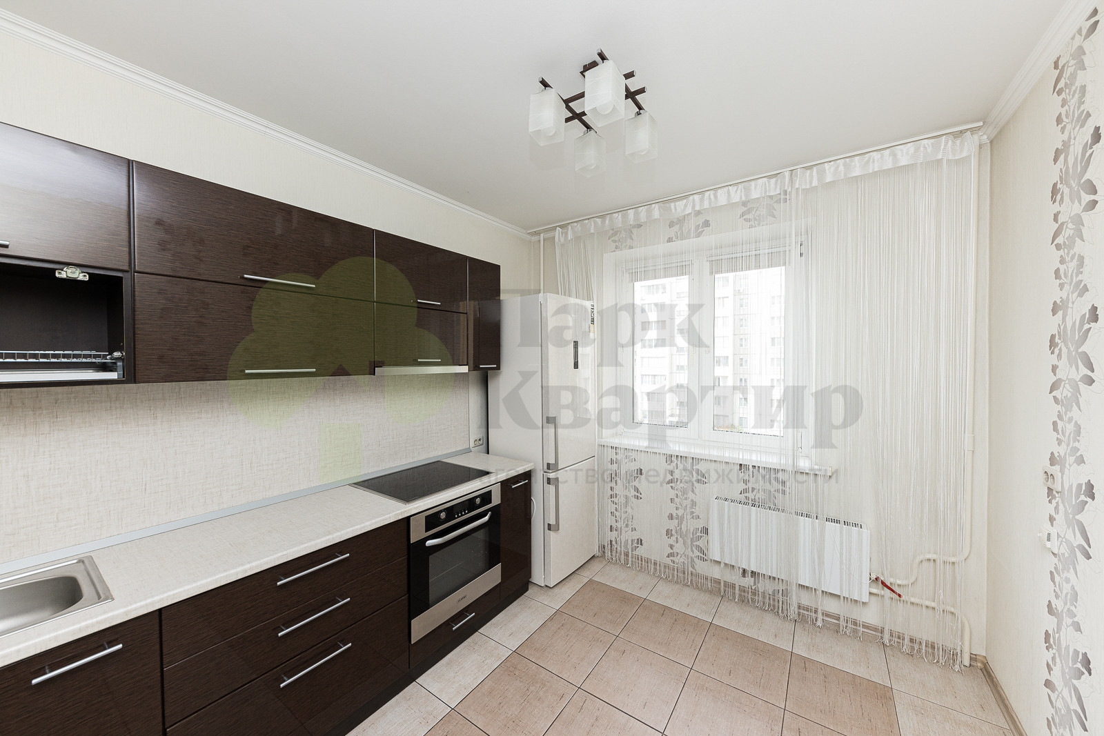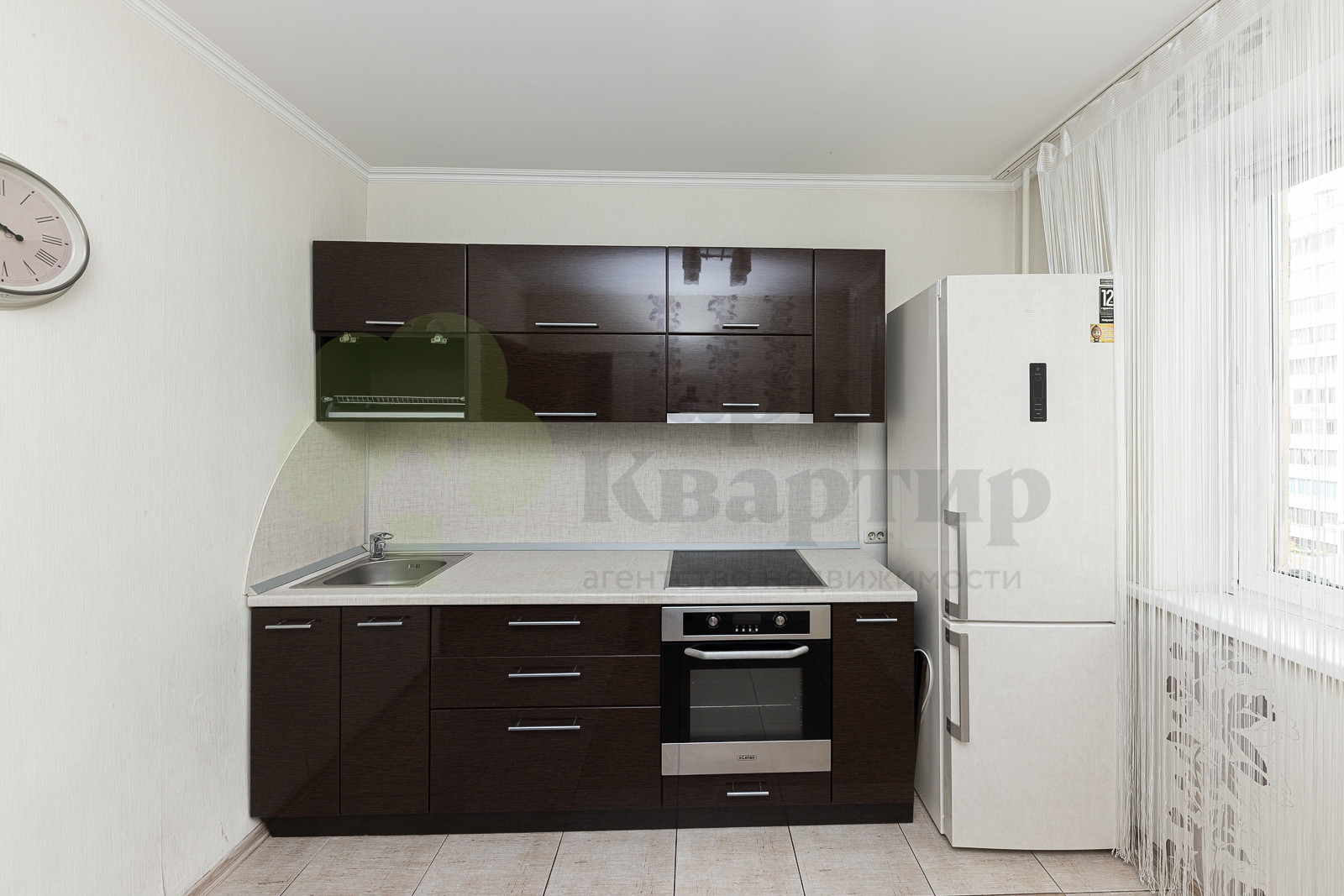 В подарок будущим жителям остается кухонный гарнитур с встроенной техникой, диван и большой шкаф в спальне.