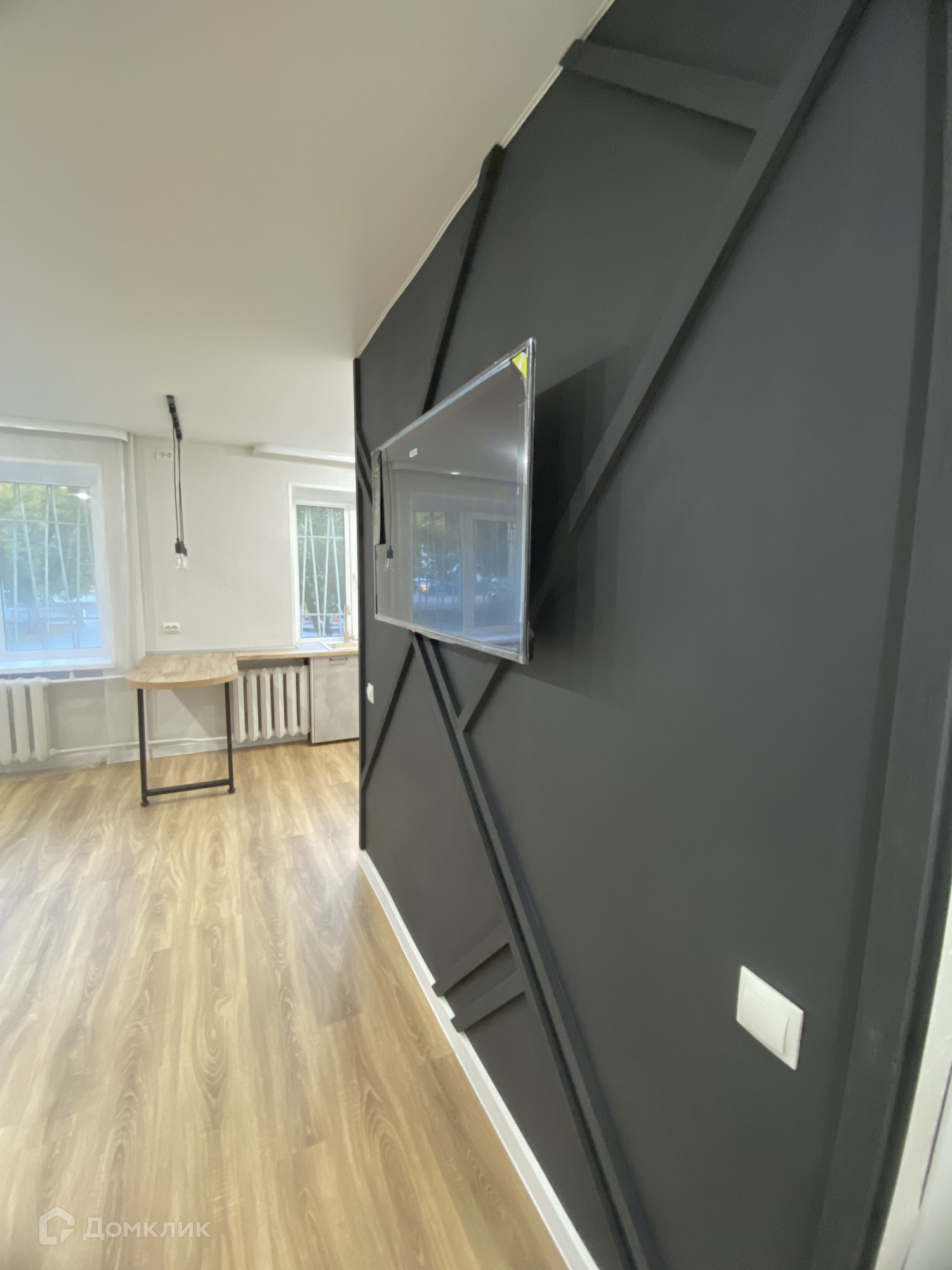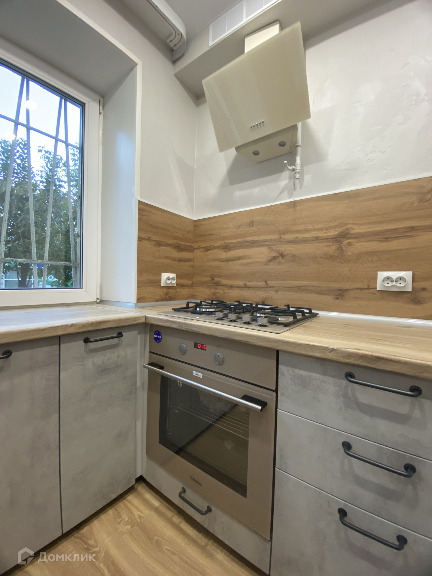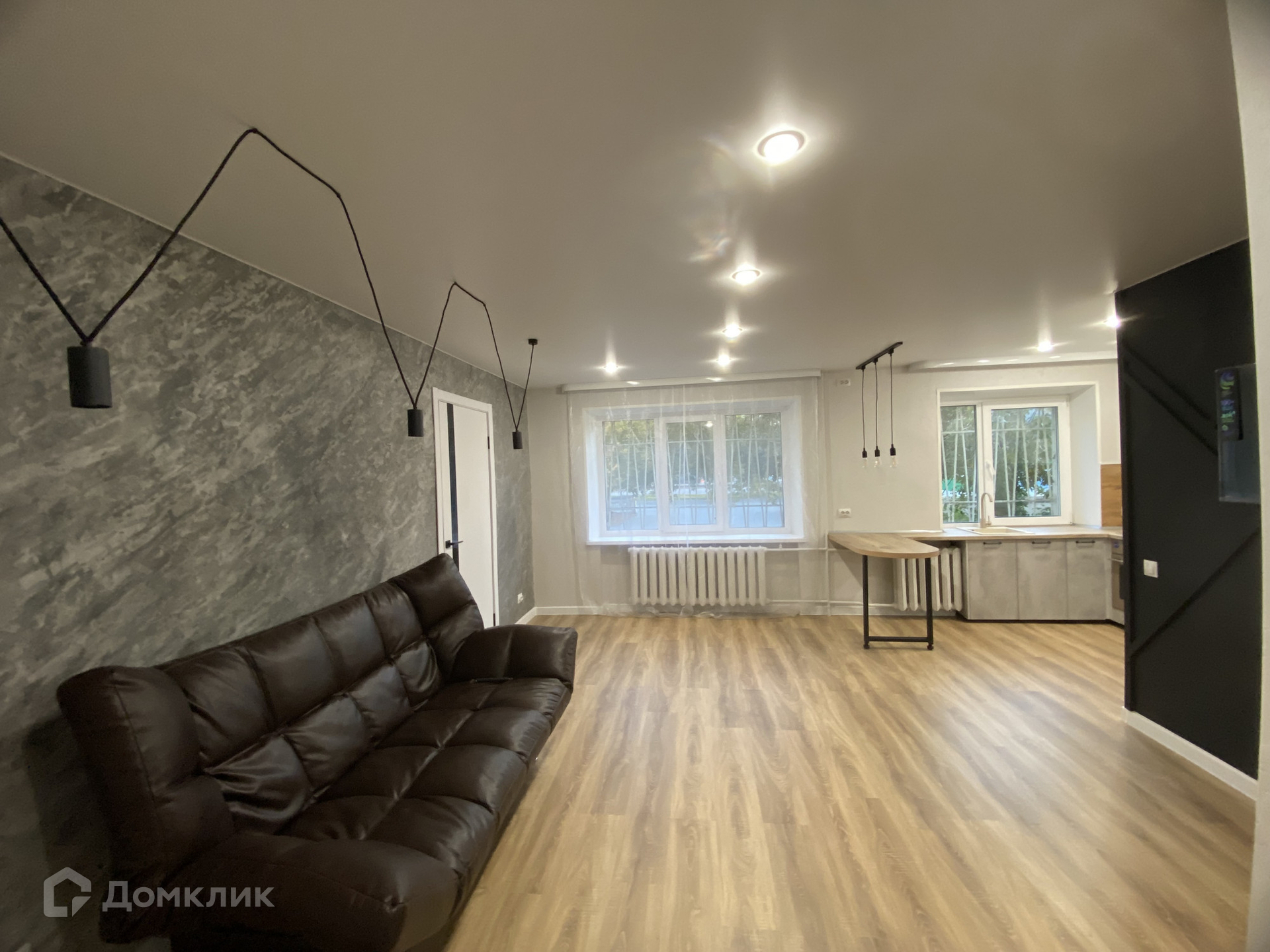 Пол-ламинат и керамогранит, стены -декоративная штукатурка, су- кафель/керамогранит. потолок-натяжной, новый кухонный гарнитур и техника.