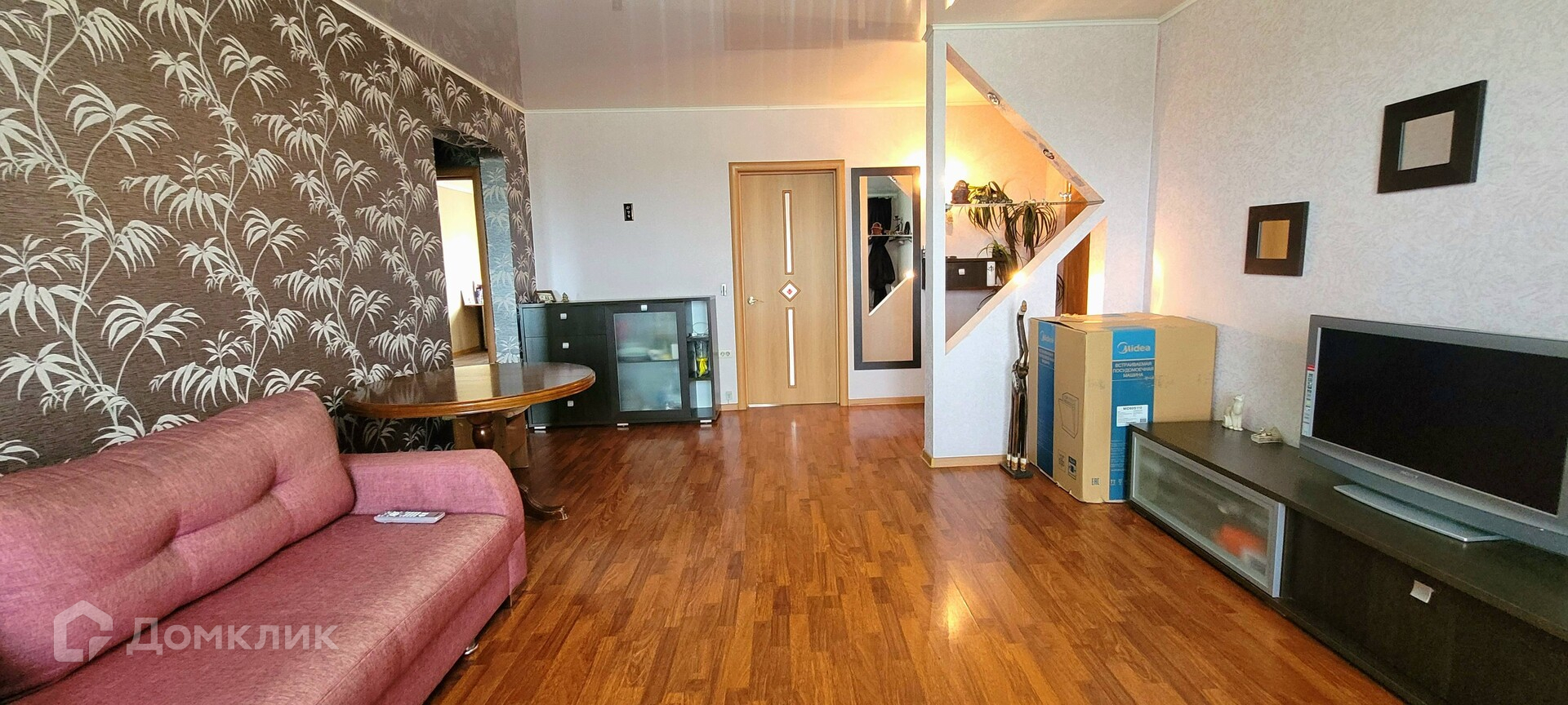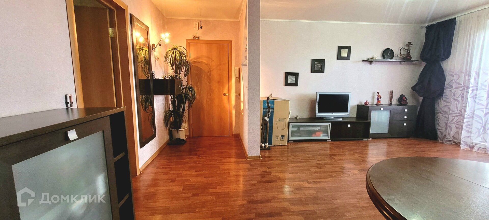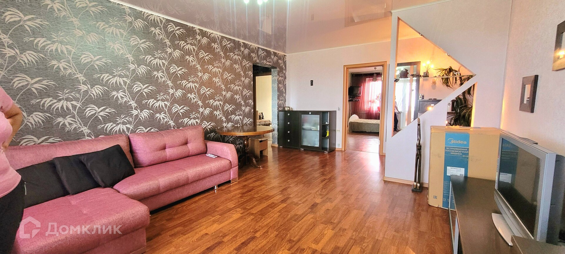 Большая гостиная, 2 спальни и кухня. Частично остаётся мебель. Лоджия застеклена, обшита вагонкой. Не успели еще доделать ремонт в кухне: снята плитка для новой, куплен линолеум. На входе оборудован карман, надёжная входная дверь.
