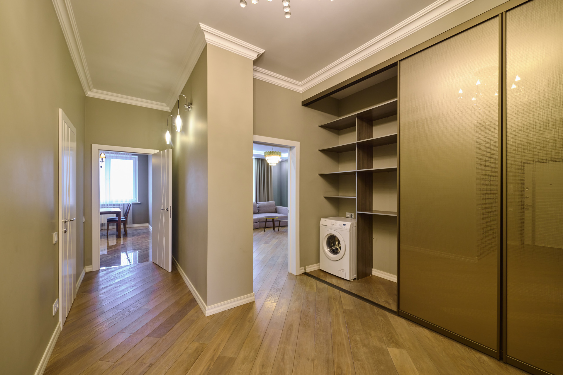 В просторной прихожей гармонично расположена гардеробная и шкаф для сезонной одежды.