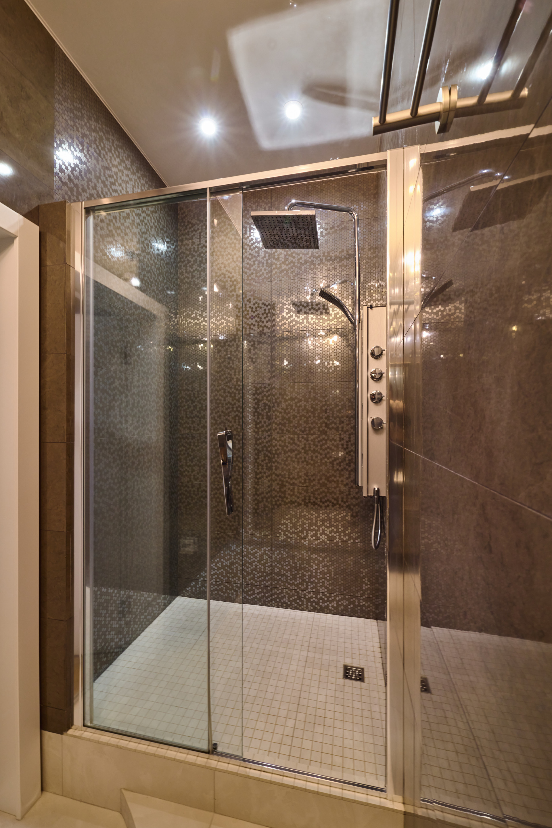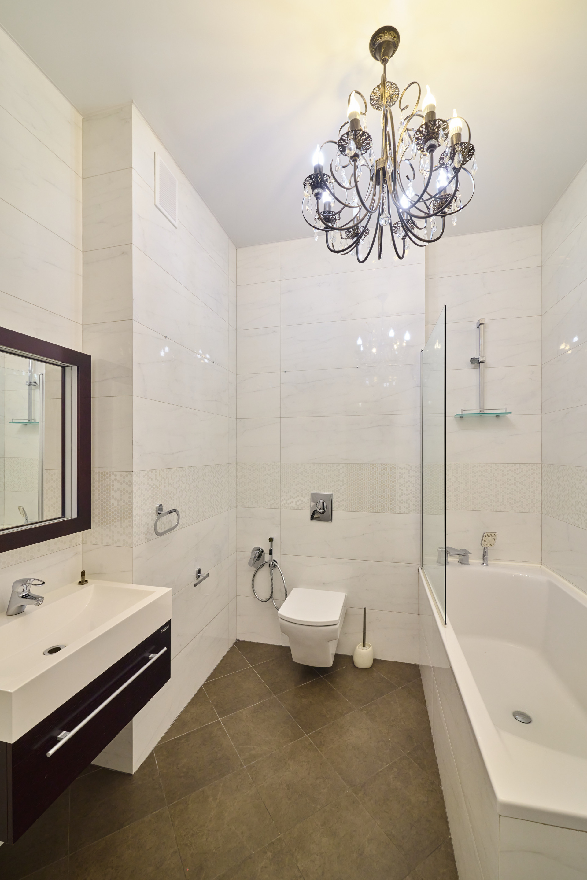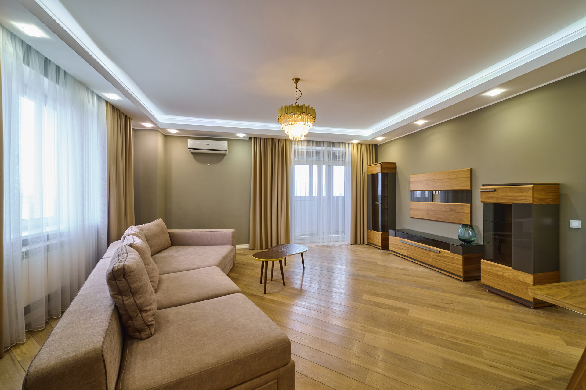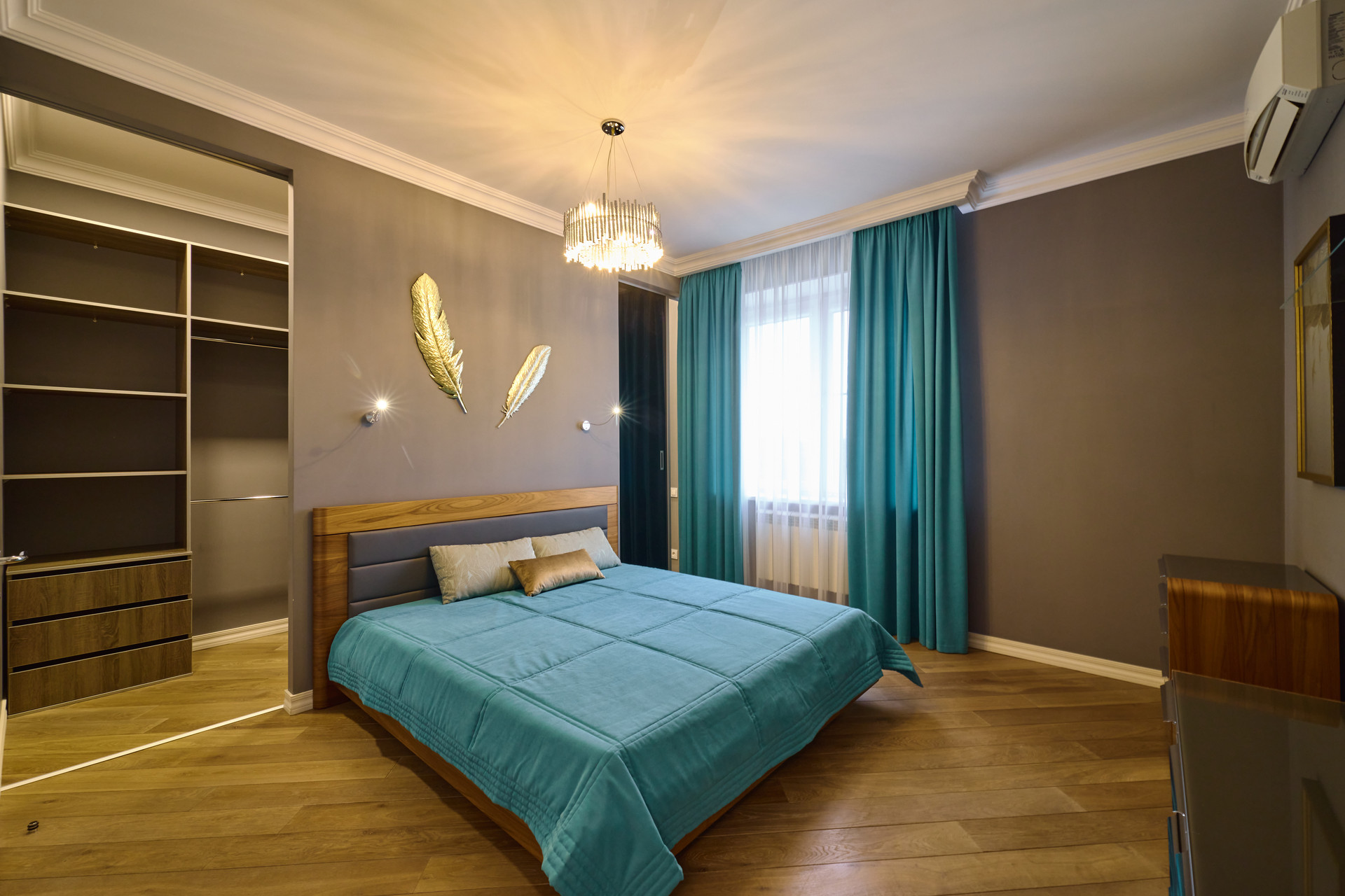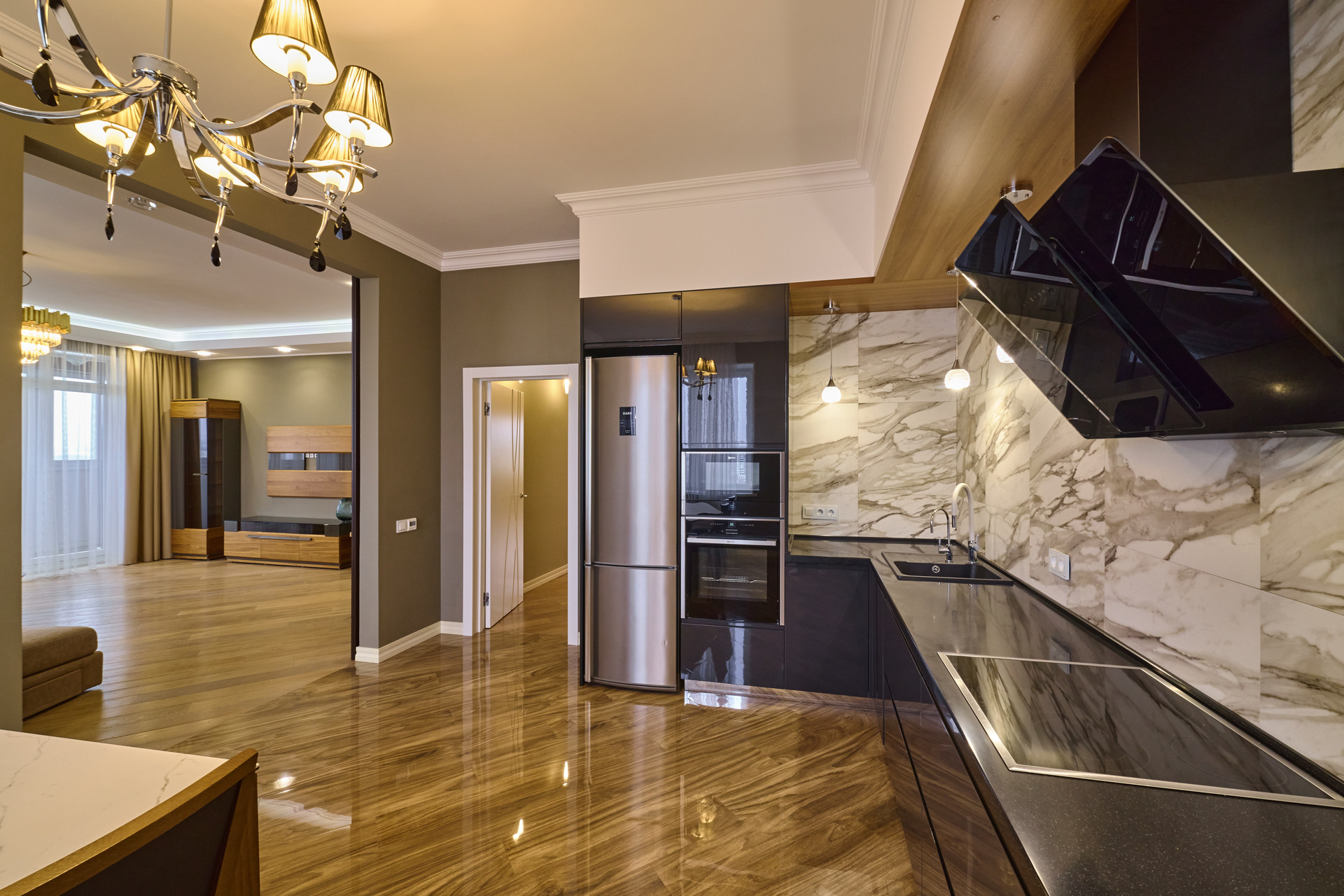 Отделка во всей квартире выдержана в одной стилистике, каждая деталь продумана. Использованы высокотехнологичные материалы. На полу натуральная дубовая доска, в кухонной зоне керамогранит с подогревом.  Стены окрашены. Двери производства Италии. Люстры из чешского хрусталя.