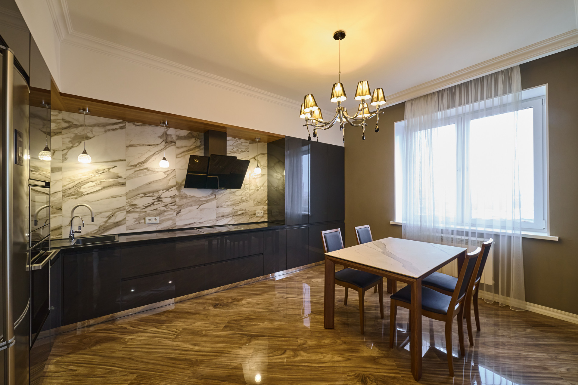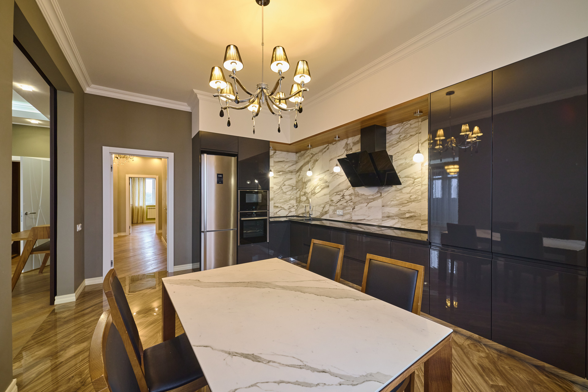 Кухонный гарнитур  «Ms.Doors» со встроенной техникой премиальных марок: варочная поверхность, духовой шкаф, микроволновая печь, посудомоечная машина -  «Neff», вытяжка  «Kuppersberg»,  холодильник «Aeg». Обеденный раздвижной стол с каменной столешницей.