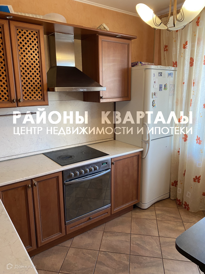 КУХНЯ: Просторная кухня с кухонным гарнитуром и встроенной техникой. Духовой шкаф, варочная панель, вытяжка, холодильник, обеденная зона. На полу качественная плитка.