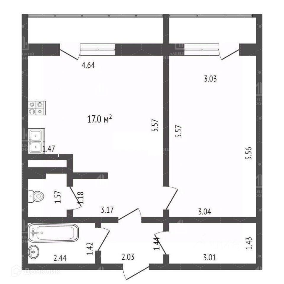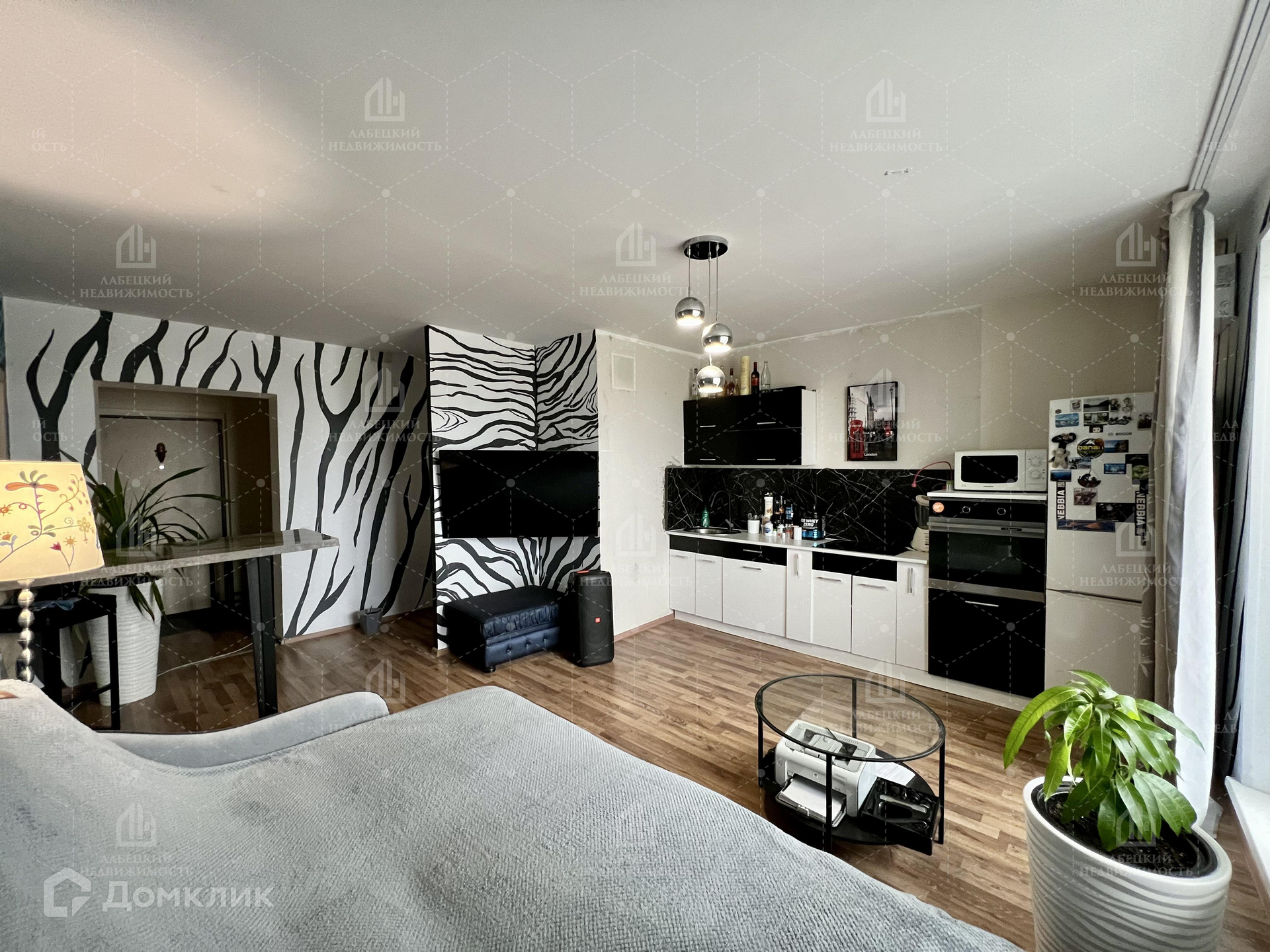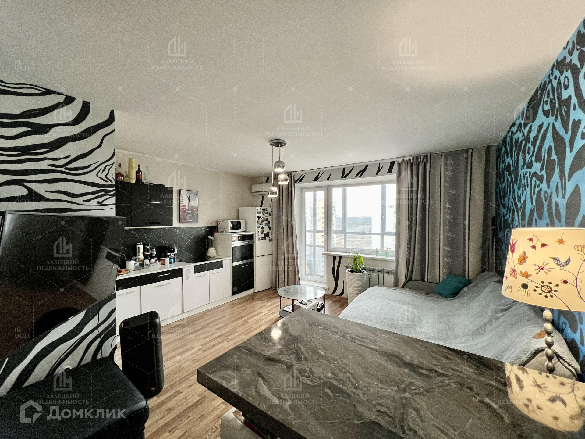 Прямо за прихожей находится основная ПРОСТОРНАЯ комната-студия (17.64 м2) с ЭРГОНОМИЧНОЙ кухонной зоной.  Стены комнаты-студии покрашены в дизайнерском стиле. Из комнаты есть выход на первый балкон (4.32 м2) с ПАНОРАМНЫМ остеклением и ПРЕКРАСНЫМ видом. Вторая комната (16.8 м2) ПРАВИЛЬНОЙ прямоугольной формы со светлыми обоями, при входе находится шкаф-купе с зеркальными дверцами. Из комнаты есть выход на второй балкон (2.82 м2). В квартире ДВА санузла. Один используется как ПОСТИРОЧНАЯ. Во втором санузле находится ванная с КРАСИВЫМ ДИЗАЙНЕРСКИМ ремонтом, плитка от пола до потолка, натяжной потолок с двумя режимами освещения. По всей квартире (кроме санузлов) на полу, выложен ламинат.