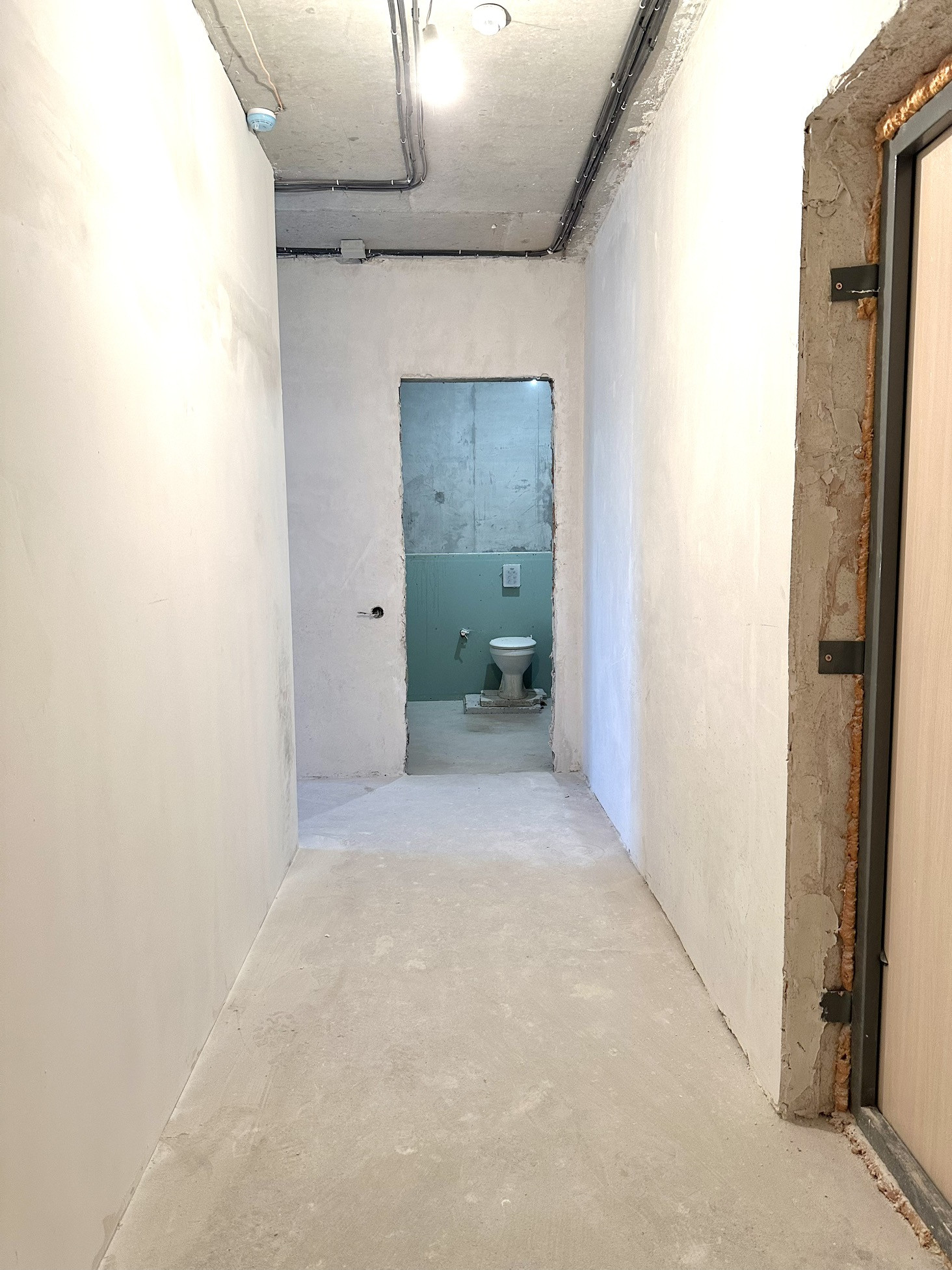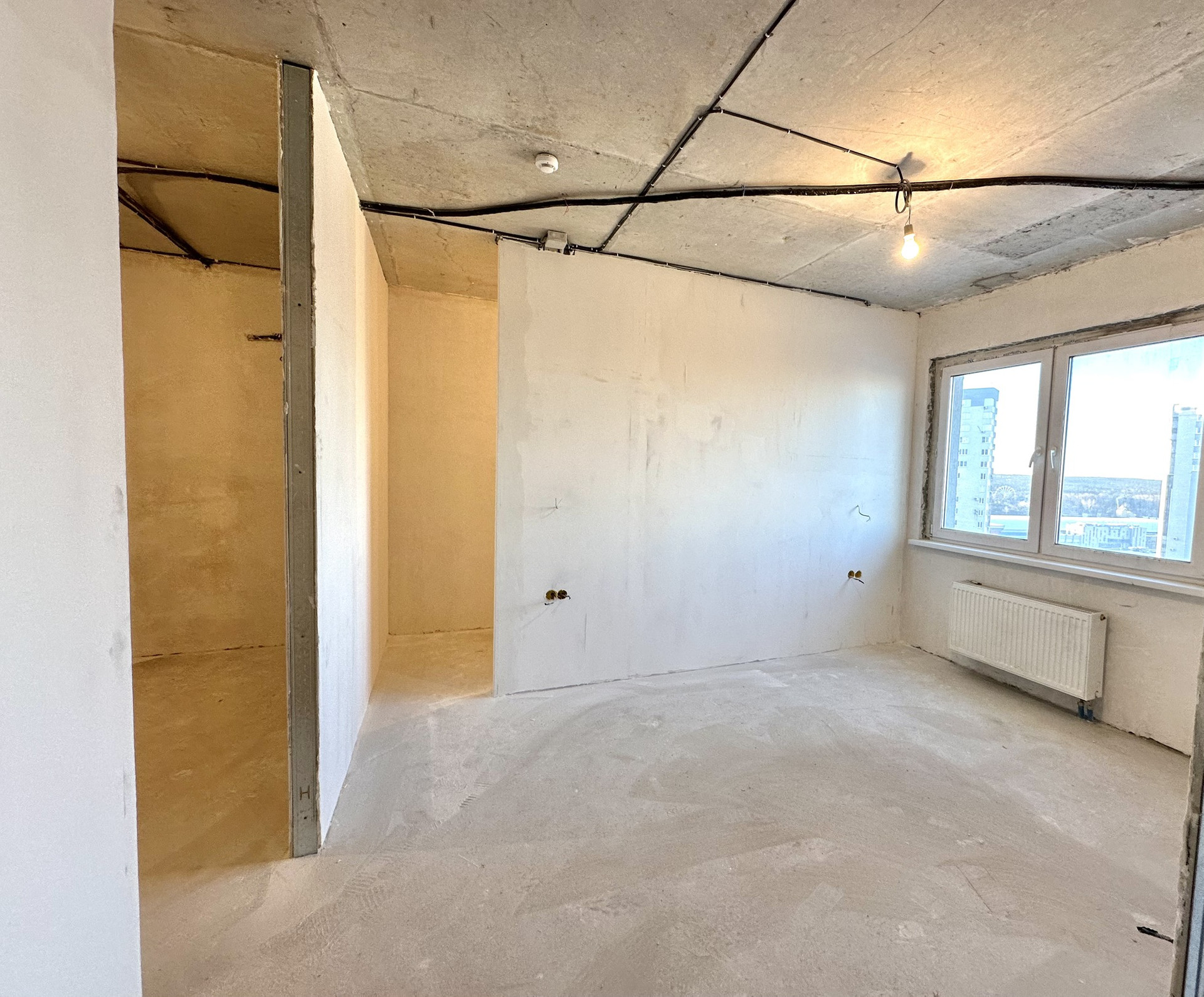 Выполнена предчистовая отделка (вариант для тех кто планирует сделать чистовую отделку по своему вкусу): возведение стен, стены заштукатурены, эл.проводка (предусмотрены переключатели , теплый пол в сан.узле, 2 трассы для кондиционеров в гостиной и комнате (слив конденсата в канализацию), выполнена разводка труб водоснабжения .