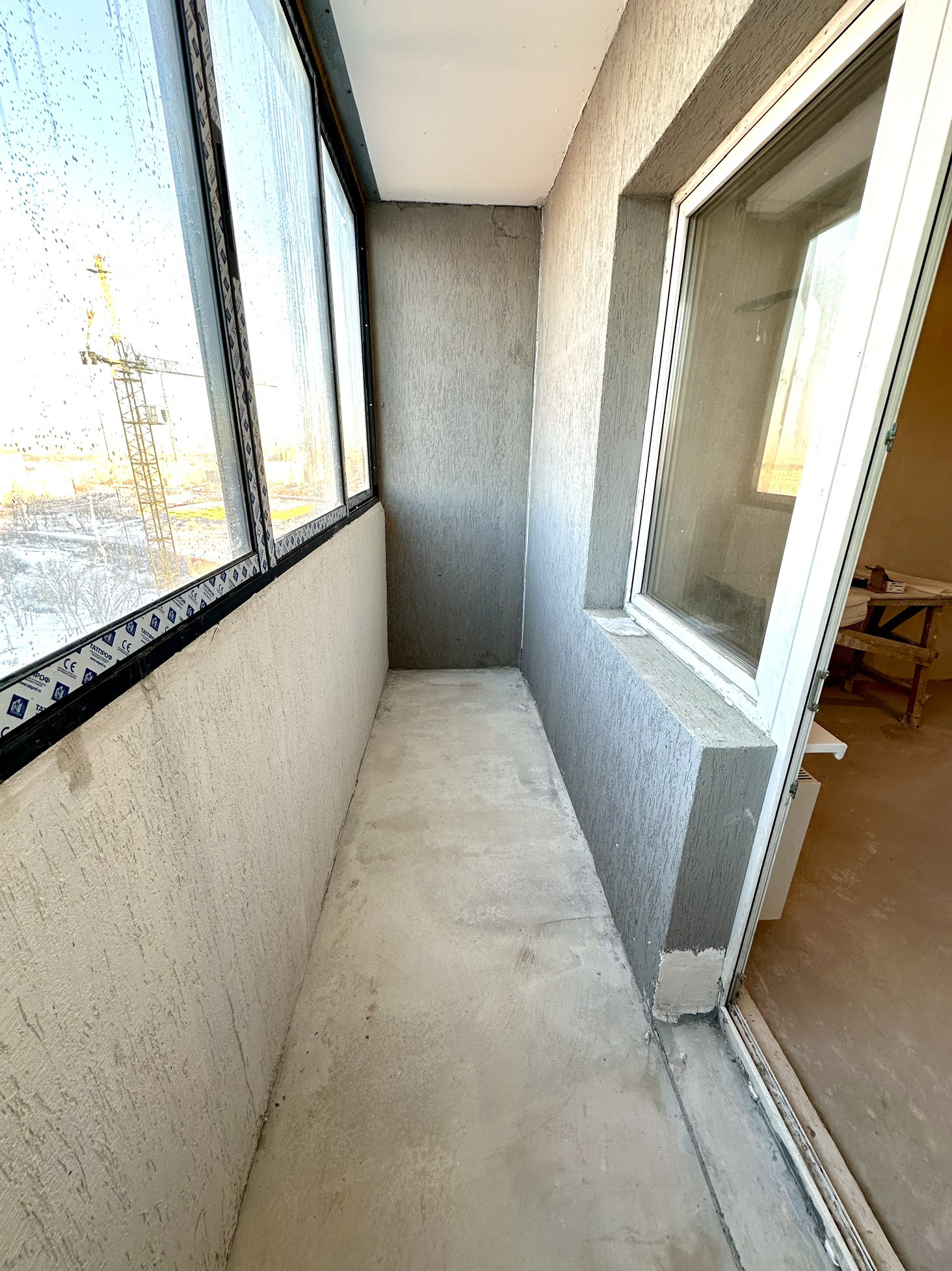 Убран высокий порог между гостиной и выходом на балкон. Балкон: утеплен, замена балконной двери, штукатурка «короед», пол подняли, стяжка пола выполнена, установлены подоконники.