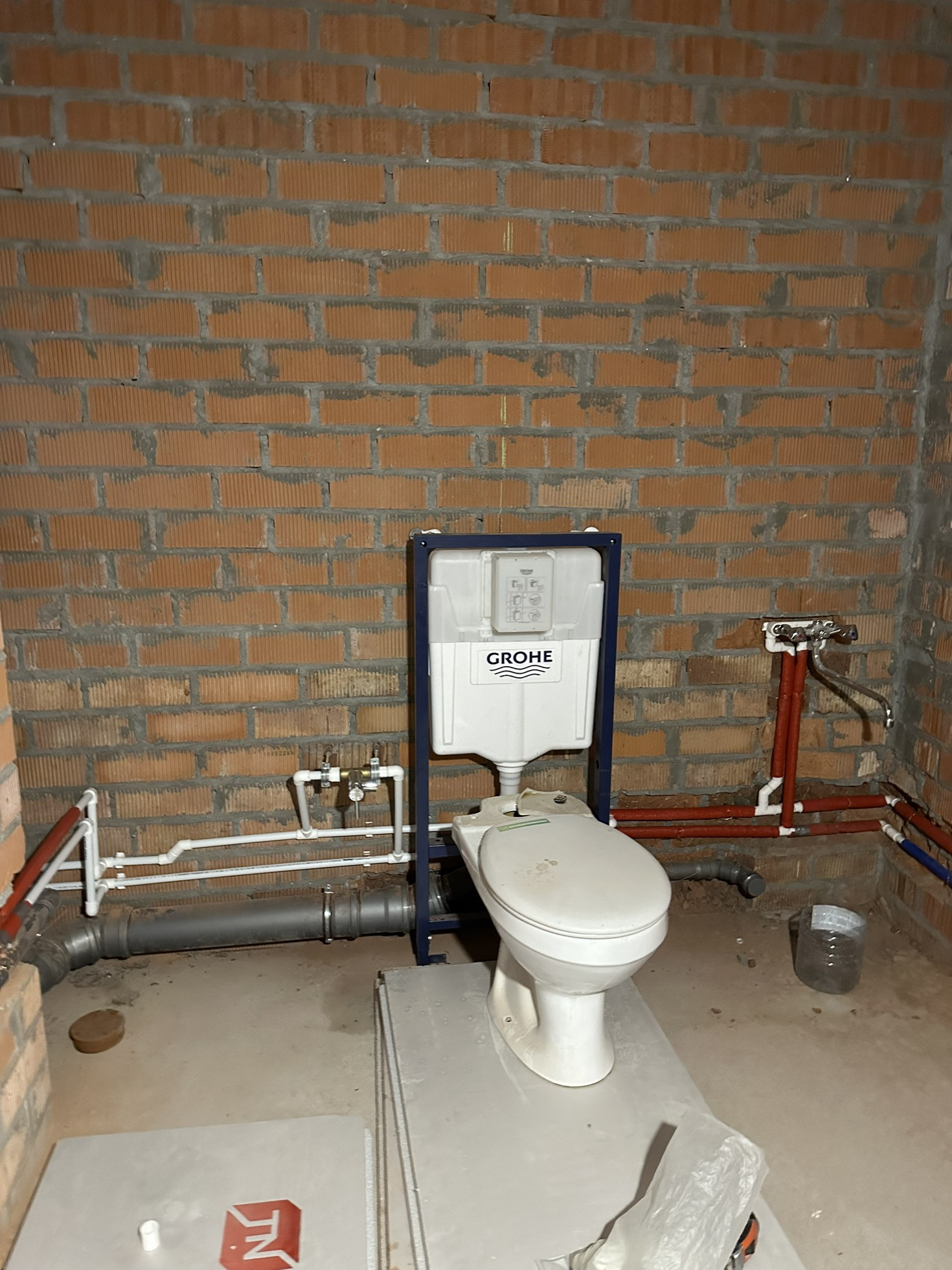 установлена инсталляция Grоhe, установлен гигиенический душ, сделана разводка водоснабжения в т.ч под водонагреватель, шумоизоляция канализационного стояка, предусмотрены шкафы для хранения.