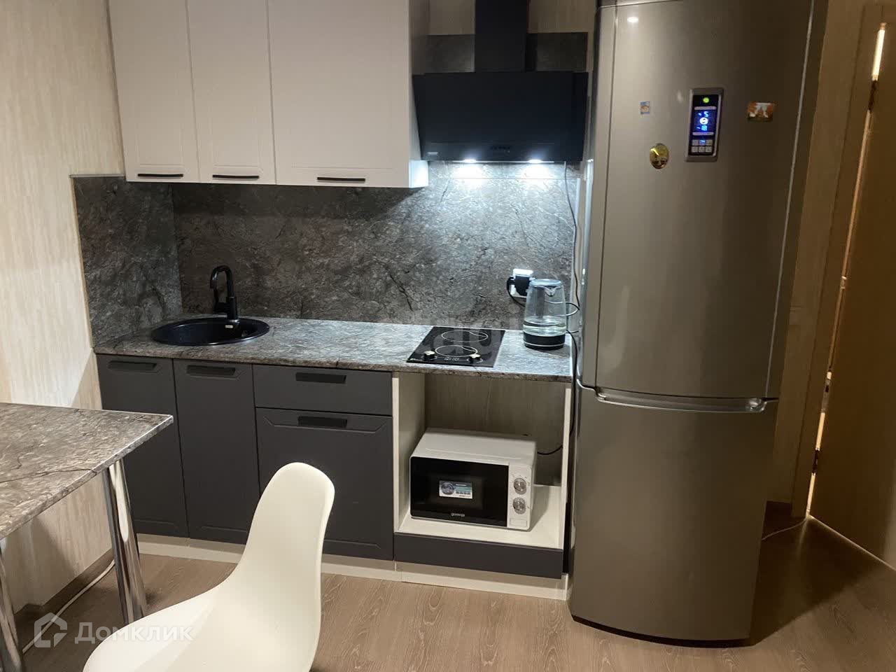 Новая мебель, холодильник, встроенные электрические конфорки, вытяжка, стиральная машина, микроволновка, чайник.